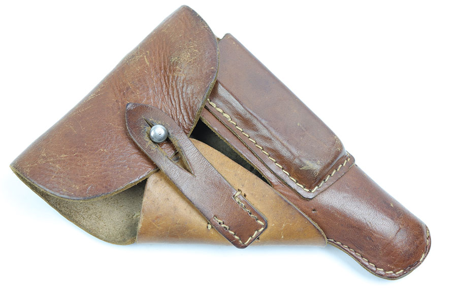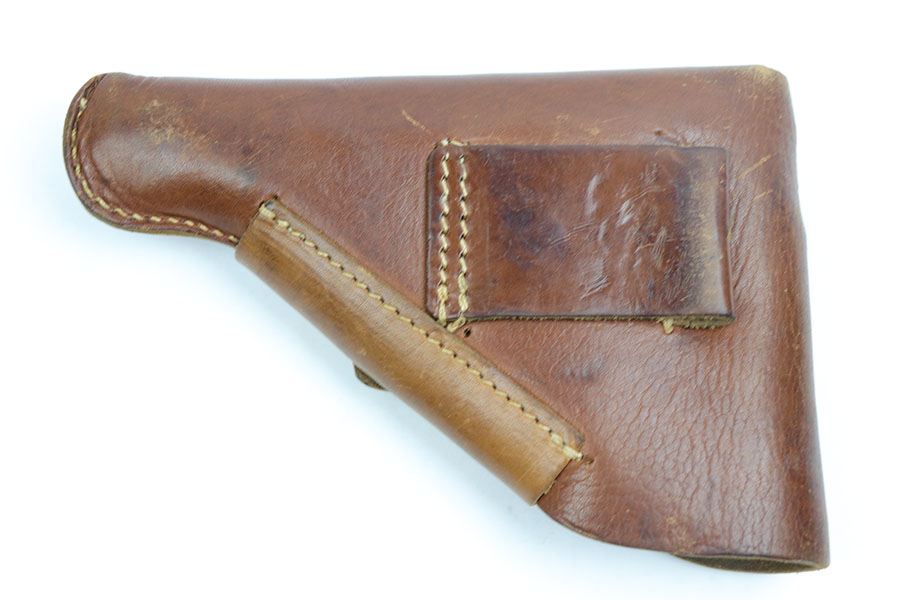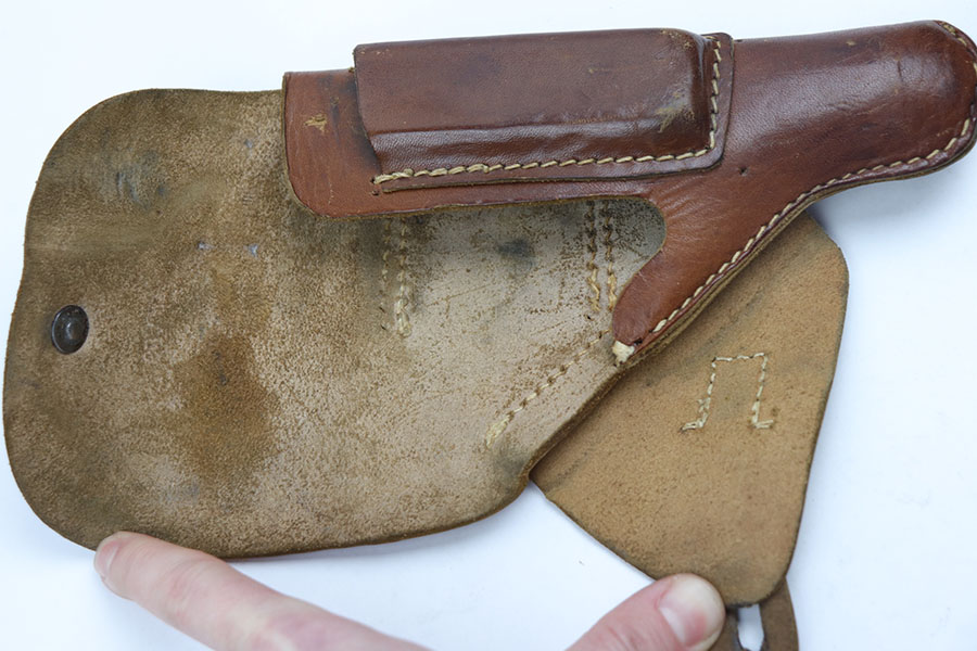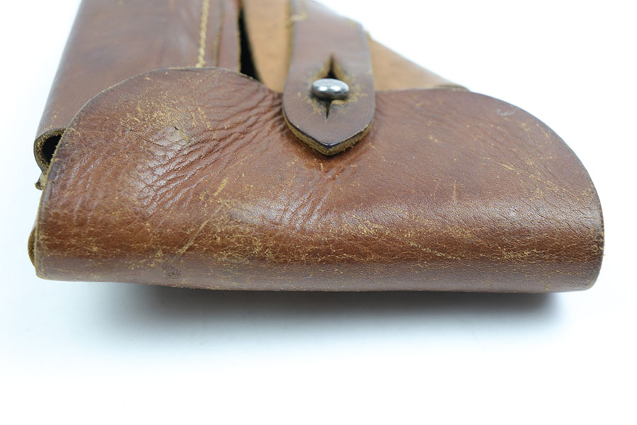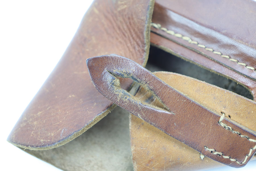 12/17/20 – This is a brown leather holster for a 7.65mm pistol such as a Walther PP or Mauser HSc. The holster has no markings or stamps but is aged and in a style similar to other WW2 axis pistol holsters. The closure hole looks modified, or larger than typical. The exterior leather has some light wrinkling and signs of use but no major damage. The stitching is all in tact and original.