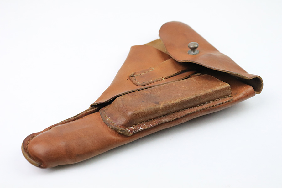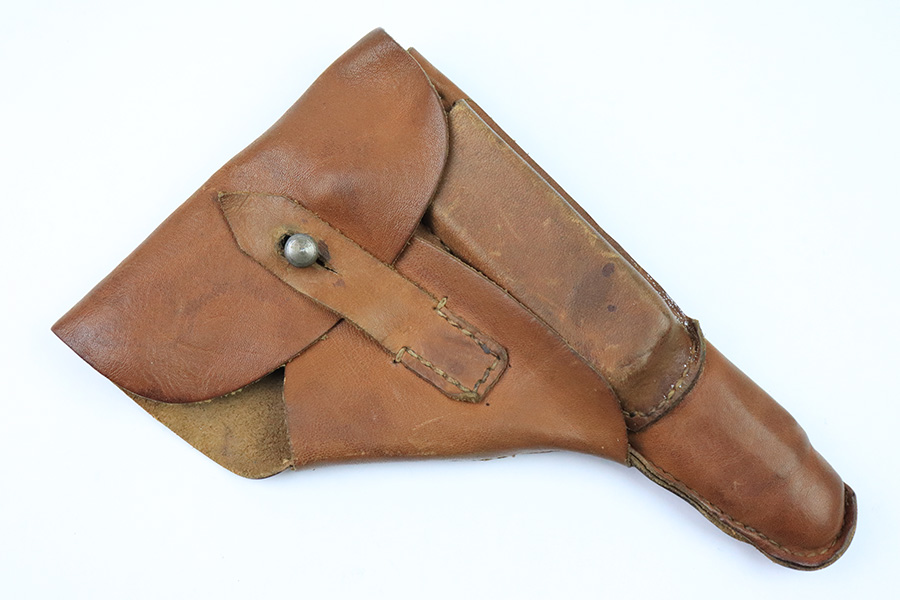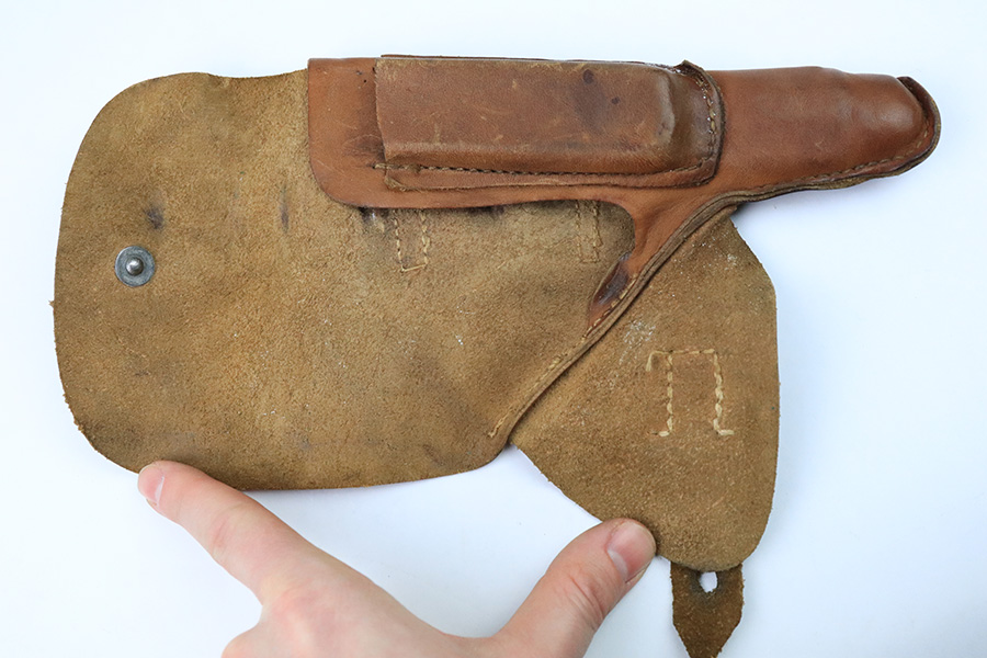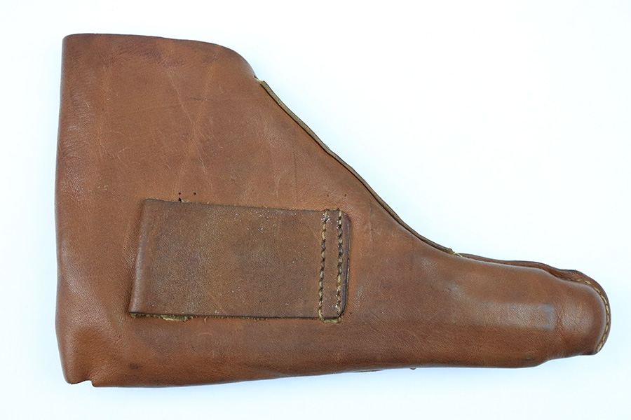 12/21/22 – This is an unmarked leather holster from WW2. The holster is made from thin, flimsy leather that was likely made during the end of WW2. The toe of the holster is somewhat extended, giving the holster a fairly unique look. We’re guessing this is for a FN model 1922 pistol, but the holster fits most 7.65mm Axis pistols as well. No notable stitching issues. All original leather and stitching.