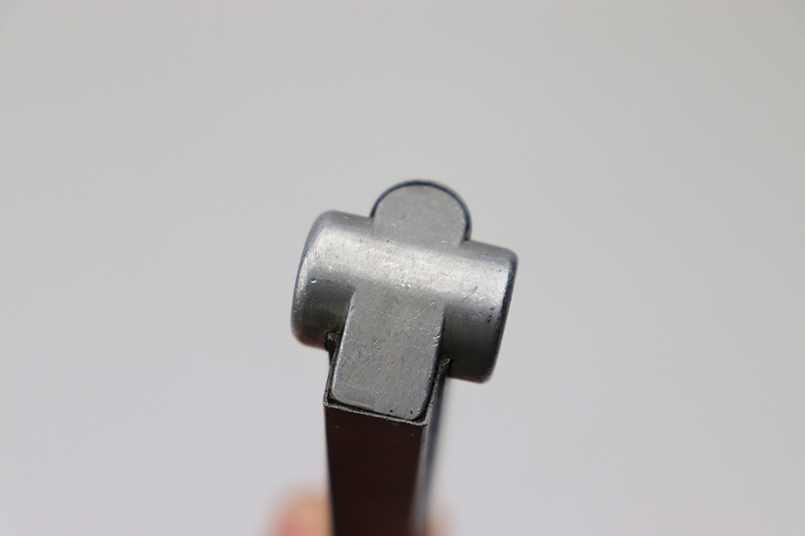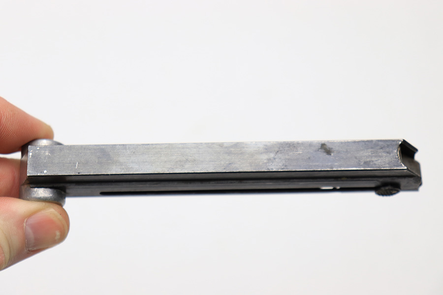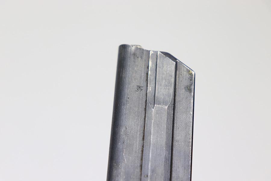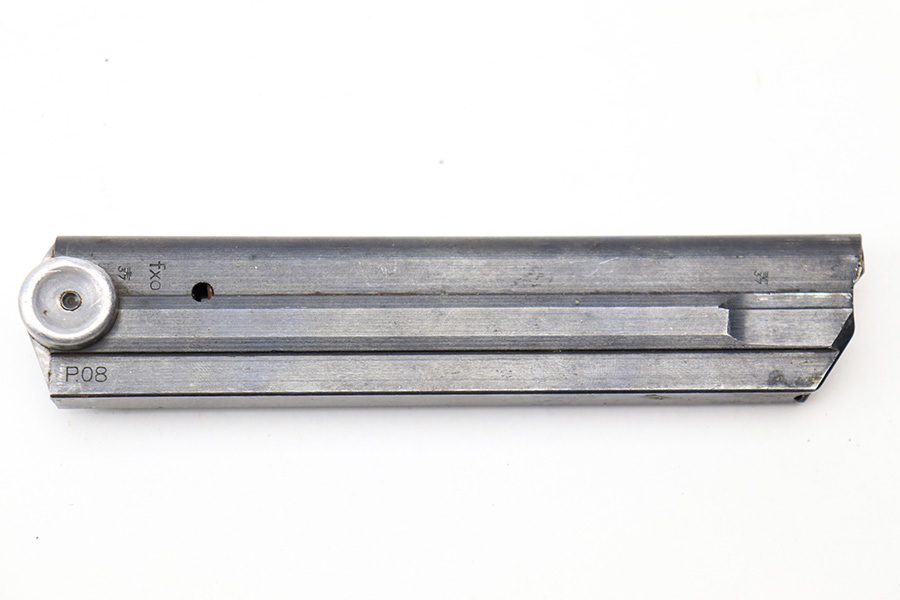 3/22/22 – This is an original WW2 production “FXO” luger magazine. The magazine has a blued tube and aluminum base. The base is blank, which is highly desirable as it technically matches any luger. There are no signs of grinding / alteration on the base. The tube has some mild finish thinning, but no rust, pitting, or discoloration of note. The spring is strong and fully functional.