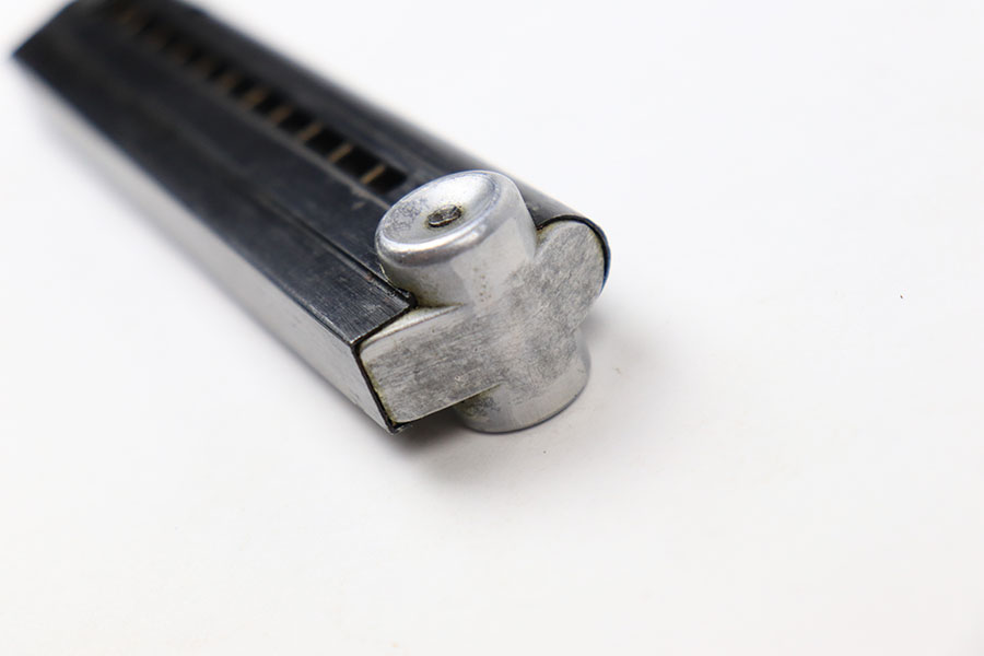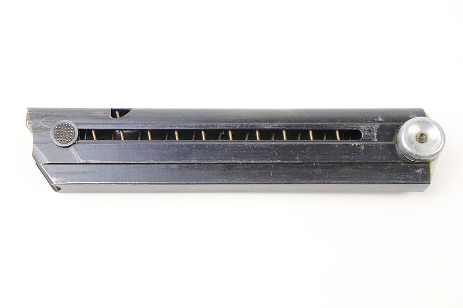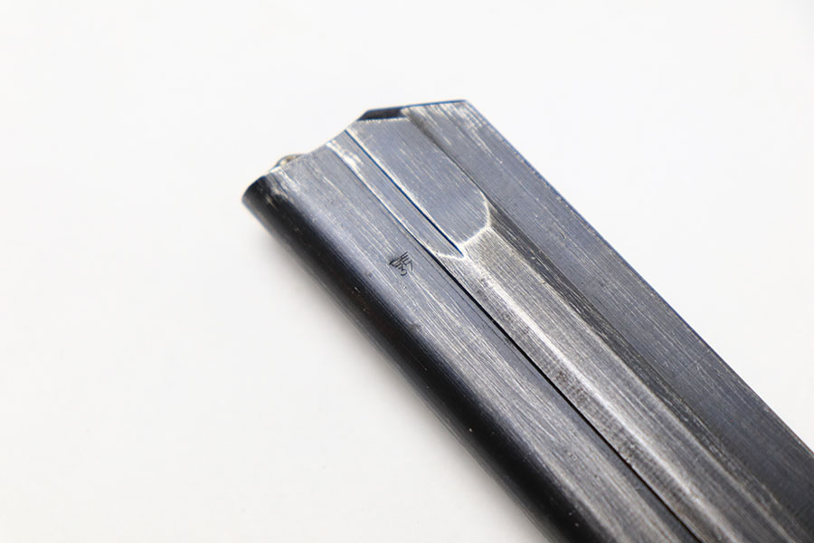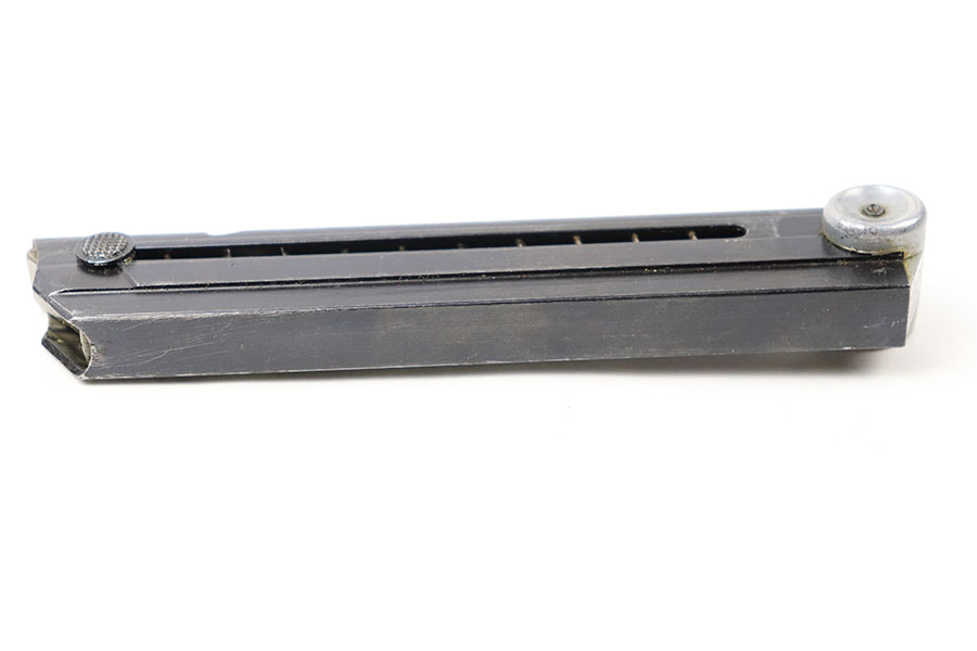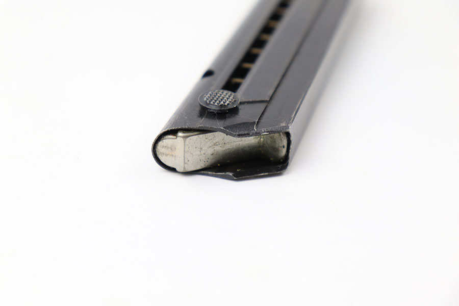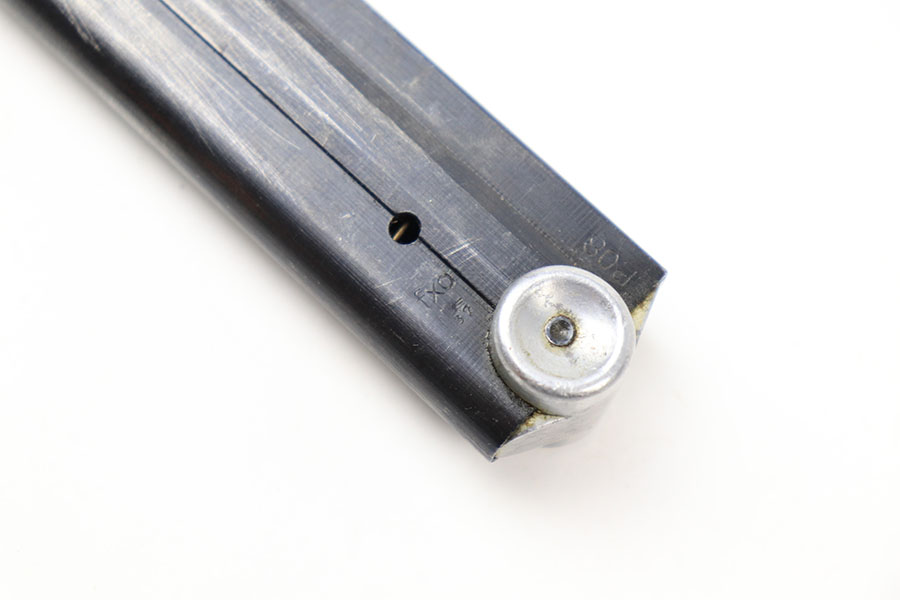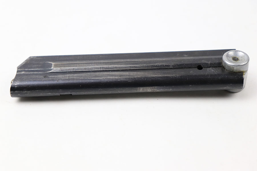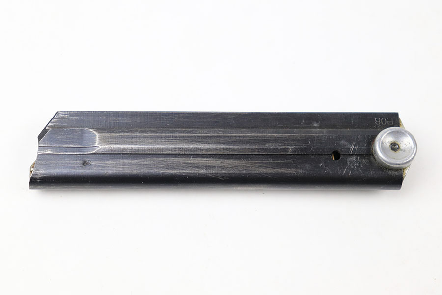 9/30/21 – This is an original Haenel (fxo) luger magazine from WW2. The magazine is desirable due to the lack of proofs or serial numbers on the base. The tube is eagle 37 proof stamped twice, as well as P.08 and fxo stamped, all on one side. The blued finish is in great shape throughout with some mild finish loss but no rust or pitting. Fully functional spring.
