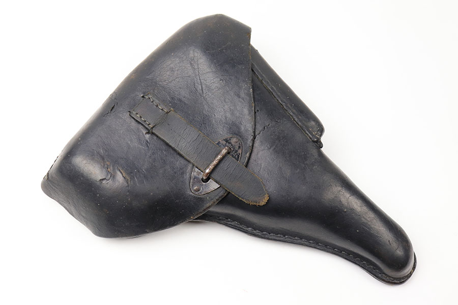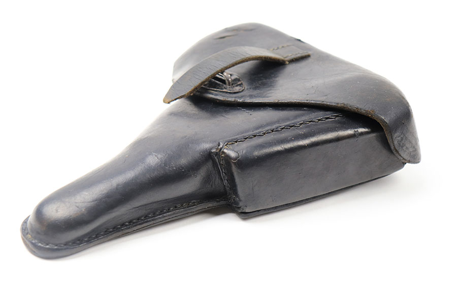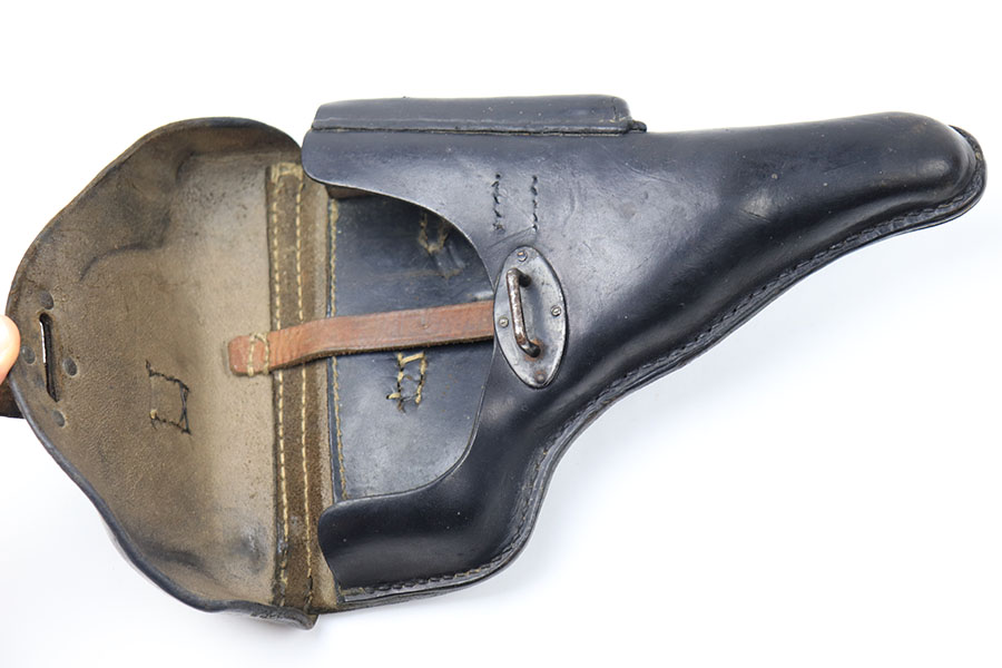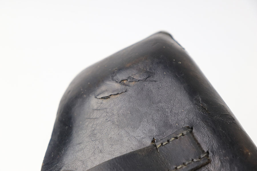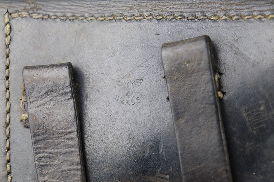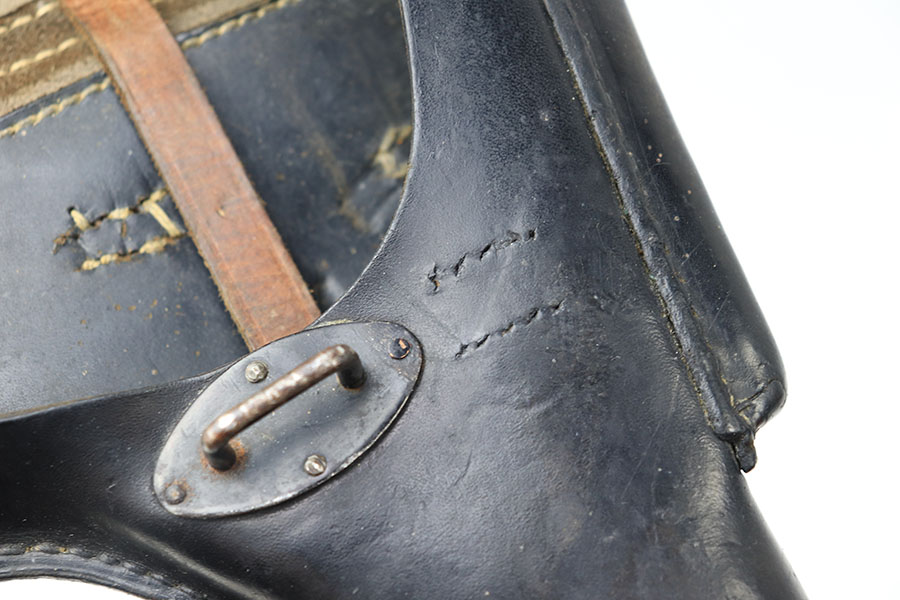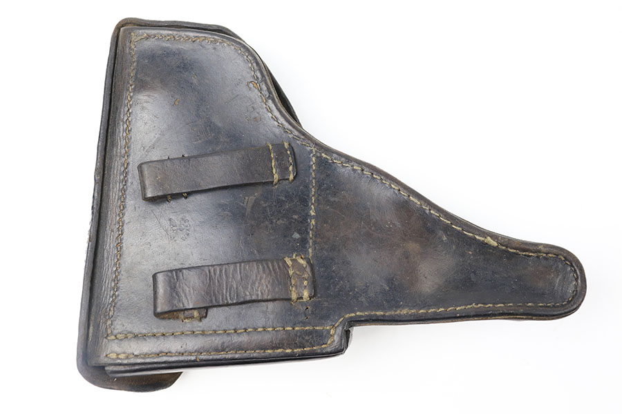 7/13/21 – This is an original WW2 era P.38 holster with unusual markings. The holster is unusual because there are no markings on the back leather except for a waffen proof stamp. The holster has nice black leather that’s in tact without any major issues. The lift strap appears to be re-stitched on the main body of leather. The price is reduced accordingly.