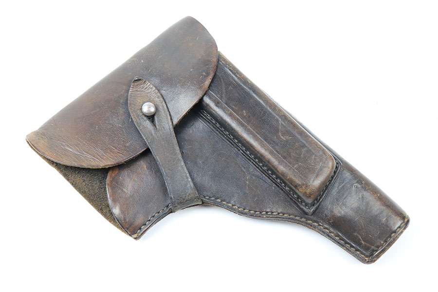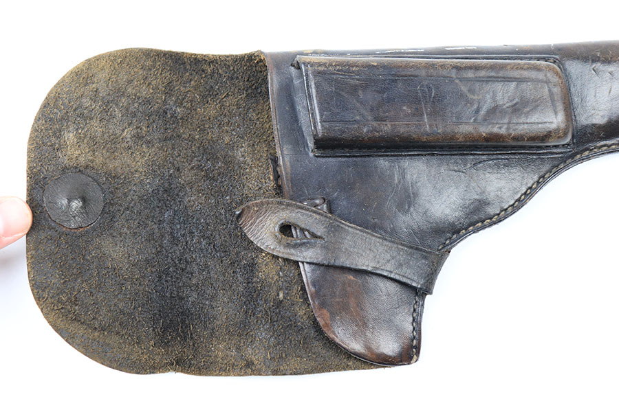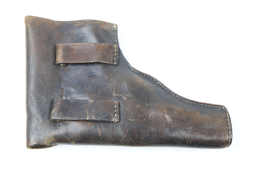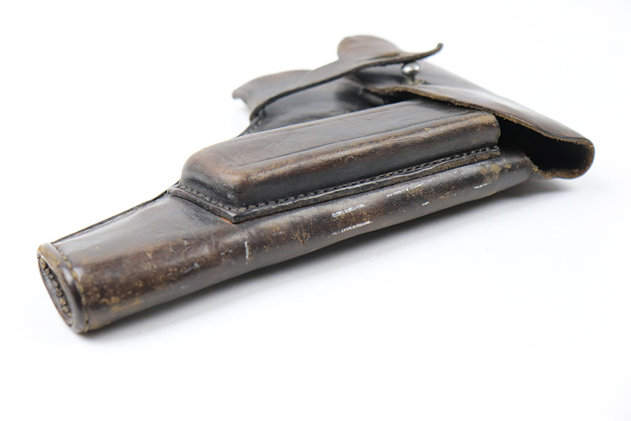 9/30/21 – This is an original WW2 era Radom holster for the model P.35. The holster doesn’t appear to have any markings or stamps, or at least none that we could find. The leather is soft and pliable but completely in tact. The stitching is all original and in tact as well. There’s some mild surface wear and a few small white scuffs on the rounded end of the holster but overall there are no major issues.
