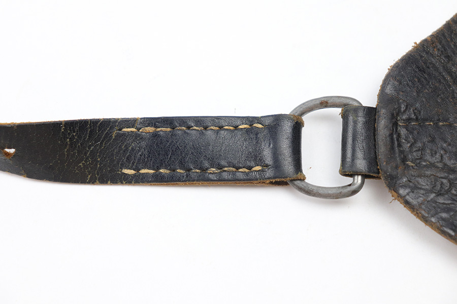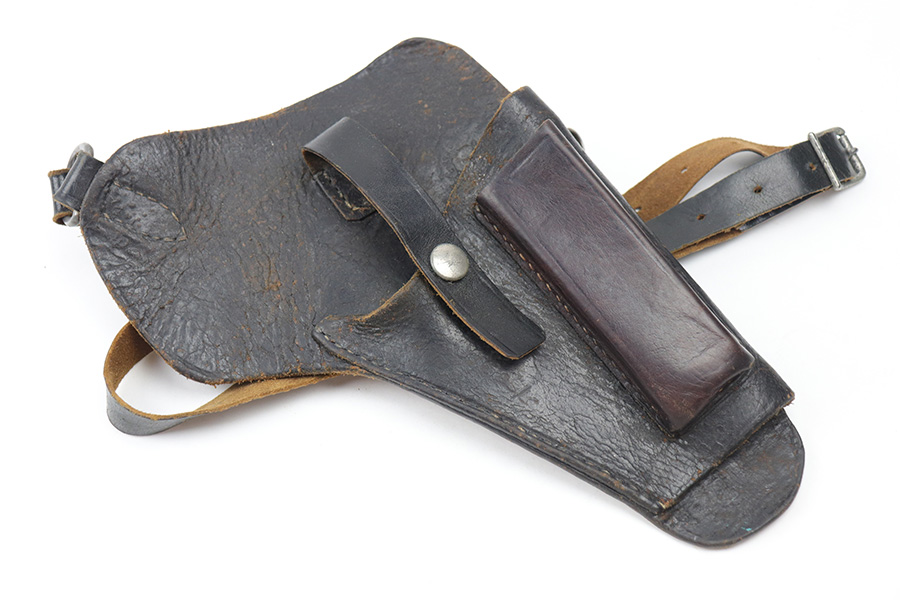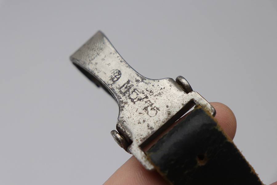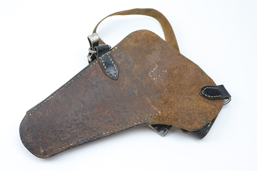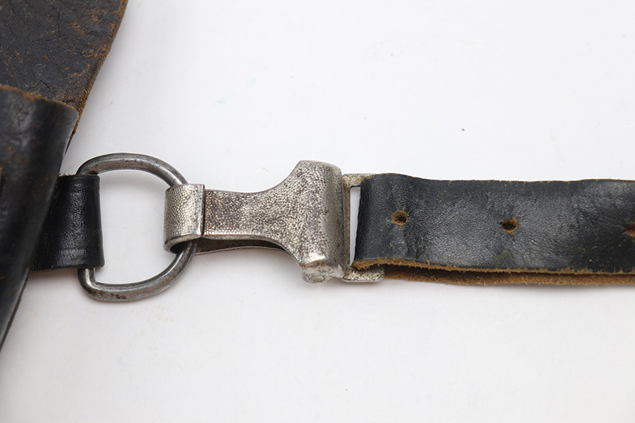 10/27/21 – This is an unmarked shoulder holster. The holster fits a High Power or P.38, as well as a 1911a1 from the Allies side. There are no markings or stamps on the holster leather, nor any on the leather shoulder strap. There is, however, a RZM M5/75 stamped on the metal clip of the shoulder strap. This suggests that this holster is for a P.38 or High Power. The stitching is all original and in tact. There is some surface wear, wrinkling, and signs of aging on the leather but no major issues.