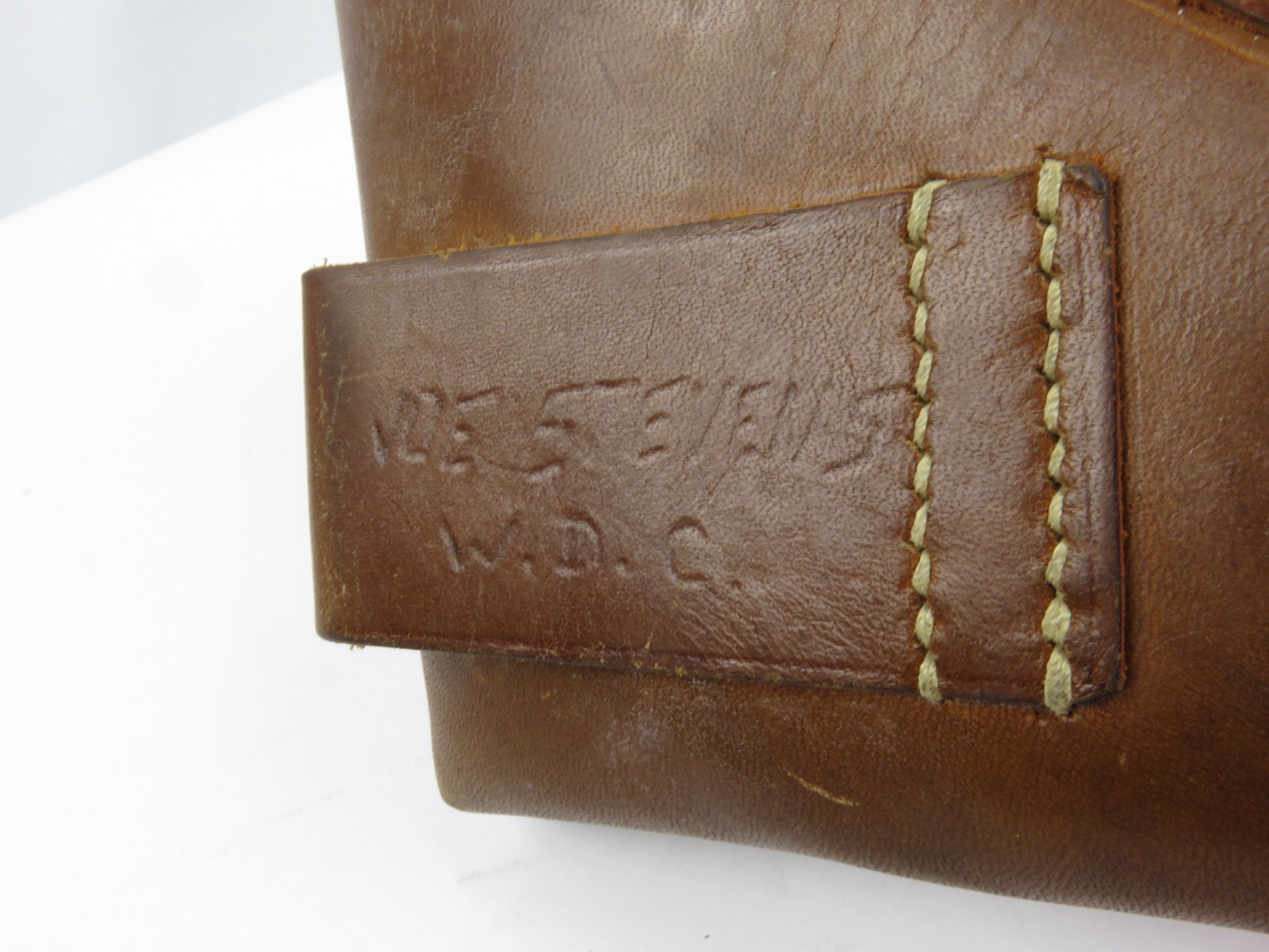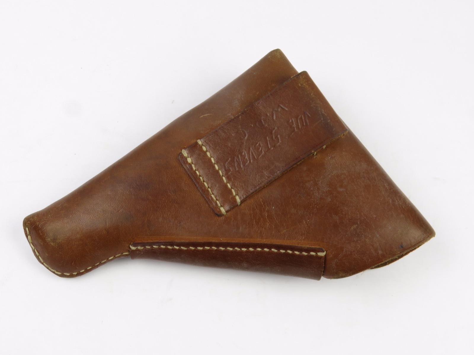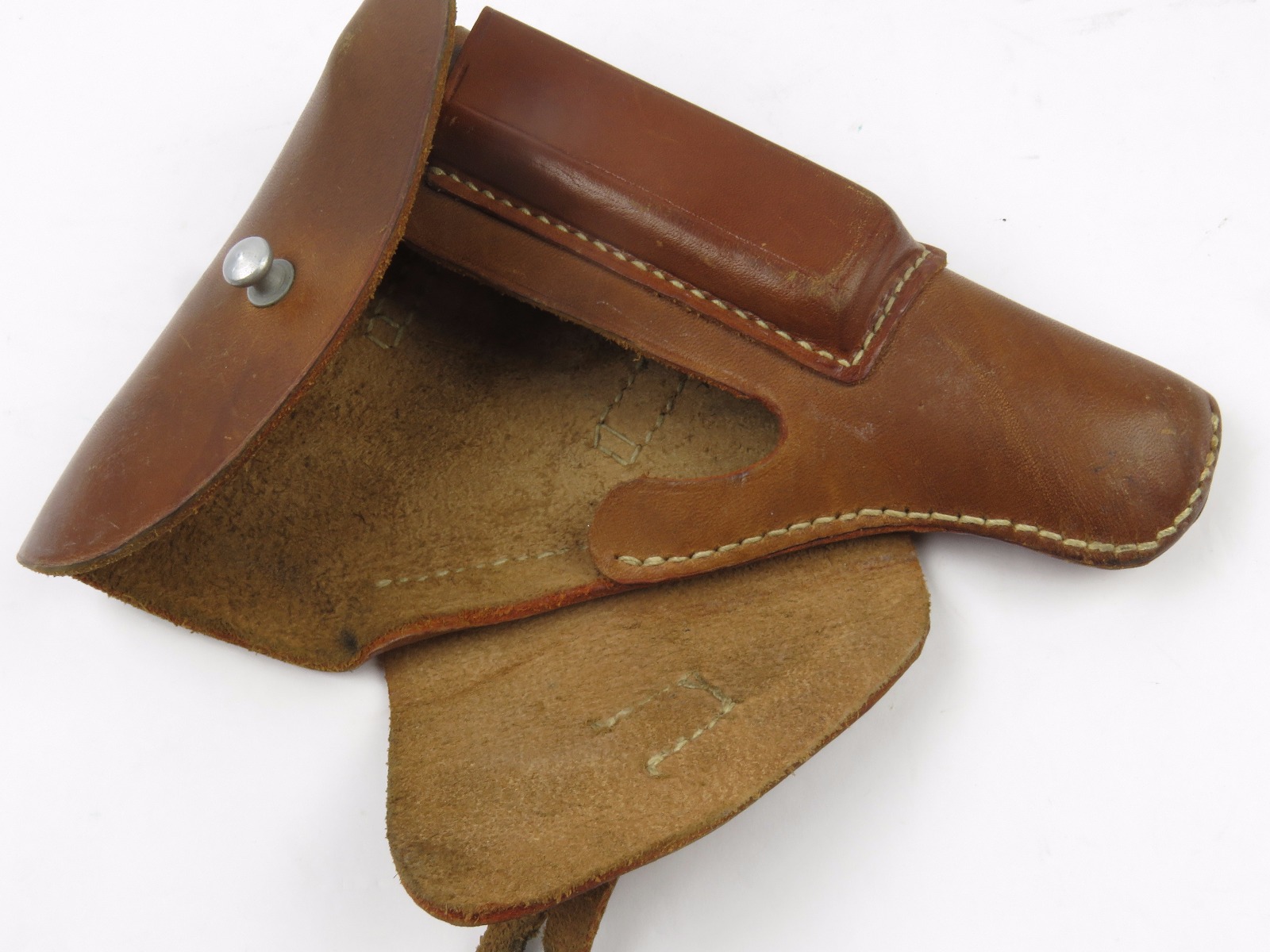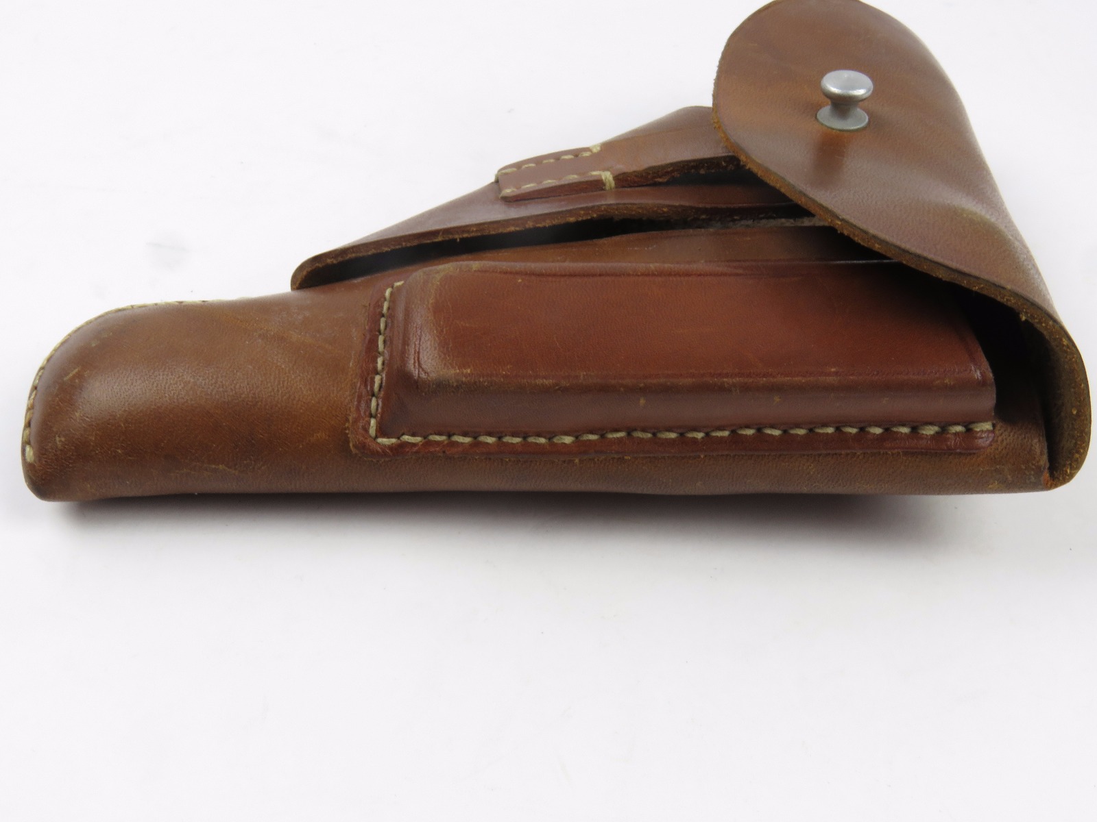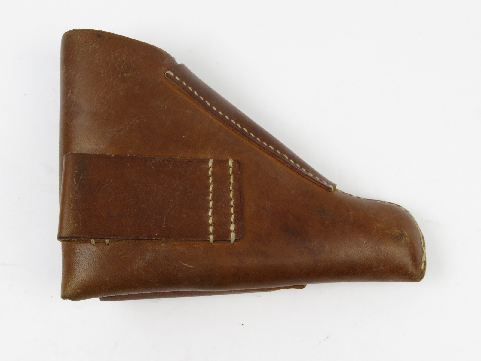 8/4/17 – This is a fairly generic, yet all original WW2 production holster. The holster is made and sized to fit almost any axis pistol in 7.65mm. Most notably, this holster fits a Walther PP, Mauser HSc, or Sauer 38h. The holster has no stamps or markings, but is all original and in tact. There are some slight signs of use and aging, but this is normal wear. The stitching is all original and in tact. The back belt loop has a nice lightly imprinted on the leather.
