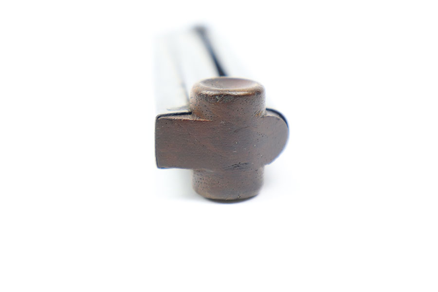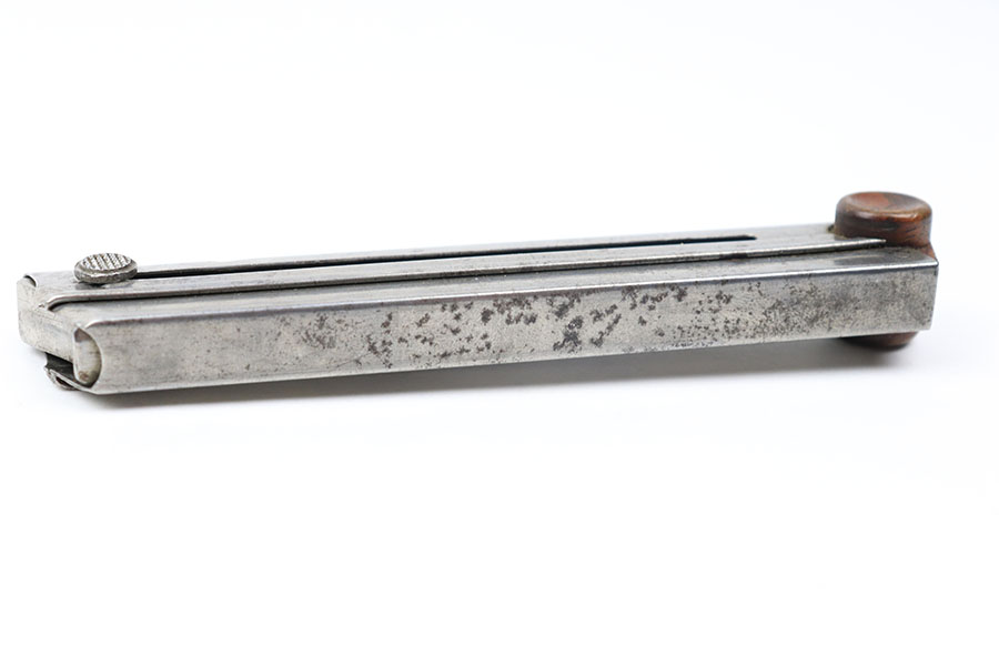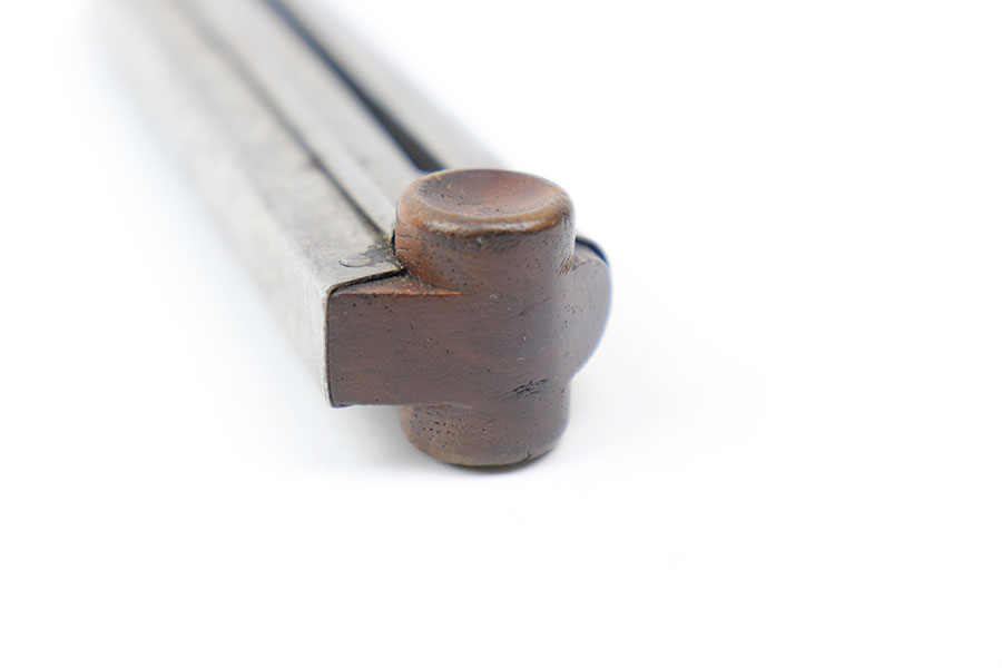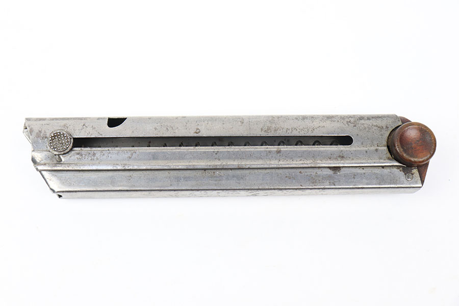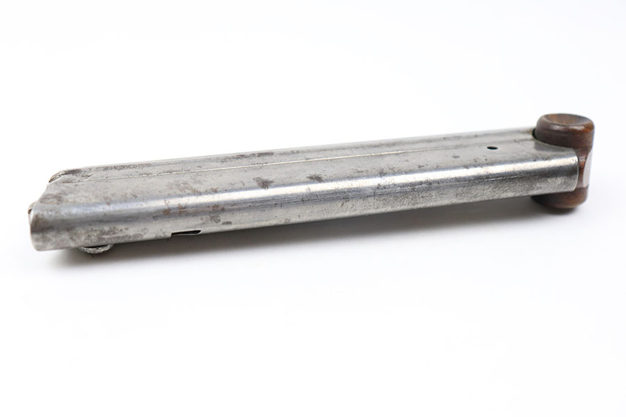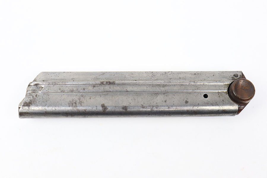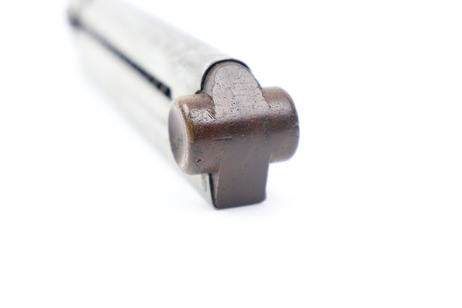 11/29/21 – This is a fairly scarce WW1 era luger magazine with a blank, unmarked wood base. The tube has some mild patina and surface wear throughout with no major rust or pitting. The spring is strong and fully functional. No notable chips in the base.