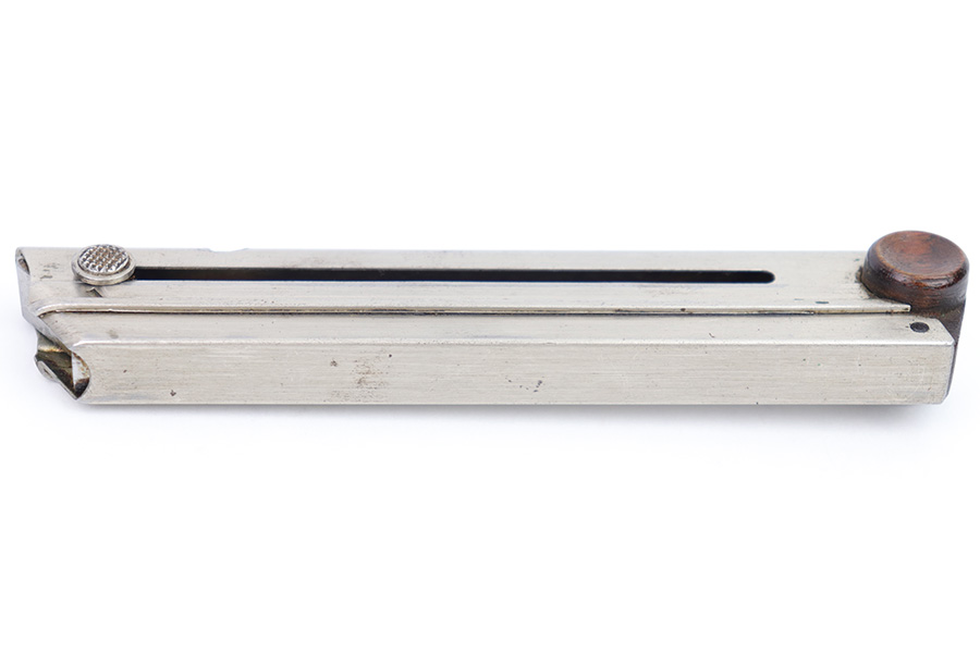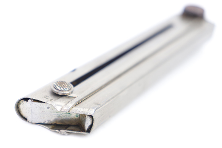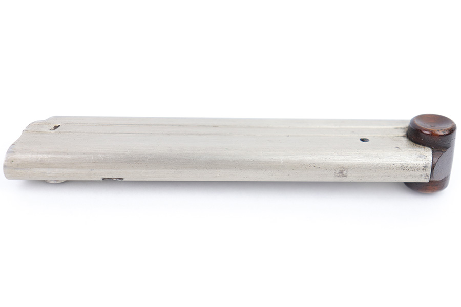 3/7/23 – This is an excellent condition and highly desirable variation WW1 Luger magazine. The magazine features an unmarked wood base that shows no signs of alteration or tampering. No cracks or chips as well. The nickel tube shows correct surface patina and mild aging but has no notable flaws, nor any rust or pitting. The spring is strong and fully functional.