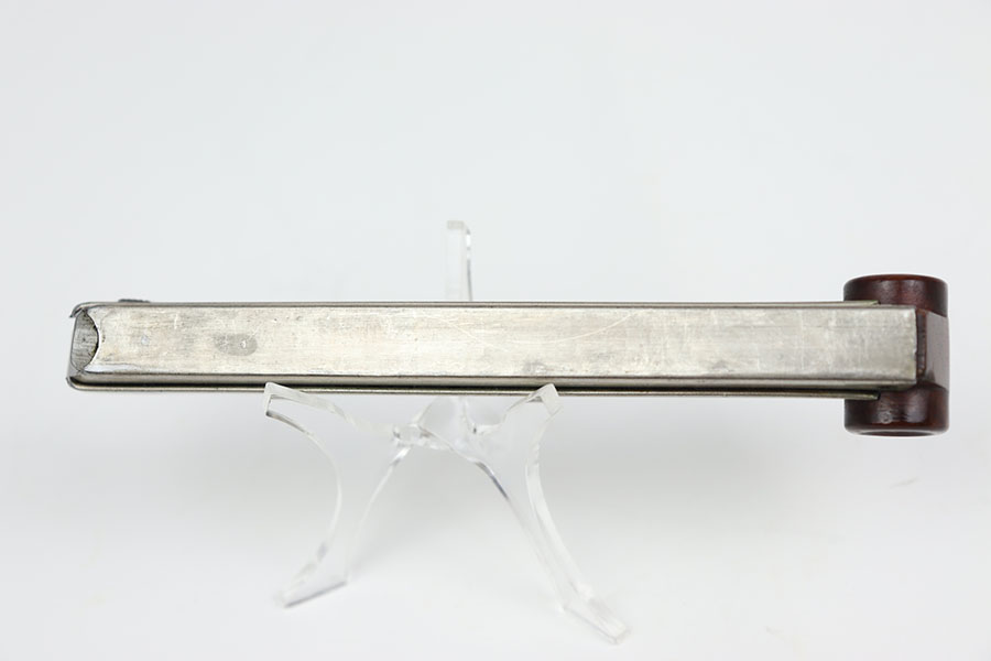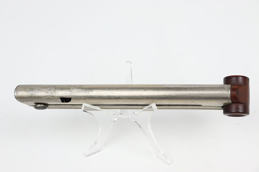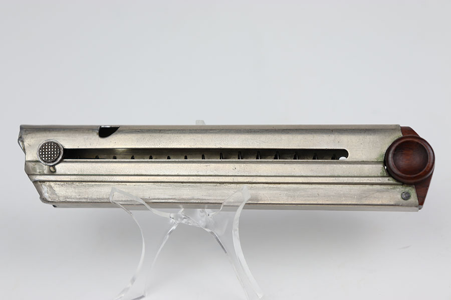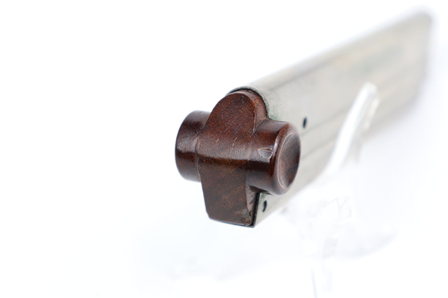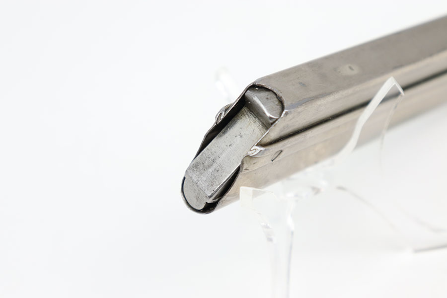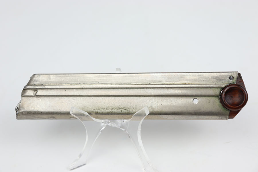 9/1/24 – This is an excellent condition and highly desirable variation WW1 Luger magazine. The magazine features an unmarked wood base that shows no signs of alteration or tampering. No cracks or chips as well. The nickel tube shows very little wear with some on the top of the front edge but there is no rust or pitting. There are some minor spots of green patina to the nickel finish as seen in the photos. The spring is strong and fully functional.