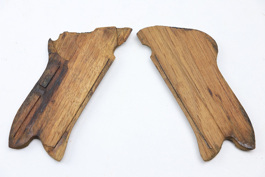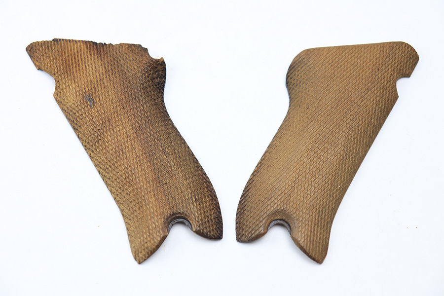 1/19/22 – This is a nice pair of WW2 production luger grips. The grips have no interior markings or stamps, making them a great replacement pair. The grips both have light brown color and are in great condition. The left panel has some very minor chips along the top as shown in photos. No screws included.
