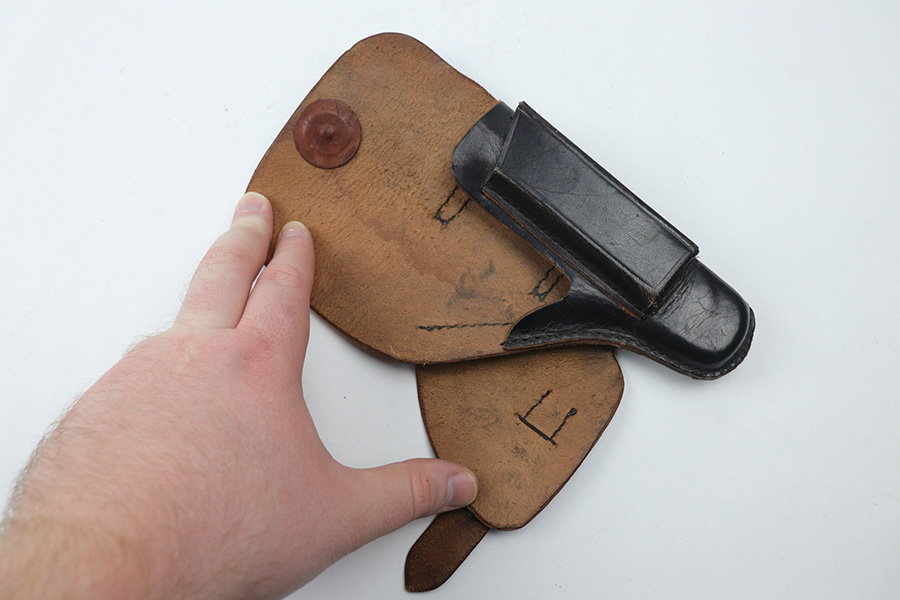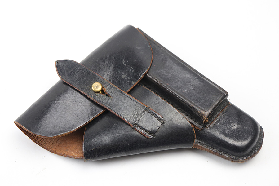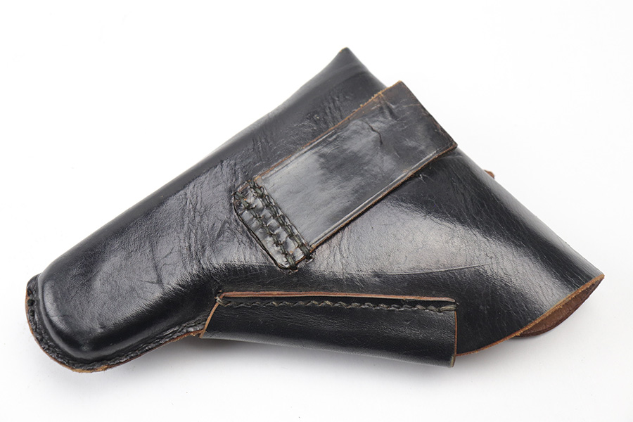 11/2/21 – This is an unmarked holster for a WW2 Axis pistol such as the HSC, 38h, or Walther PPK. Also fits a CZ-27 or most other 7.65mm pistols. The black leather and stitching are original and in great condition. Fairly clean leather overall. Brass closure knob. No major markings or notable flaws.