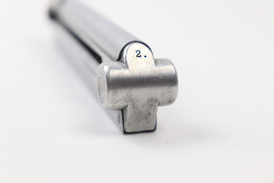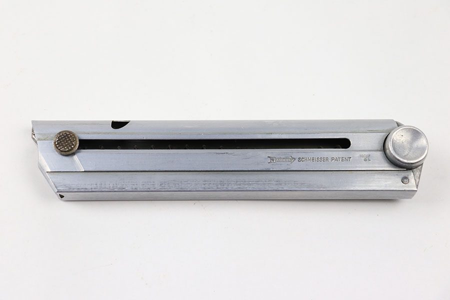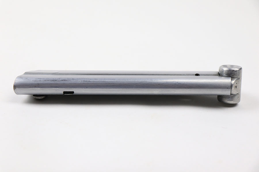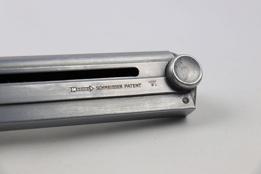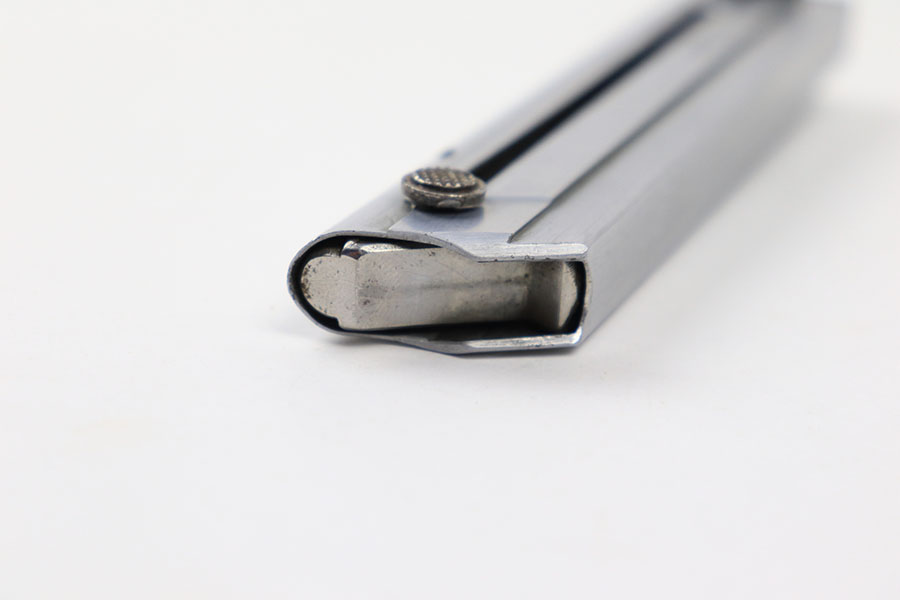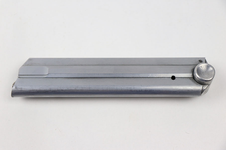 7/14/21 – This is an excellent, minty condition and desirable Police Luger magazine from WW2. The magazine has a clean tube with Haenel maker stamp and police Eagle/L police stamp. The aluminum base is excellent as well and doesn’t have a serial number. The only stamp on the base is a “2” indicating this as a spare magazine. Strong, fully functional spring.
