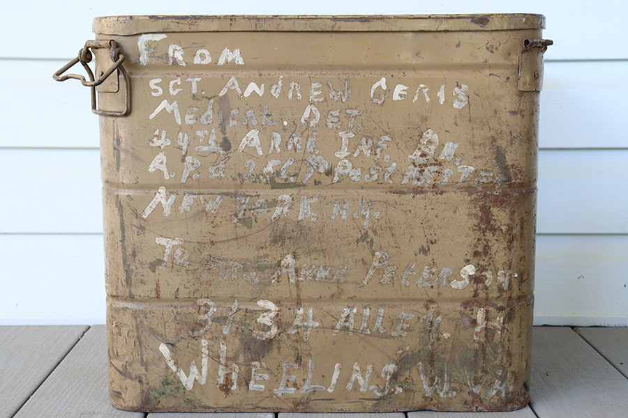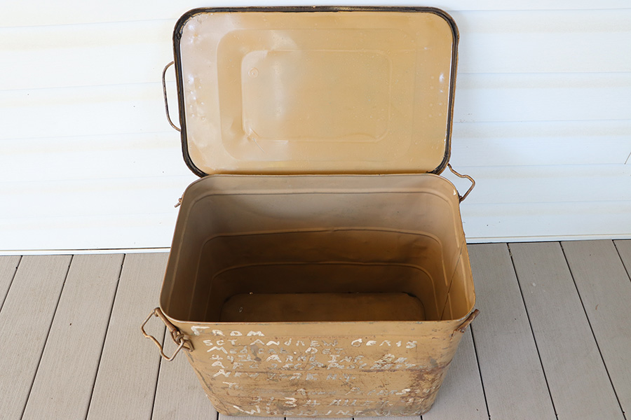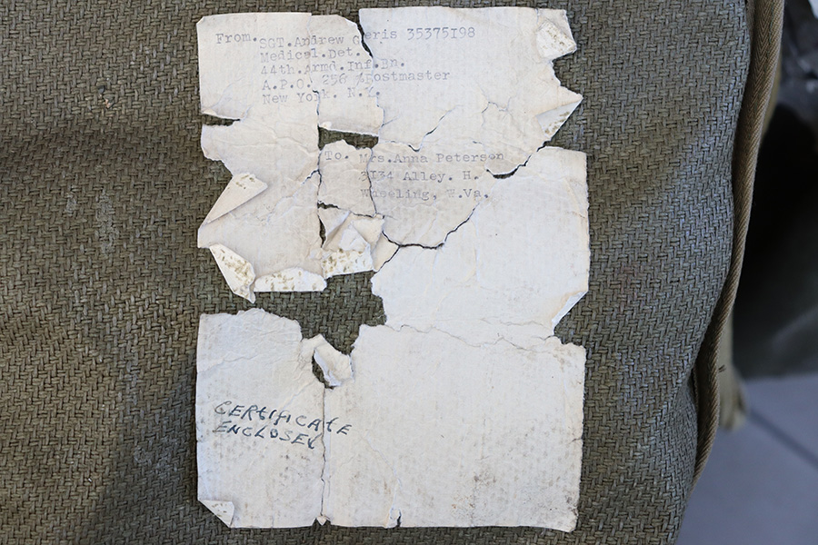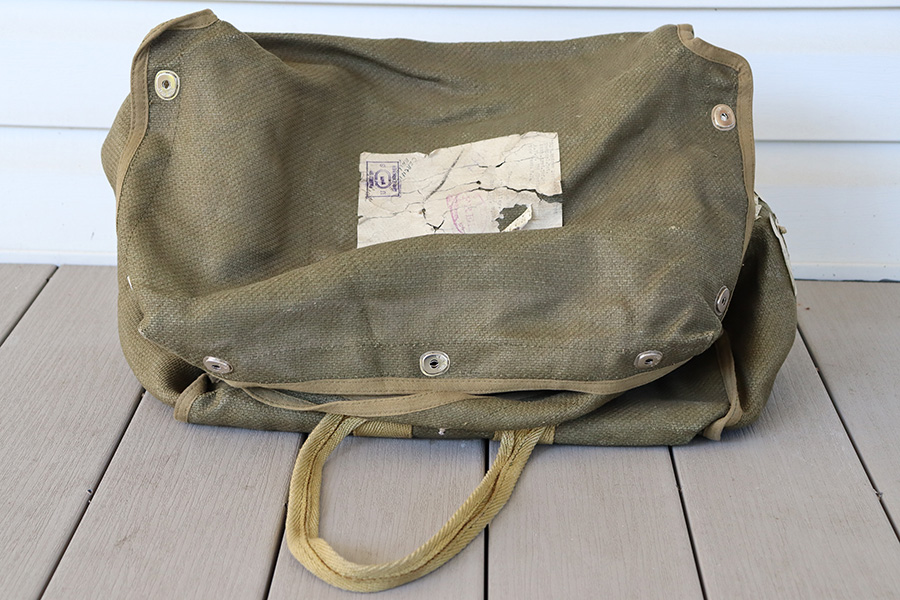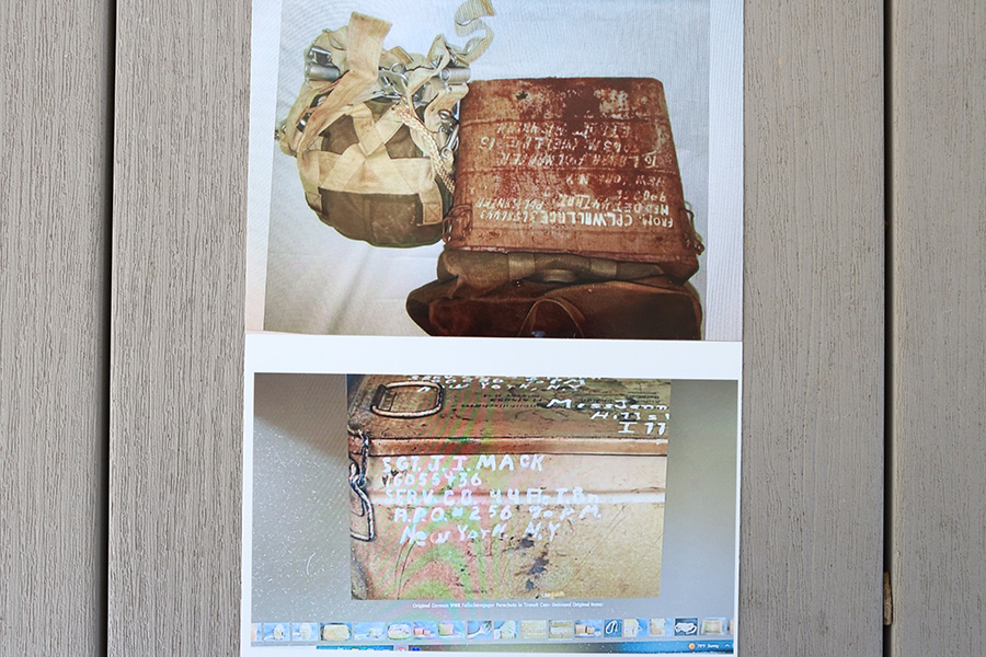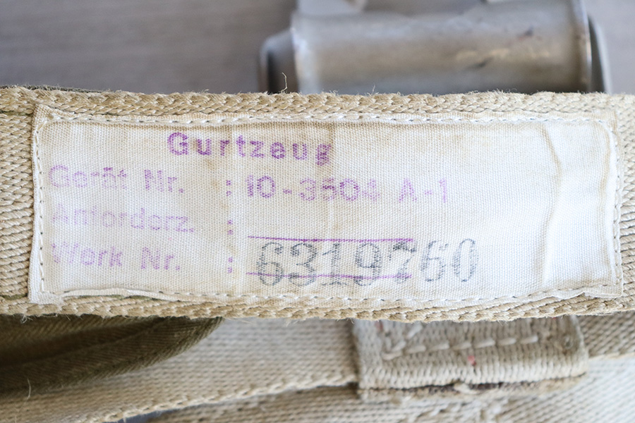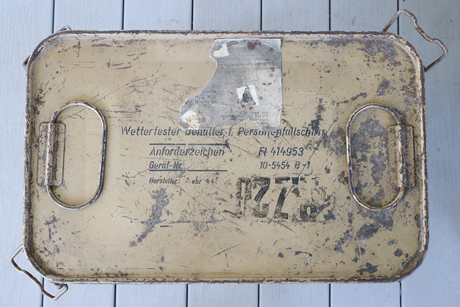 9/8/23 – As featured on our YouTube channel (video link: https://youtu.be/6Jq6kUCwxE8?si=m35MB-_kLomextVY). This is an original WW2 German RZ-20 Parachute in excellent condition, unopened and un-deployed. The parachute comes in the original canvas carry case, which has address labels from the GI who sent this home. Also included is an original metal shipping / transit case, which again has the capturing GI’s address and information written in white on the exterior. One of the 4 clamps on the top lid is broken, and there’s natural aging and patina throughout the exterior shell, but overall these elements are all in great-to-excellent condition. The rubber sealing gasket of the lid is still intact, helping to keep the interior contents dry and very well preserved for 8 decades. The top of the transit container reads, “Wetterfester Behalterf Personenfallschrim / Anfordererzeichen Fl 414953 / Great-Nr 10-5454 B-1 / Hersteller: ebr 44 / RZ20”. Additional documentation is included depicting the efforts of the 44th Armored Infantry Battalion, and a photo of a similar documented example.