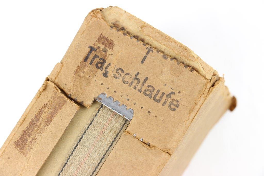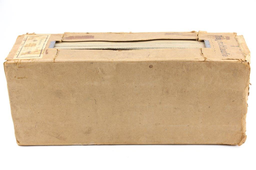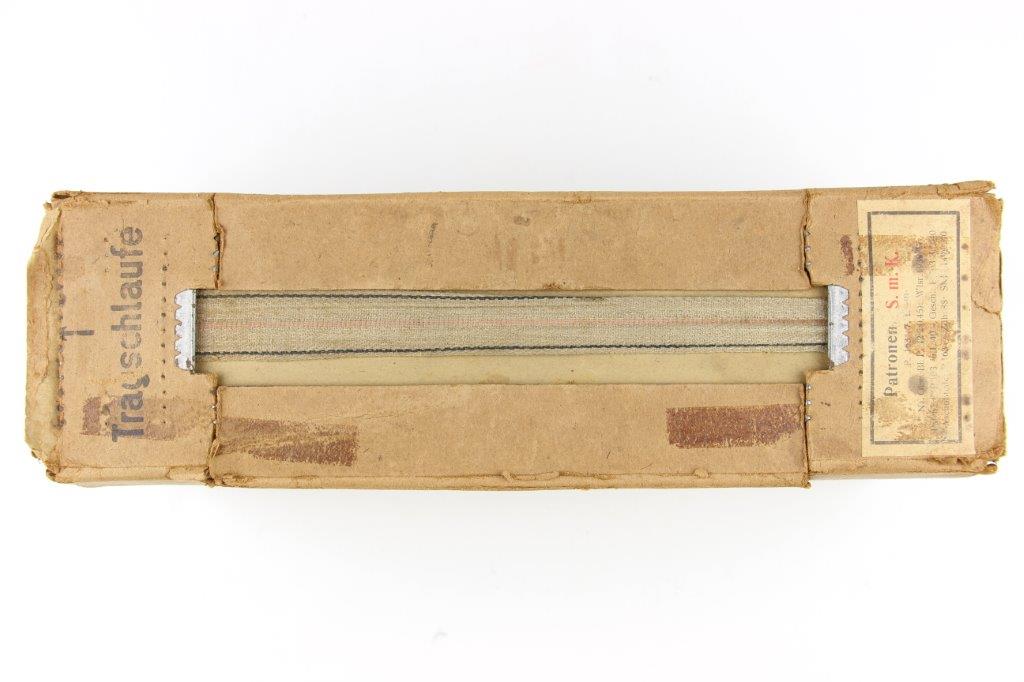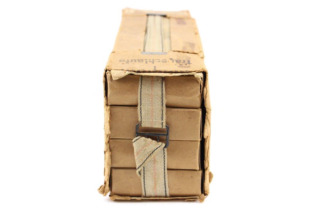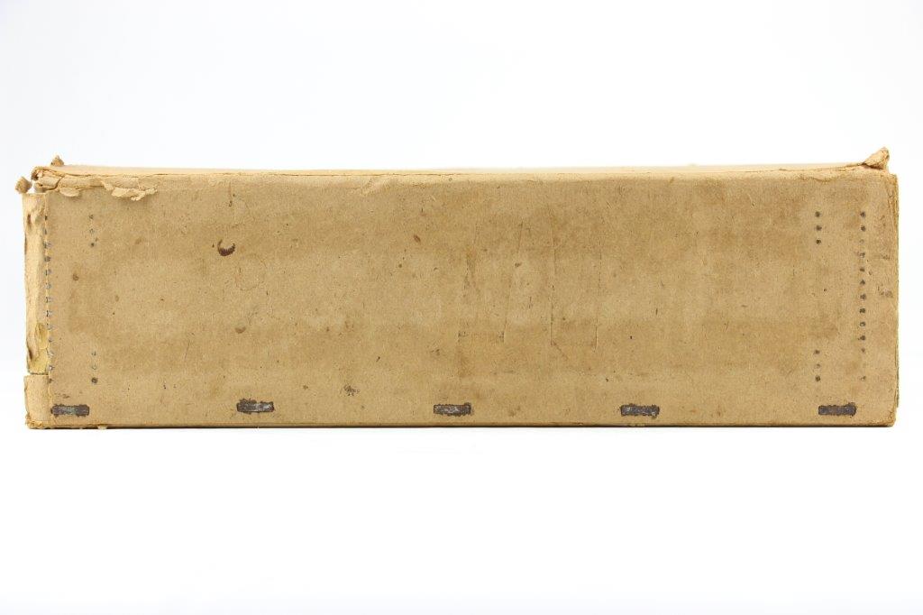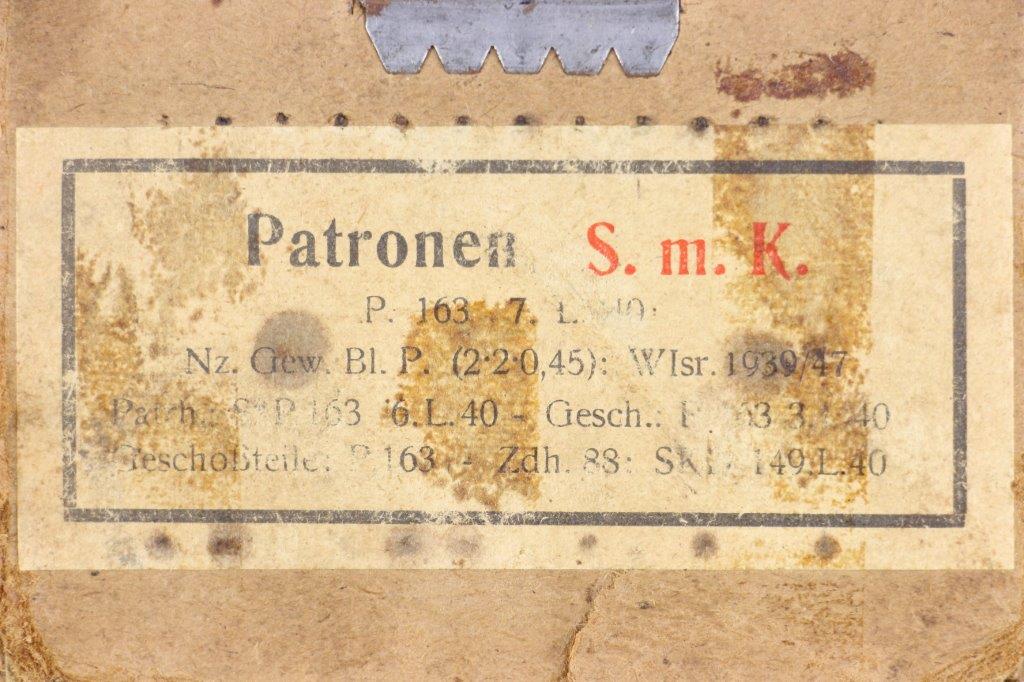2/15/24 – This is an original, complete WW2 German Battle Pack of ammunition. The pack is unopened and still sealed with the original cloth carry handle / wrap. The original labels are still intact as well. The label date indicates 1939-1940. The pack consists of 20 original boxes. 300 rounds total. Each box is sealed with an original label on one side. The pack exterior shows some wear and aging, with some tattering along the top and edges of the box. Great overall condition.