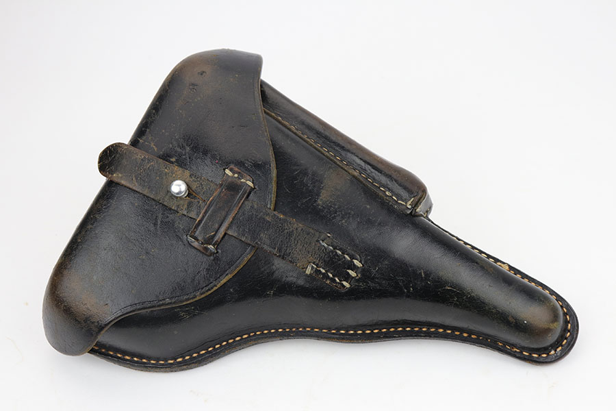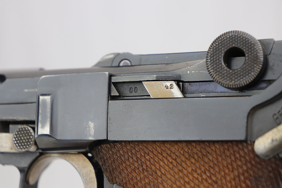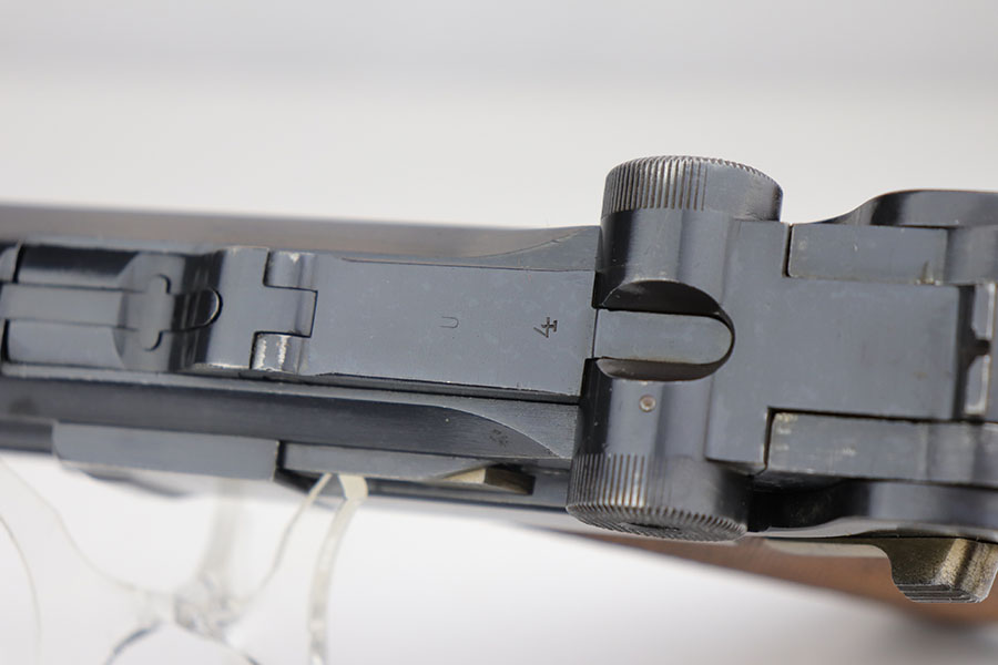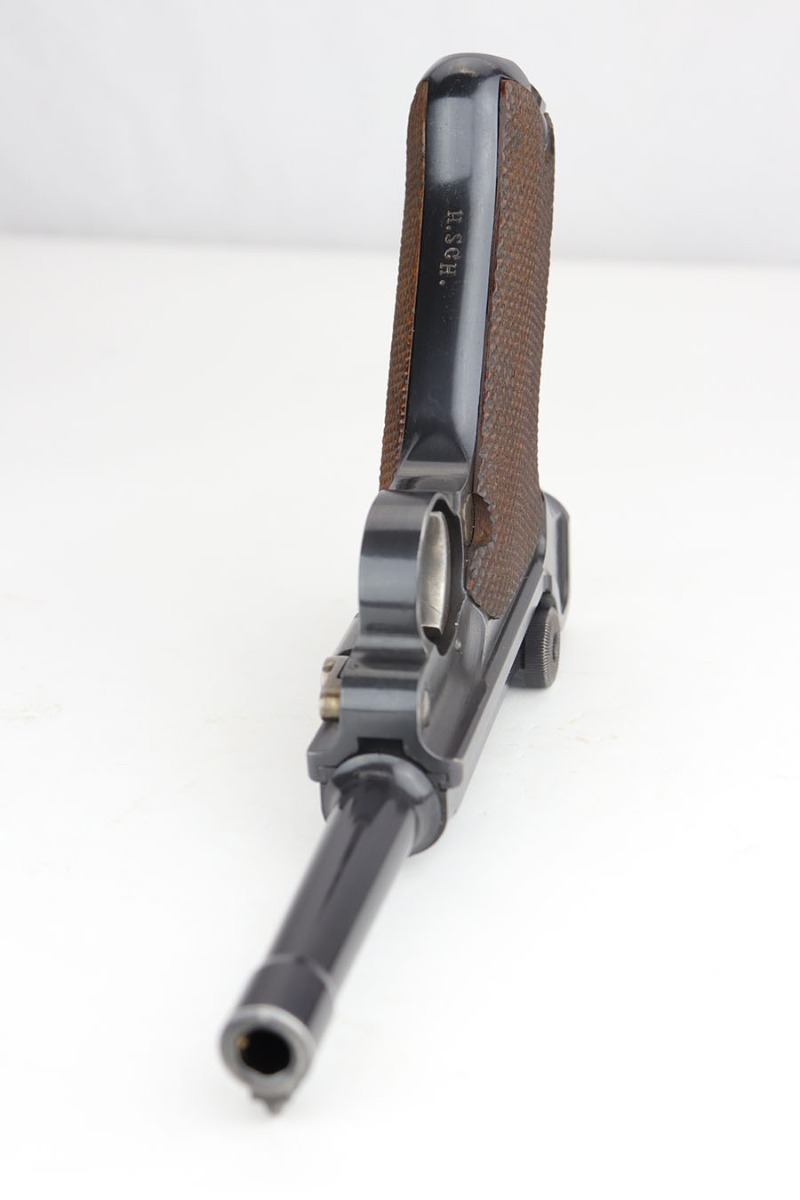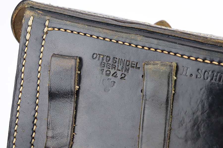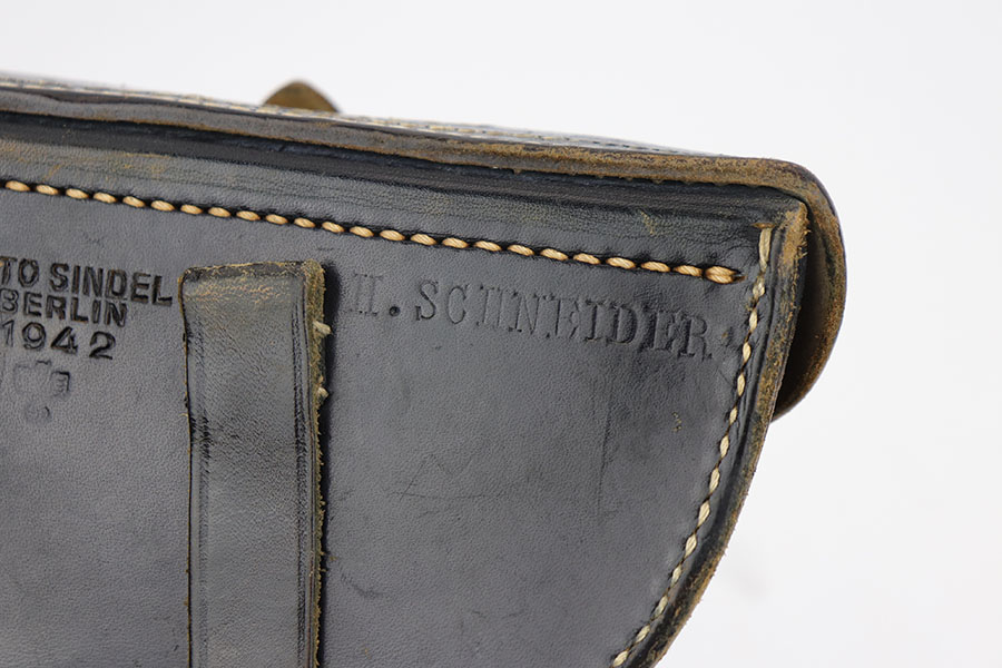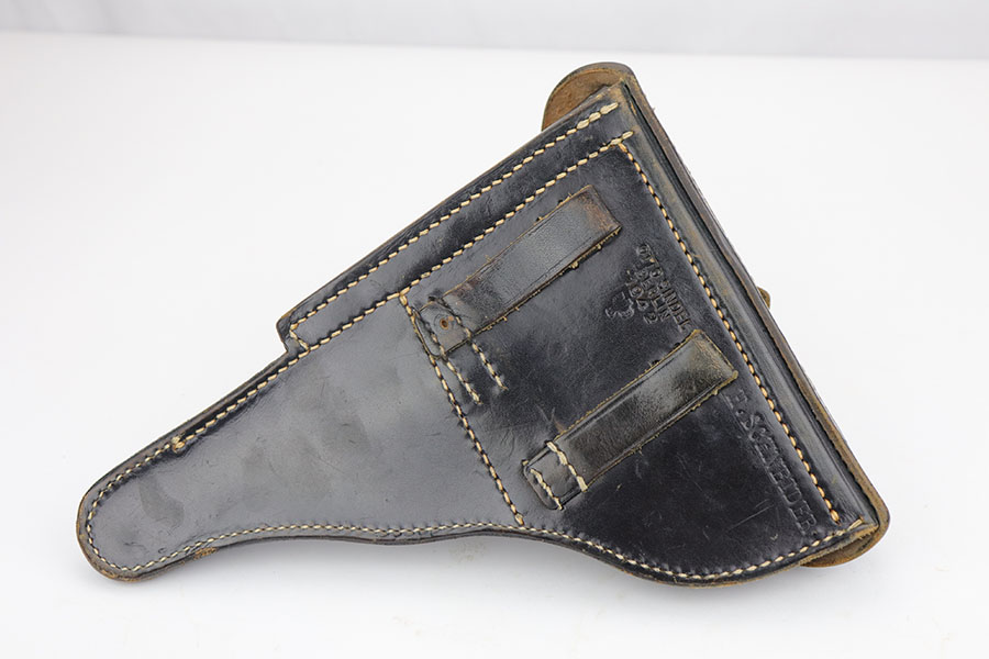 9/26/19 – This is a very unusual Luger and holster rig to say the least. We’re calling this a “War Trophy” because it was put together at the factory most likely at the end of the war. It has no factory logo, factory code, proof marks or serial number. That could not happen unless it was stolen by an employee, or picked up by a GI at war’s end. (and a factory theft would NOT put his name on the gun!) The safety bar and sear bar are numbered “42” and “00” respectively no doubt re-cycled parts left in the factory. Interestingly, the front strap has the initials H. SCH. stamped into the metal. Similarly, found on the back of the holster is the name “H. SCHNEIDER”. A quick search finds an American civilian investigator, Henry Schneider, was employed by the US Army to look into the possibility that Ford and GM “collaborated” with the Nazi’s before the US got into the war. He was in Germany in Sept of 1945 and issued a report. It is feasible that such a high level investigator would have access to such a souvenir should he want one, AND have the means to have a factory worker imprint his name on the holster and gun. The gun is in about 96% condition with some light edge wear and very minor strap wear. The biggest areas for wear are the straw parts. No rust or pitting and a minty bore. No maker stamps or proofs on the gun or magazine. Grips are unmarked, and the holster is an original 1942 police luger holster. Also, at this point we have no way of PROVING the actual identity of H. Schneider.