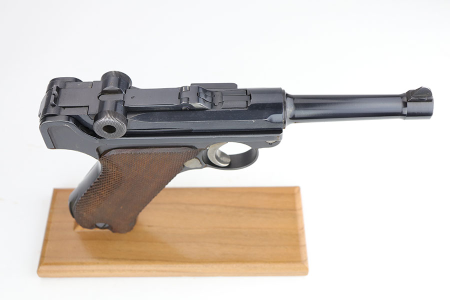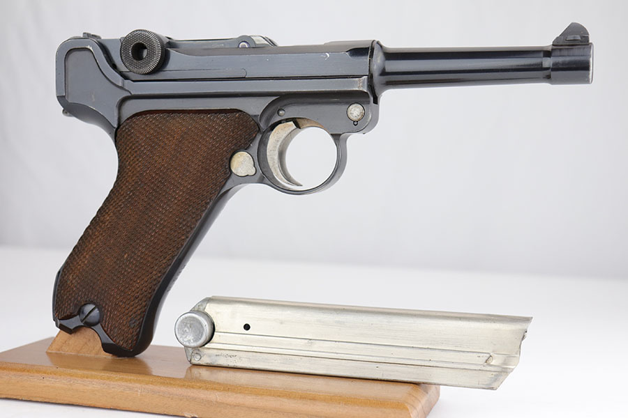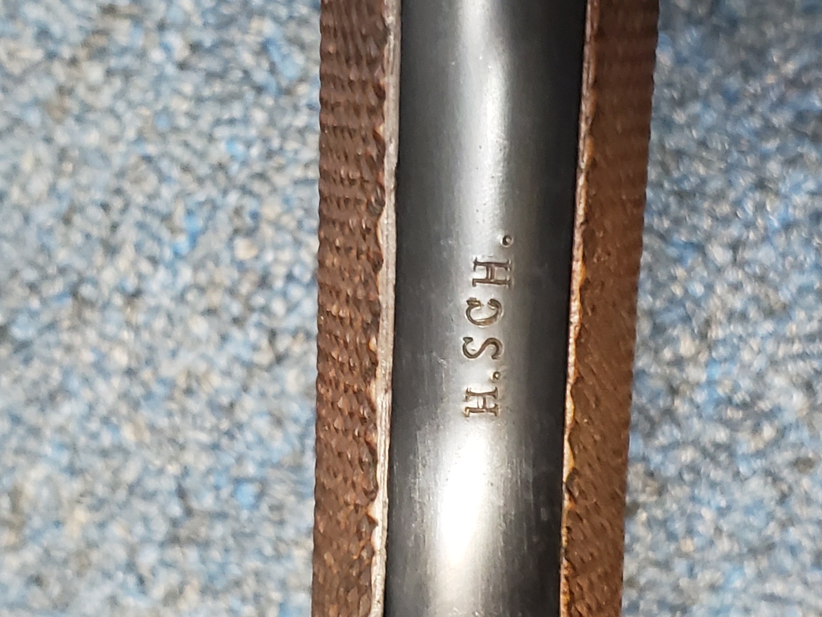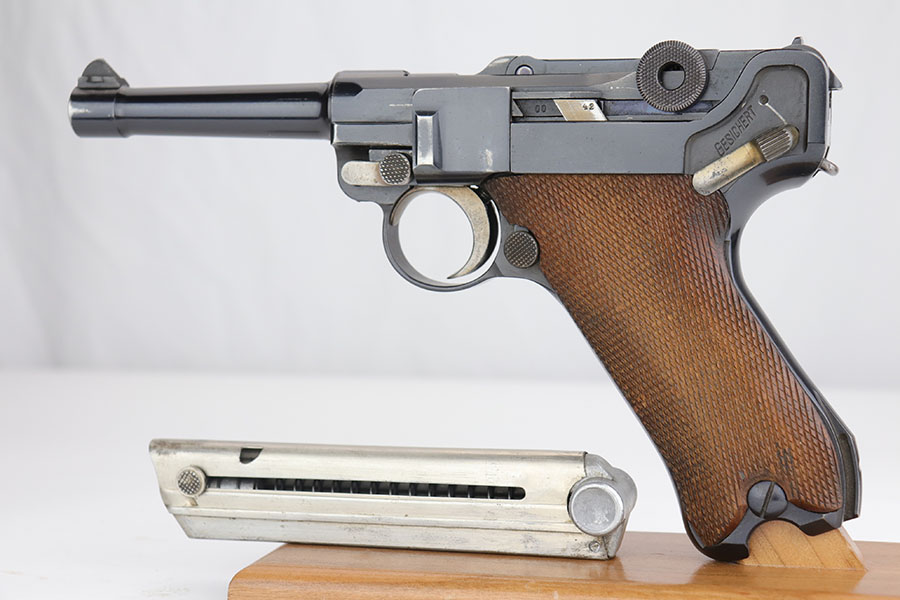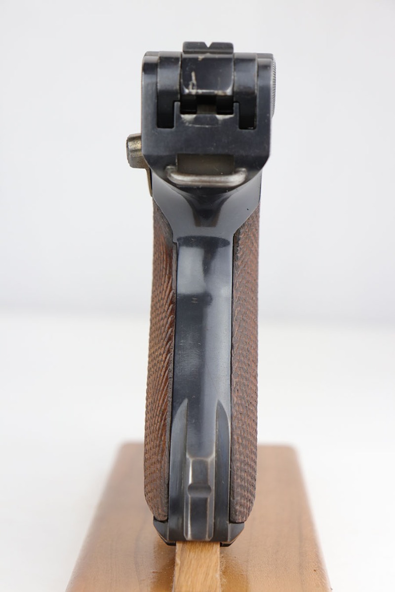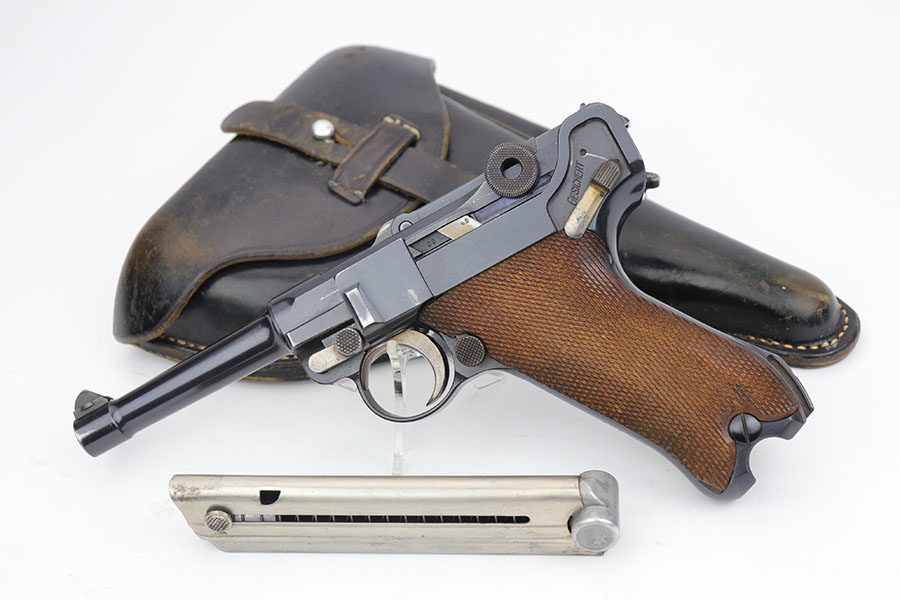 9/26/19 – This is a very unusual Luger and holster rig to say the least. We’re calling this a “War Trophy” because it was put together at the factory most likely at the end of the war. It has no factory logo, factory code, proof marks or serial number. That could not happen unless it was stolen by an employee, or picked up by a GI at war’s end. (and a factory theft would NOT put his name on the gun!) The safety bar and sear bar are numbered “42” and “00” respectively no doubt re-cycled parts left in the factory. Interestingly, the front strap has the initials H. SCH. stamped into the metal. Similarly, found on the back of the holster is the name “H. SCHNEIDER”. A quick search finds an American civilian investigator, Henry Schneider, was employed by the US Army to look into the possibility that Ford and GM “collaborated” with the Nazi’s before the US got into the war. He was in Germany in Sept of 1945 and issued a report. It is feasible that such a high level investigator would have access to such a souvenir should he want one, AND have the means to have a factory worker imprint his name on the holster and gun. The gun is in about 96% condition with some light edge wear and very minor strap wear. The biggest areas for wear are the straw parts. No rust or pitting and a minty bore. No maker stamps or proofs on the gun or magazine. Grips are unmarked, and the holster is an original 1942 police luger holster. Also, at this point we have no way of PROVING the actual identity of H. Schneider.