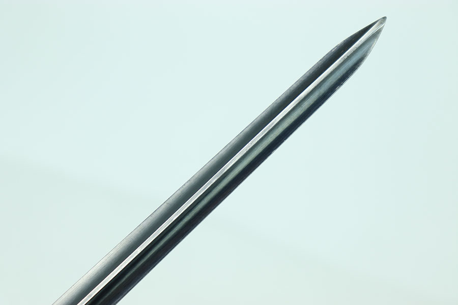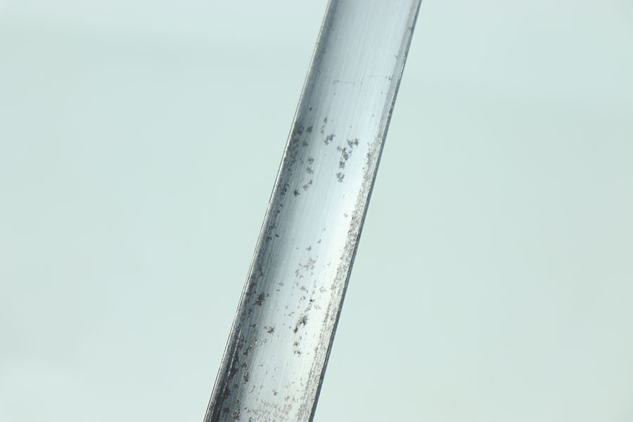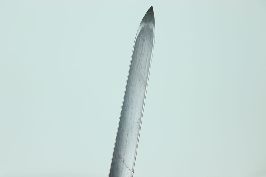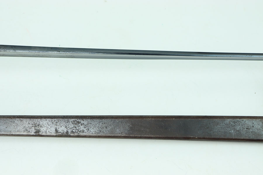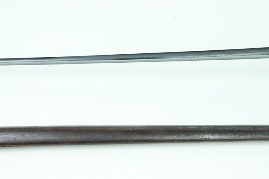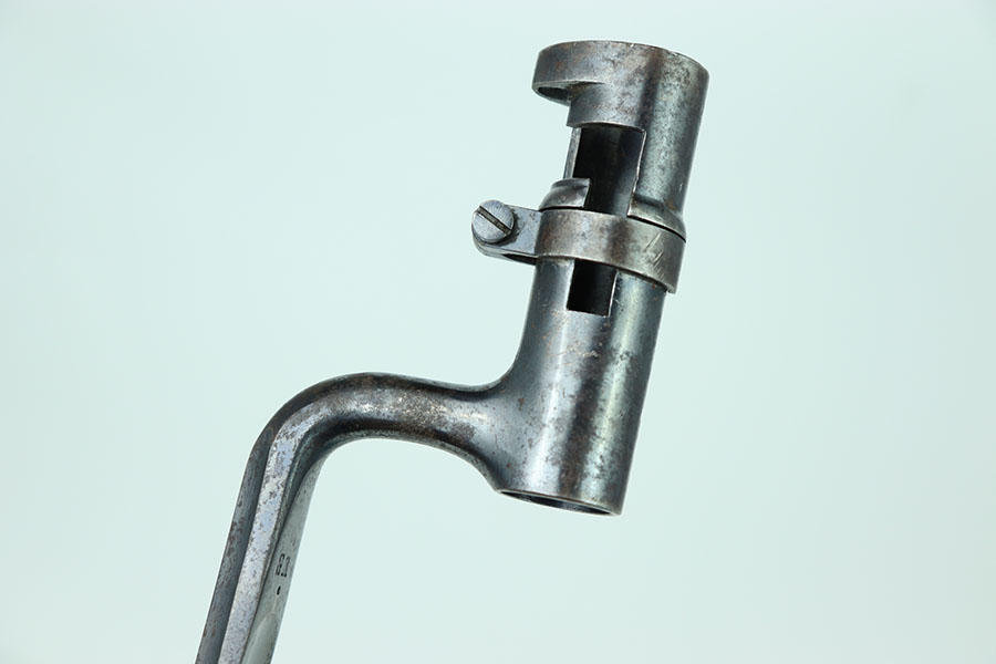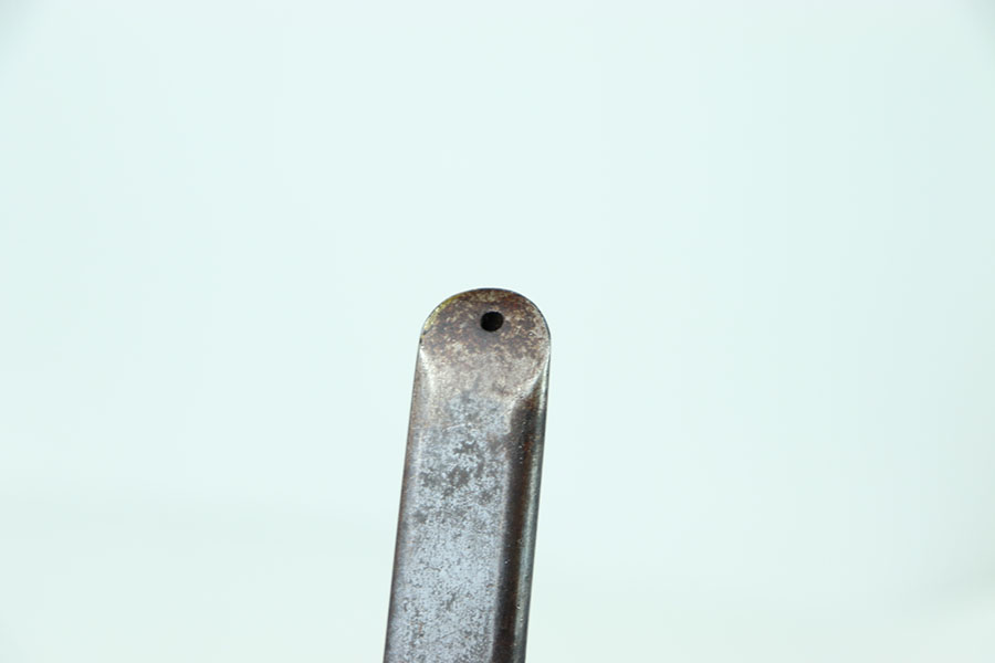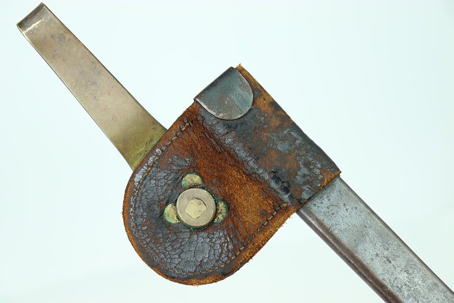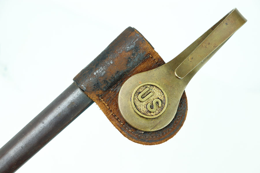 6/25/24 – This is an excellent example of a US 1873 trapdoor bayonet. This item is in excellent condition given its age. The spike of the bayonet is in near minty condition with an excellent bluing. There are no dings or divots along the edges of the spike. The only bit of oxidation only covers about a third of the spike on the side of the “US” marking. That oxidation continues through the neck of the bayonet that mounts to the rifle. The locking swivel moves smoothly. The matching scabbard is in great condition with a consistent patina throughout but the majority of the blued finish still remains. The scabbard is US marked and the leather is in nice condition with some chipping of the leather but still holds strong pliability. The leather is marked on the backside but it is not legible.