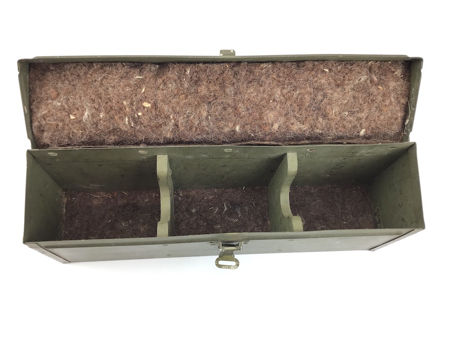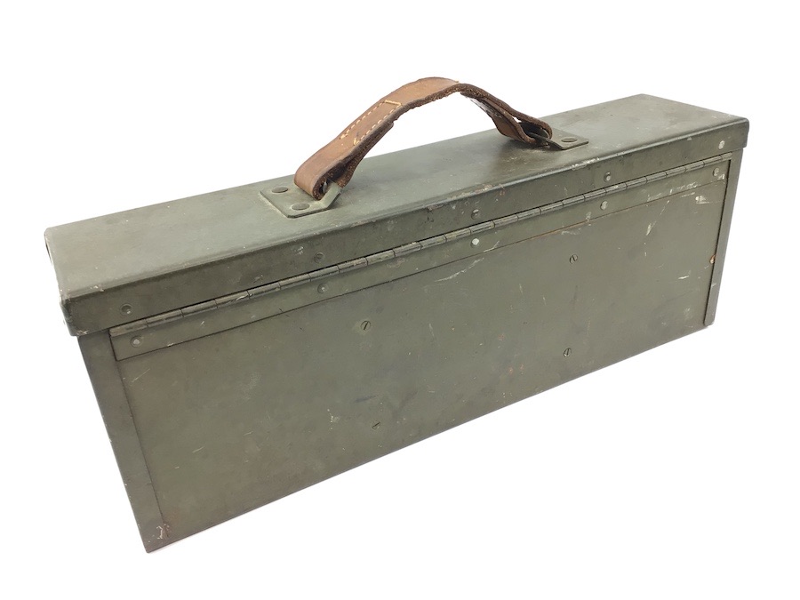 8/3/22 – Original and great condition. This chest would hold 15 B.A.R. mags as part of the short-lived US Army’s M1922 “cavalry” machine rifle, for a total of 300 rounds of .30-06 ammo. The box is complete with interior partitions and padding. Functional clasp and hinges. Secure leather handle. Great collector piece.