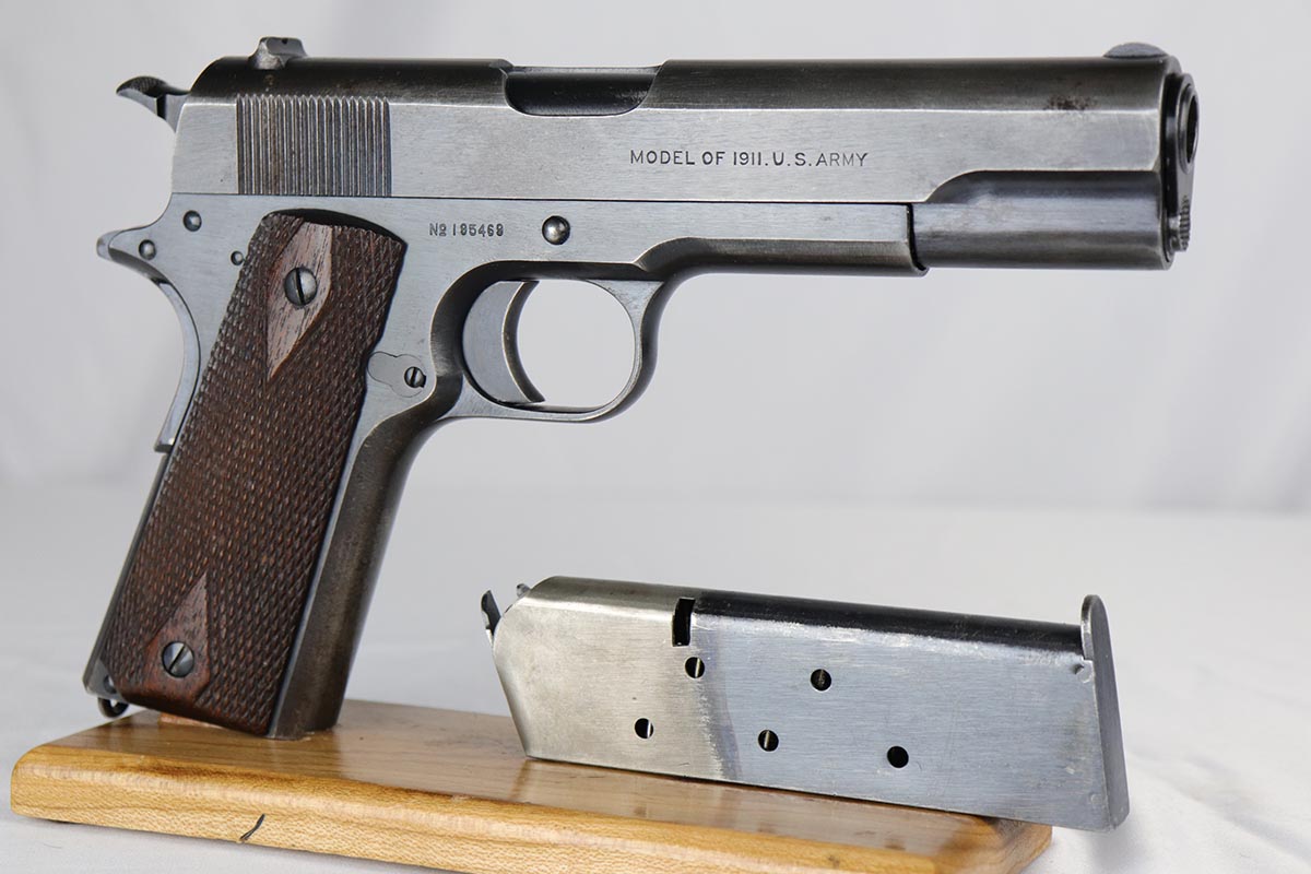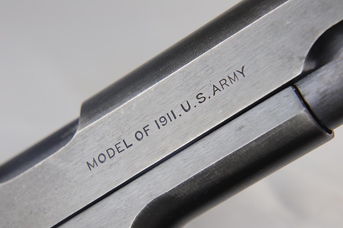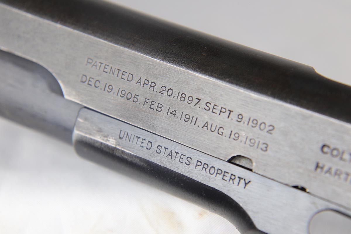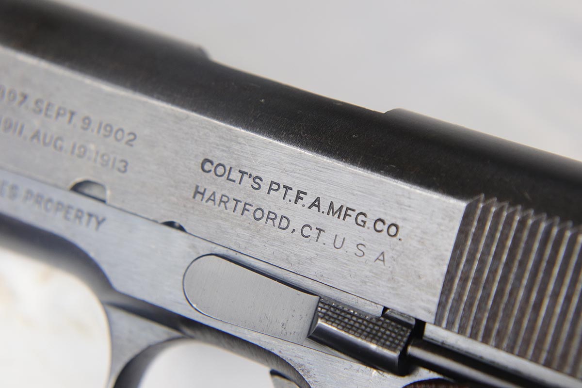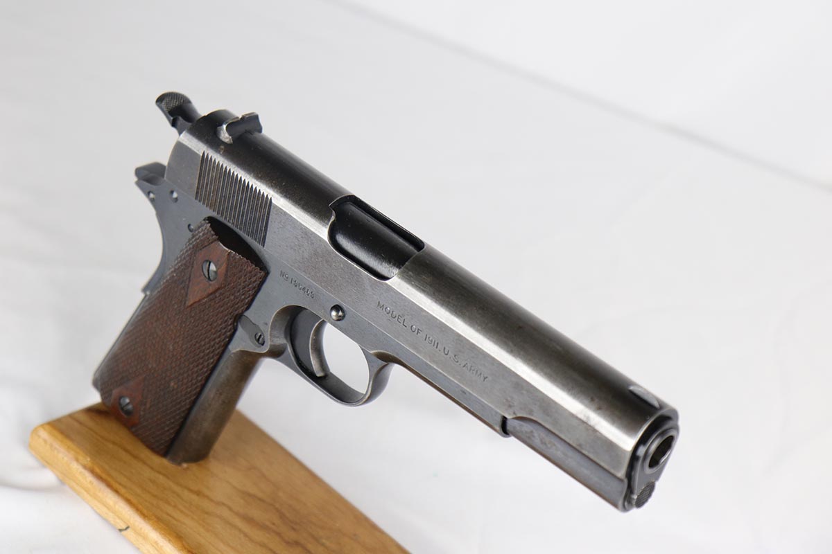 5/2/18 – This is a nice, all original example of a World War I era Colt 1911 that was manufactured for the US Army in 1917. The brushed blue finish shows some thinning on the straps and minor patina on the slide but the wear is natural and uniform. Proper vertical P H barrel and inspector proofs on pistol. Gorgeous bore and excellent grips. ‘B’ marked magazine.