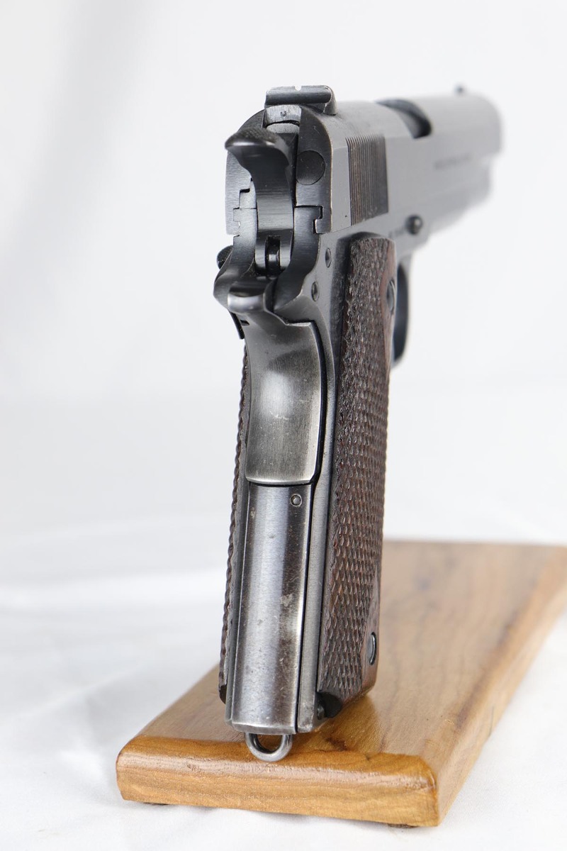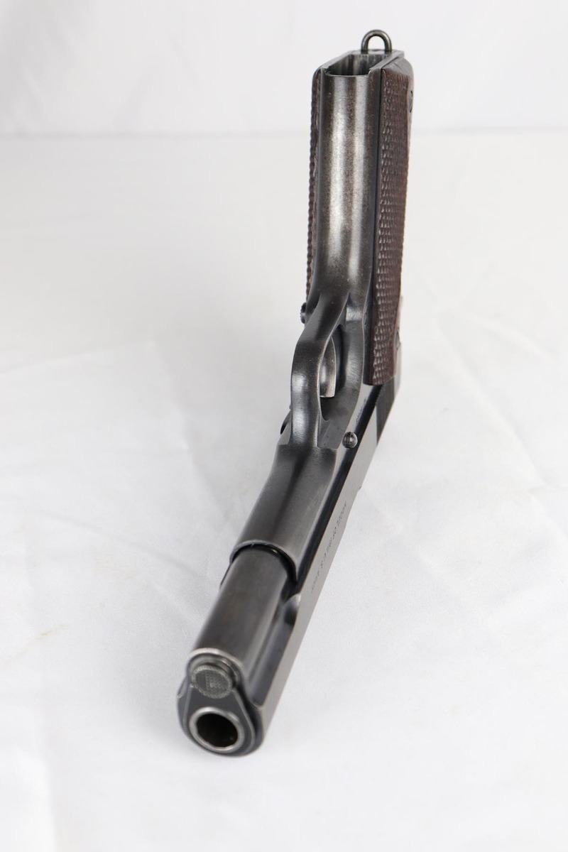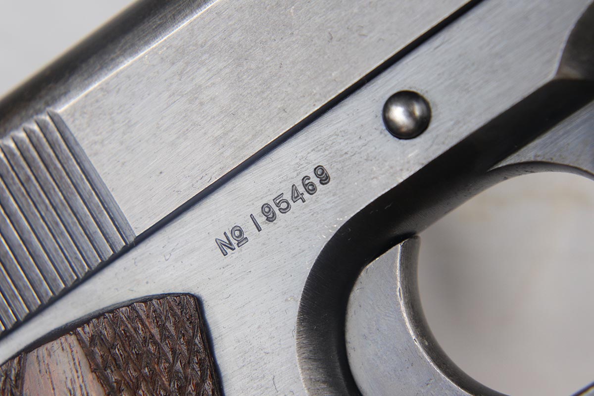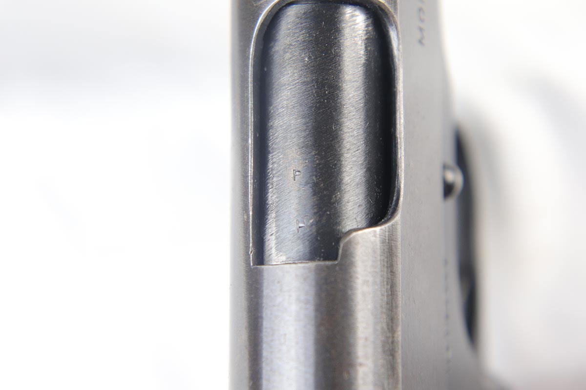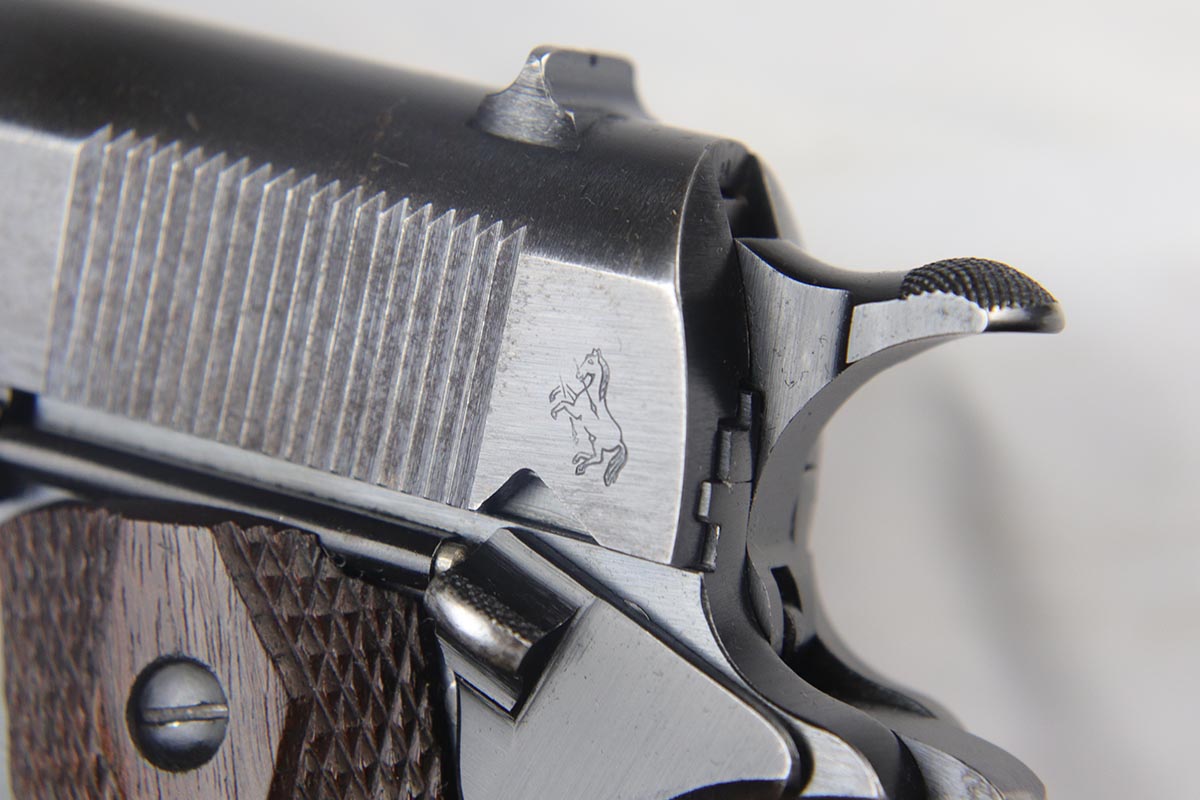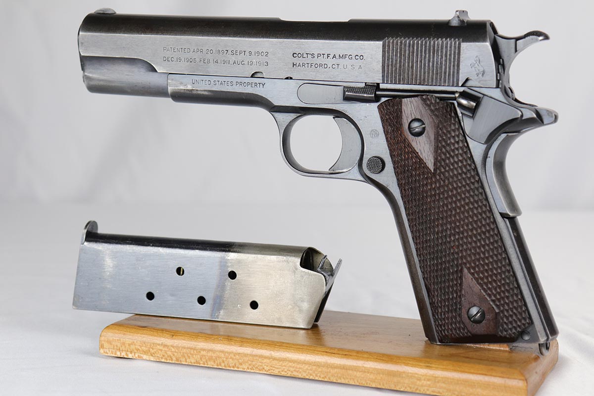 5/2/18 – This is a nice, all original example of a World War I era Colt 1911 that was manufactured for the US Army in 1917. The brushed blue finish shows some thinning on the straps and minor patina on the slide but the wear is natural and uniform. Proper vertical P H barrel and inspector proofs on pistol. Gorgeous bore and excellent grips. ‘B’ marked magazine.