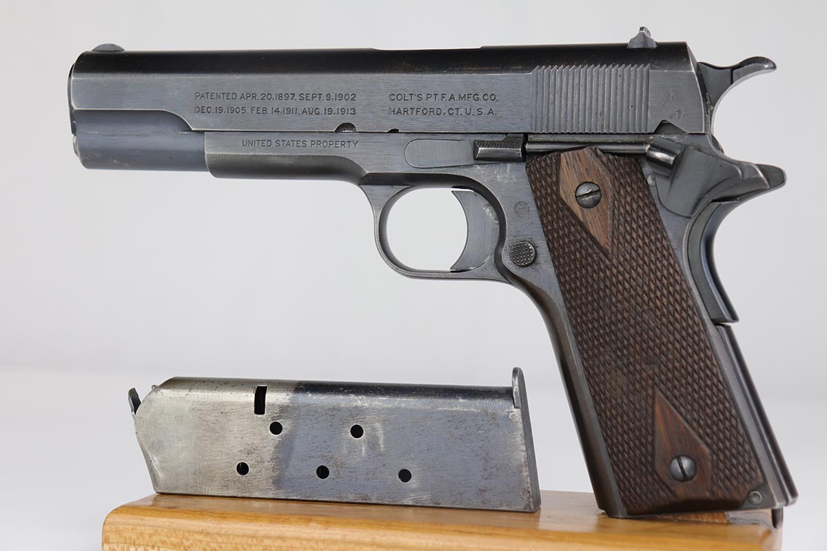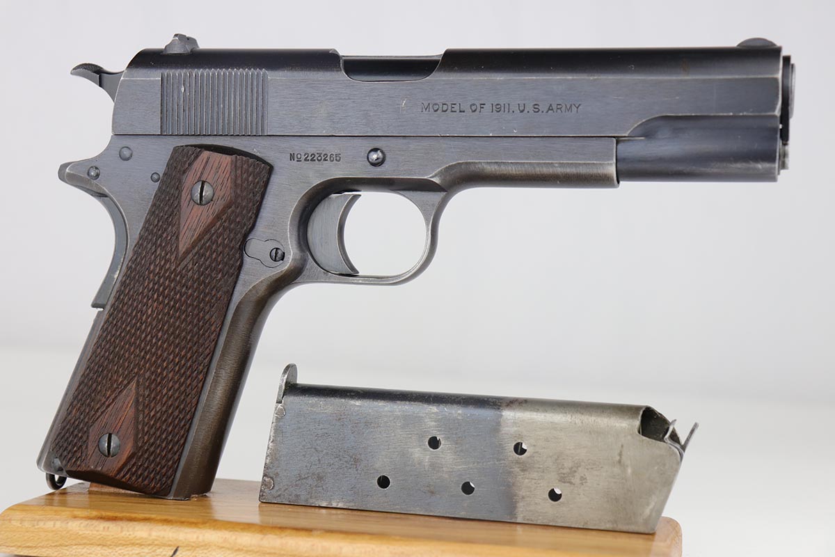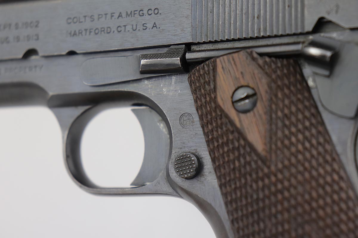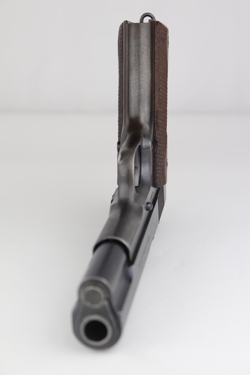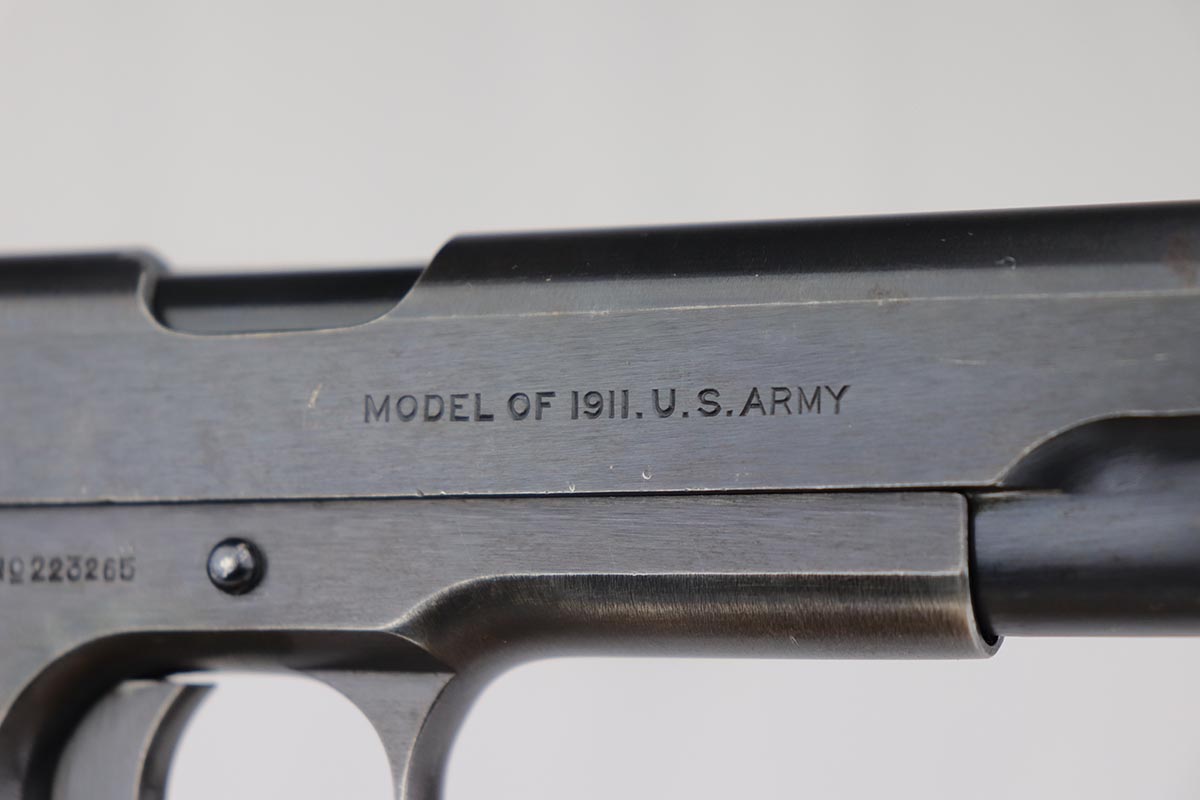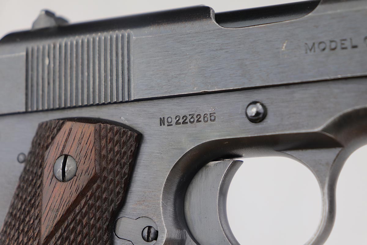 7/22/19 – This is a very nice example of a Colt 1911 that was manufactured in 1918 and issued to the US Army. The pistol has a fantastic profile view with only minor edge wear, but the majority of finish loss is on the trigger guard and bottom of the back strap. There is also minor patina along the top of the slide. Proper slide with ‘H’ proof and correct ‘P H’ barrel with mint bore. Nicely checkered grips with only minor handling wear and age. ‘L’ marked two-tone magazine. All proper inspector markings. Interestingly, this pistol only just missed out on a small block of Navy produced pistols (serial range was 223,9xx).