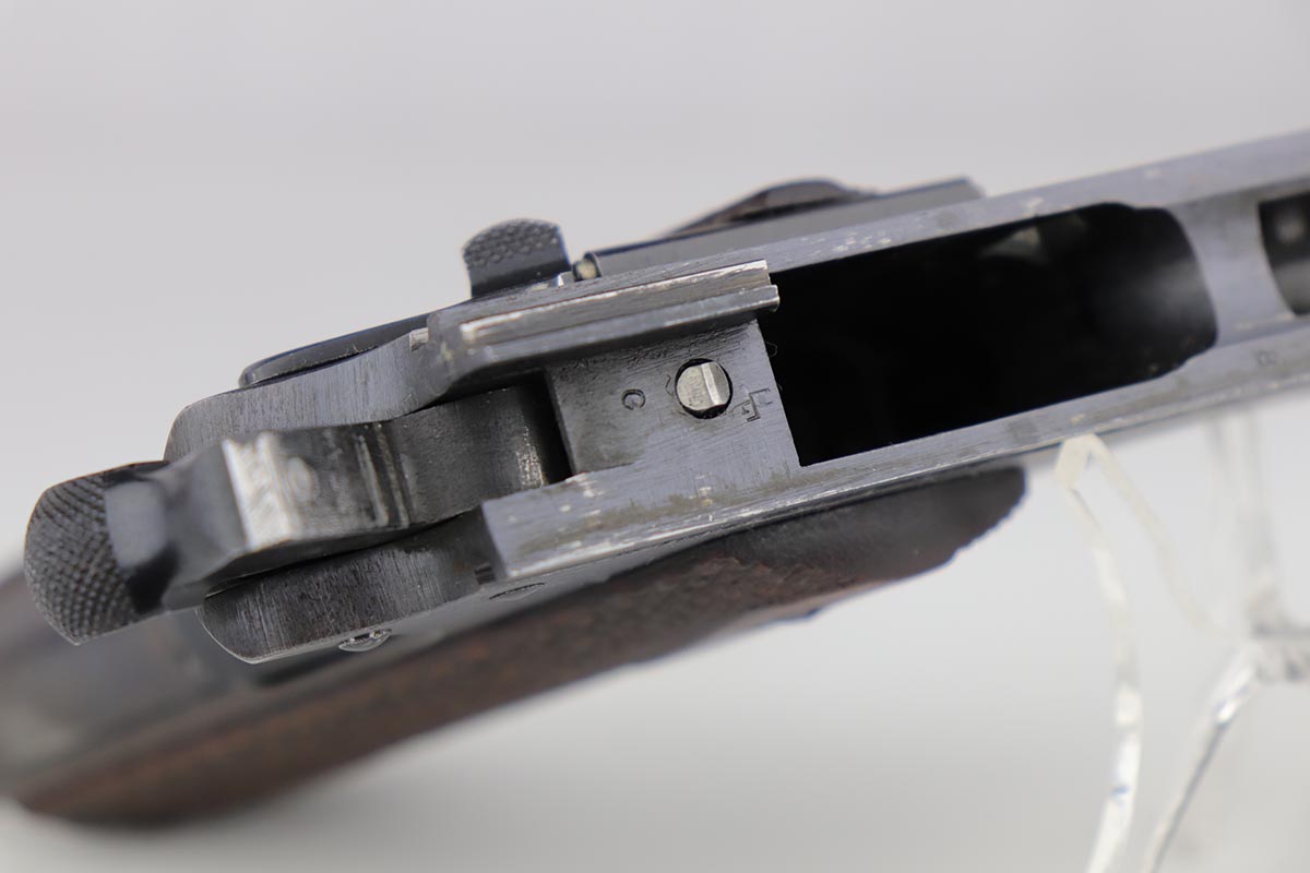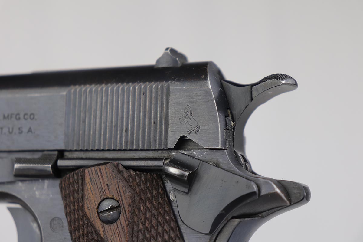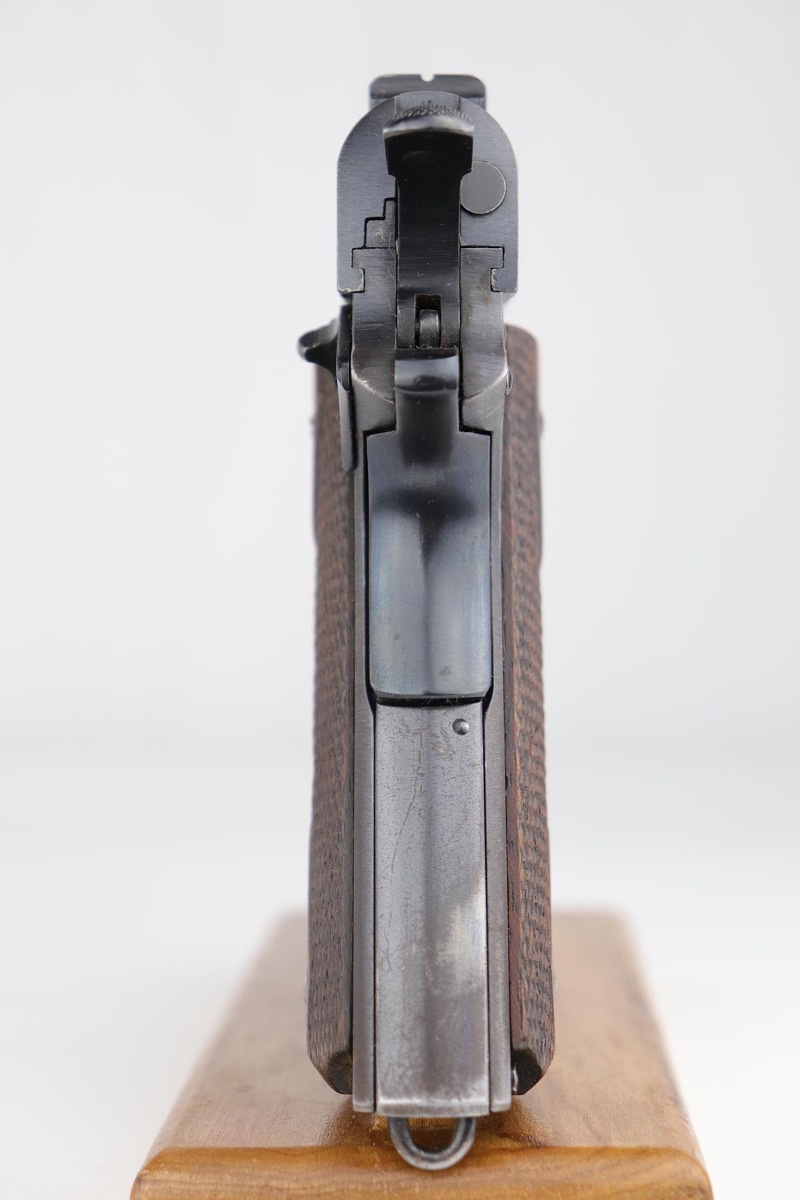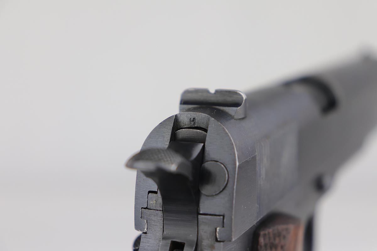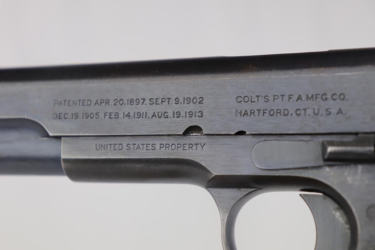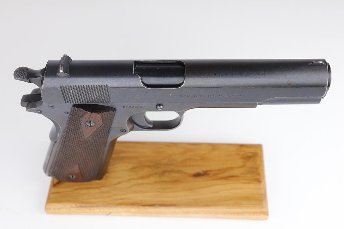 7/22/19 – This is a very nice example of a Colt 1911 that was manufactured in 1918 and issued to the US Army. The pistol has a fantastic profile view with only minor edge wear, but the majority of finish loss is on the trigger guard and bottom of the back strap. There is also minor patina along the top of the slide. Proper slide with ‘H’ proof and correct ‘P H’ barrel with mint bore. Nicely checkered grips with only minor handling wear and age. ‘L’ marked two-tone magazine. All proper inspector markings. Interestingly, this pistol only just missed out on a small block of Navy produced pistols (serial range was 223,9xx).
