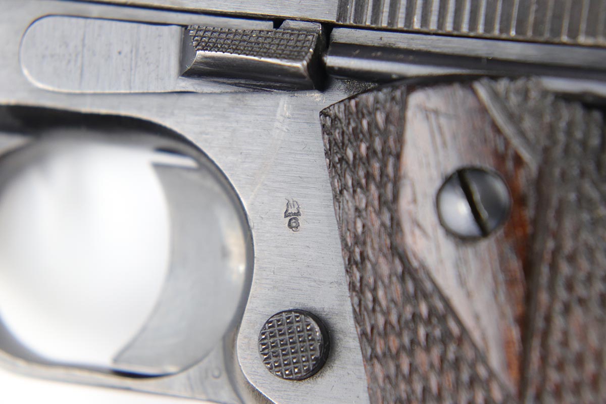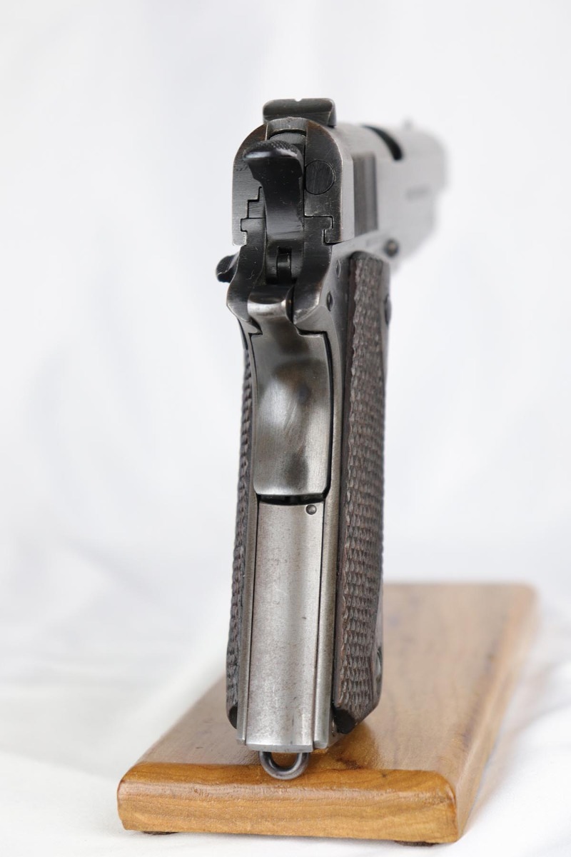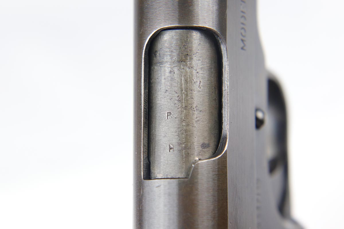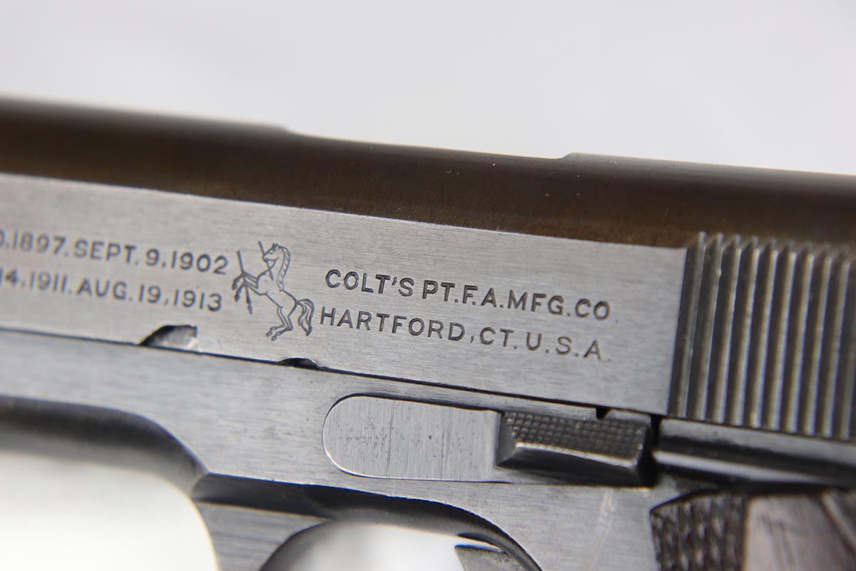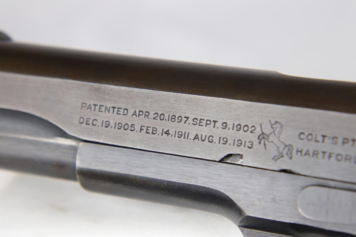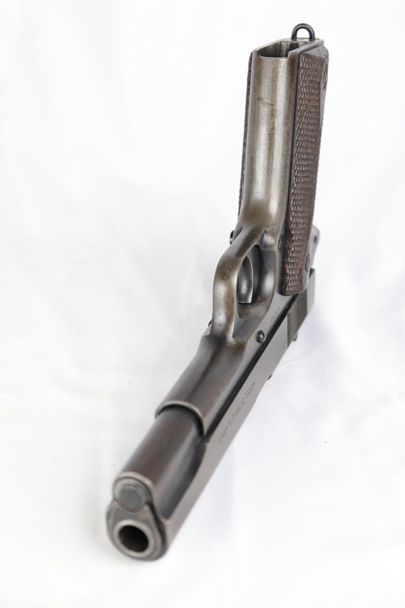 5/31/18 – This is a US Army issued Colt 1911, manufactured in 1918 with all original parts and finish.  This pistol is considered a “Black Army” Colt due to the dark finish they used in 1918. These finishes don’t hold up well over time so this one is actually MUCH better than most you will see. Finish usually flakes off but his one has turned a uniform patina brown throughout.  Excellent original grips and dual-tone magazine.  HP marked barrel that shows minor corrosion and frosting throughout the bore.   All original parts and configuration. Tough to find in this condition. WW1 issue. Frame has proper Springfield acceptance. Correct and original Colt.