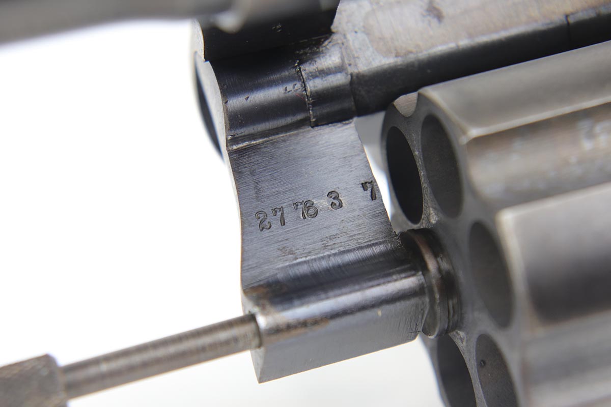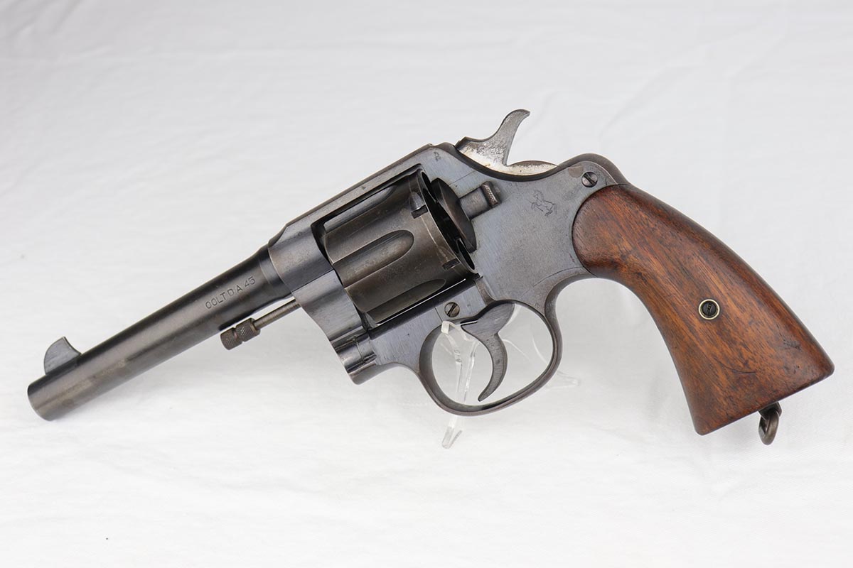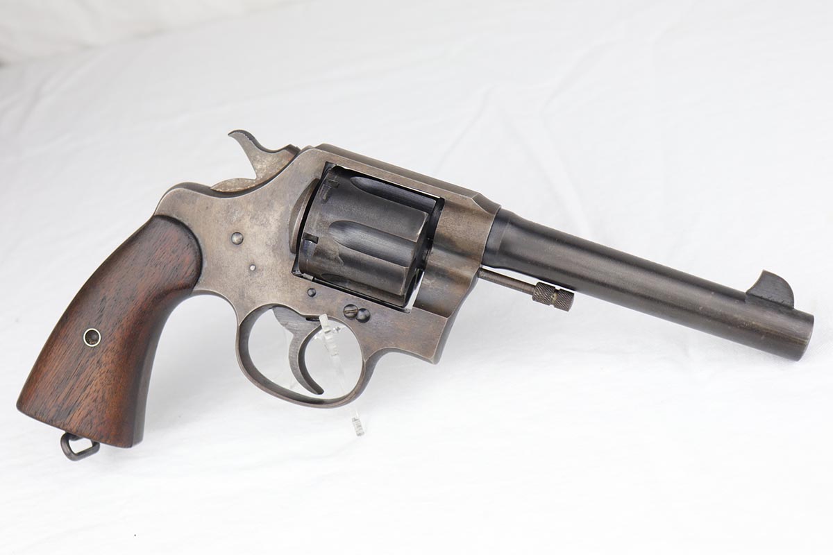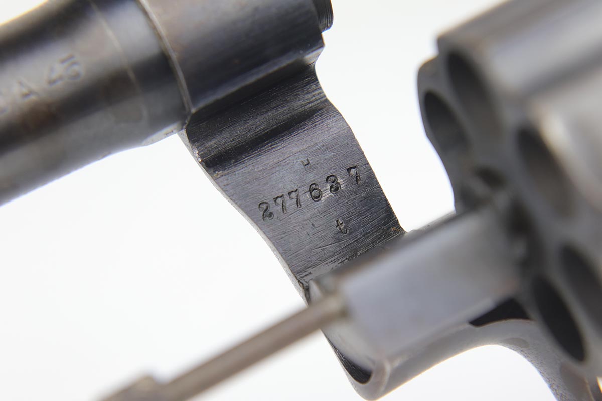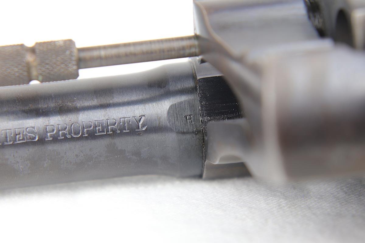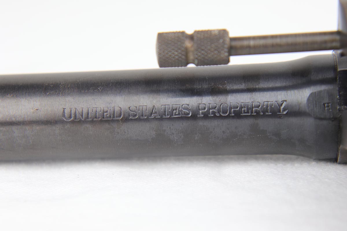 12/20/18 – This is a military issued Colt M1917 revolver from the Great War era. This is a nice example of an original M1917, with the original matching numbered grips. The revolver shows even wear throughout in profile view, though the grip frame shows patina and thinning throughout. Right side frame also has a somewhat sizable area of thinning. Good timing and action. Barrel is UNITED STATES PROPERTY marked. Bore is nice and shiny.