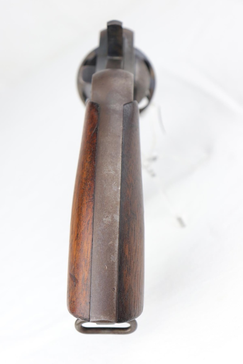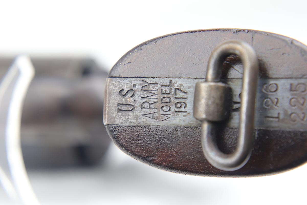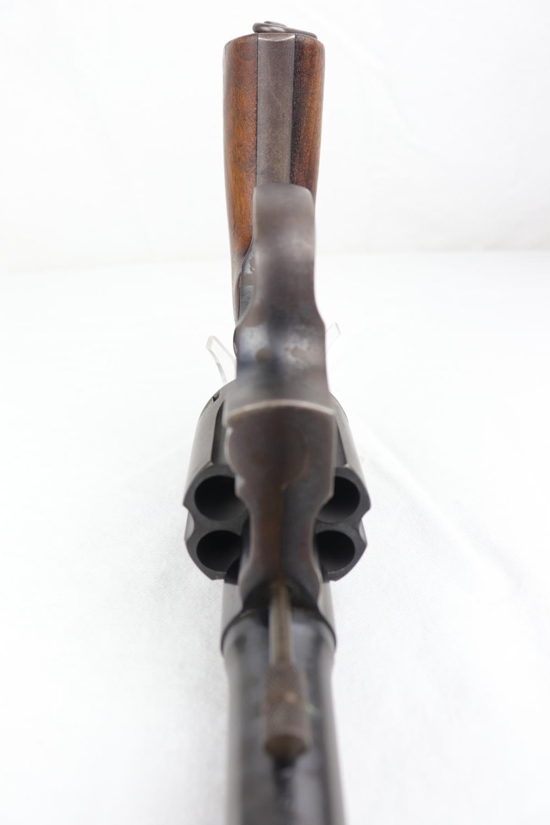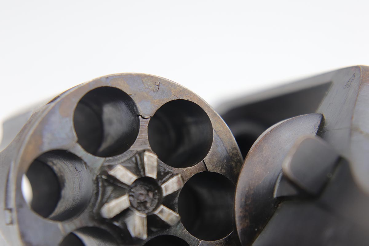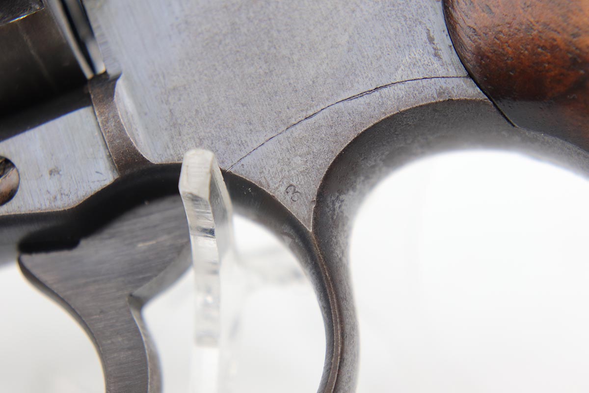 12/20/18 – This is a military issued Colt M1917 revolver from the Great War era. This is a nice example of an original M1917, with the original matching numbered grips. The revolver shows even wear throughout in profile view, though the grip frame shows patina and thinning throughout. Right side frame also has a somewhat sizable area of thinning. Good timing and action. Barrel is UNITED STATES PROPERTY marked. Bore is nice and shiny.