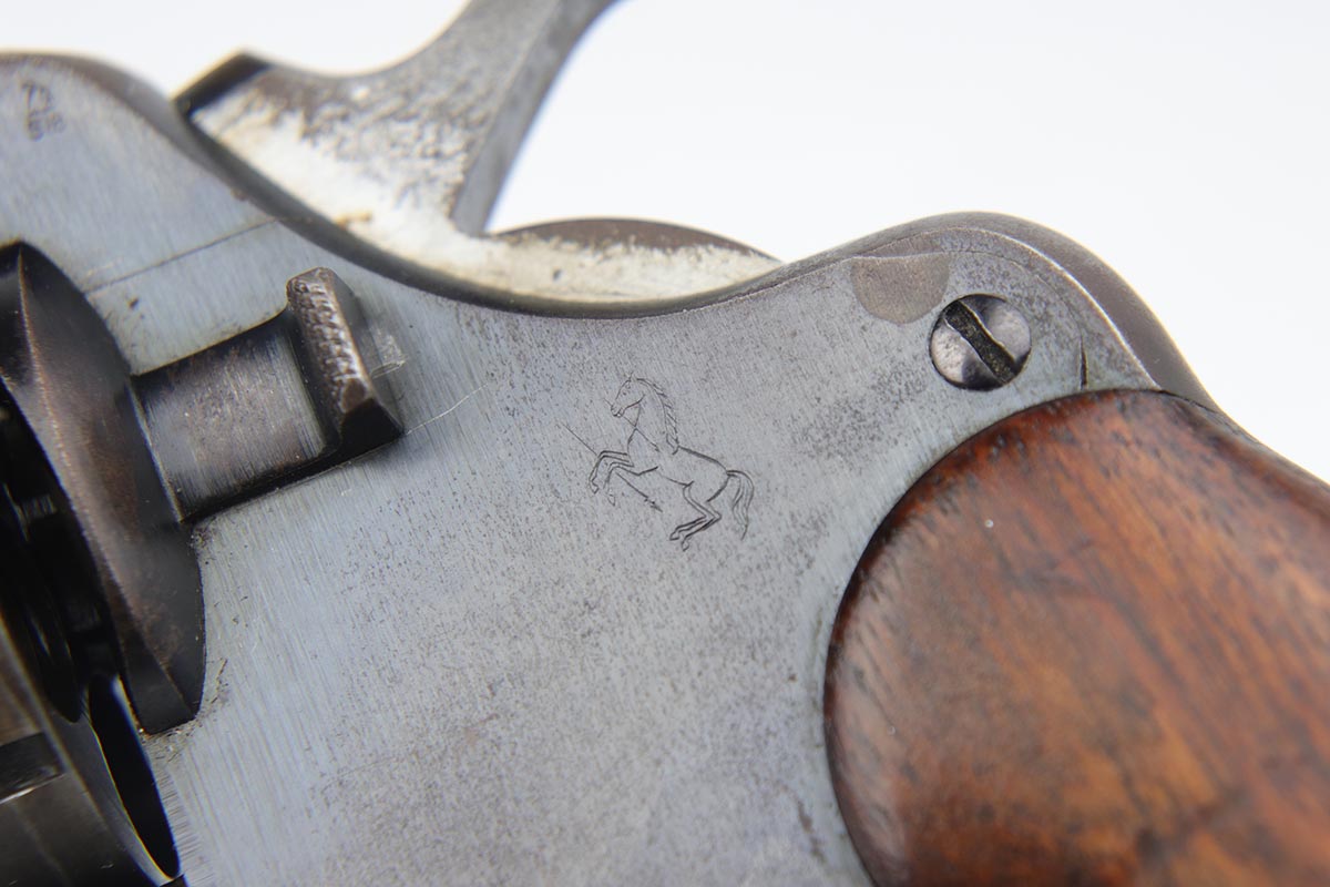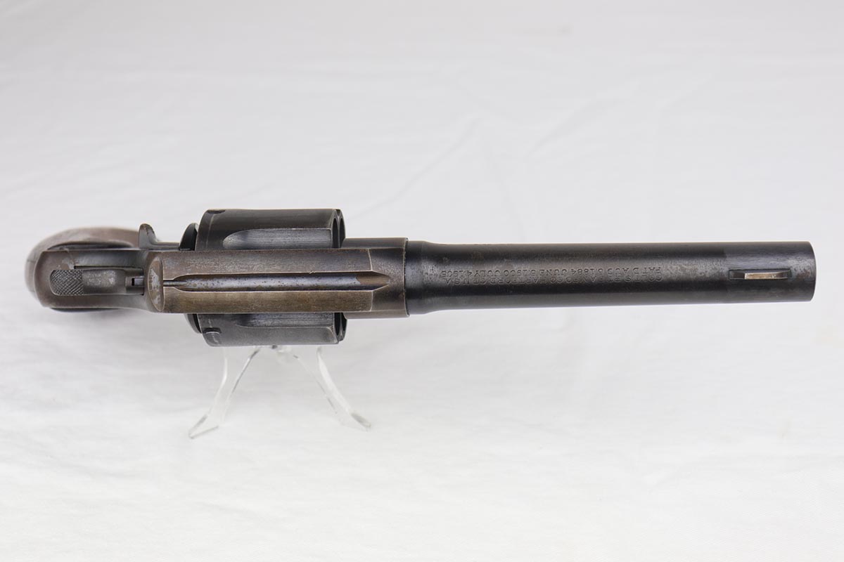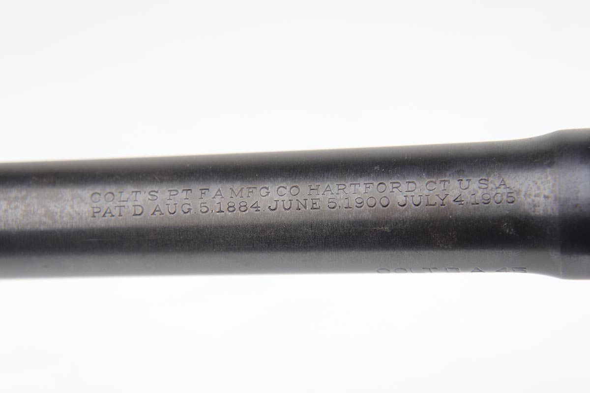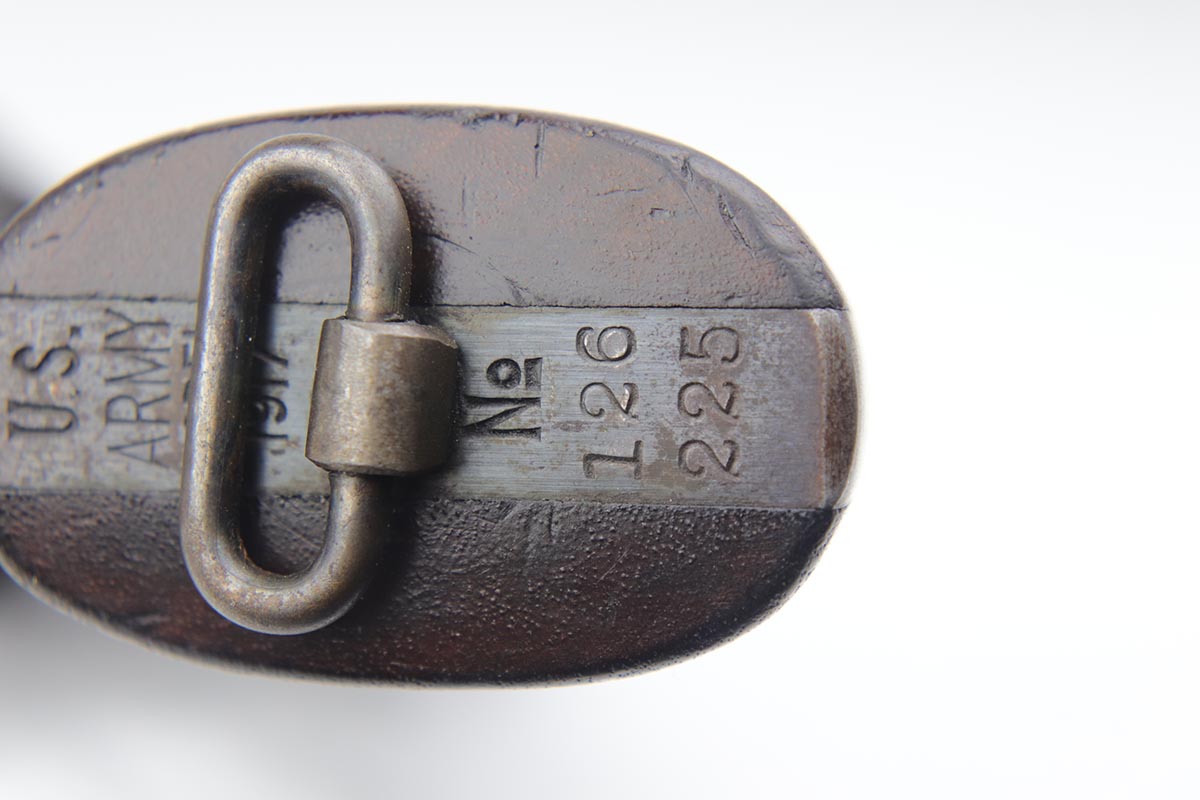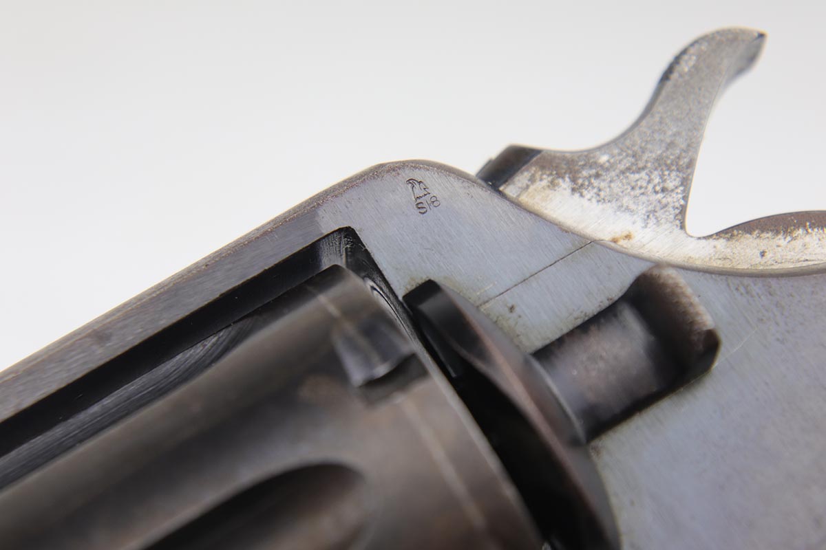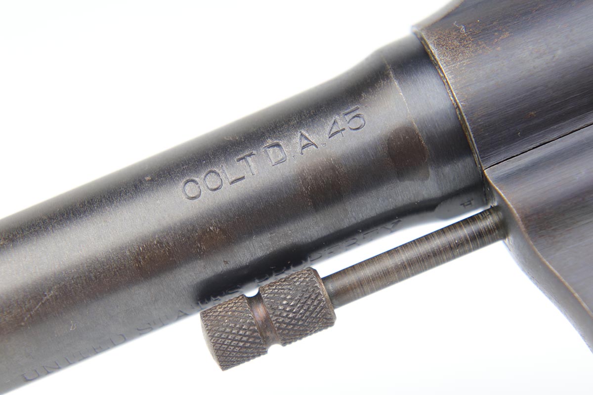 12/20/18 – This is a military issued Colt M1917 revolver from the Great War era. This is a nice example of an original M1917, with the original matching numbered grips. The revolver shows even wear throughout in profile view, though the grip frame shows patina and thinning throughout. Right side frame also has a somewhat sizable area of thinning. Good timing and action. Barrel is UNITED STATES PROPERTY marked. Bore is nice and shiny.