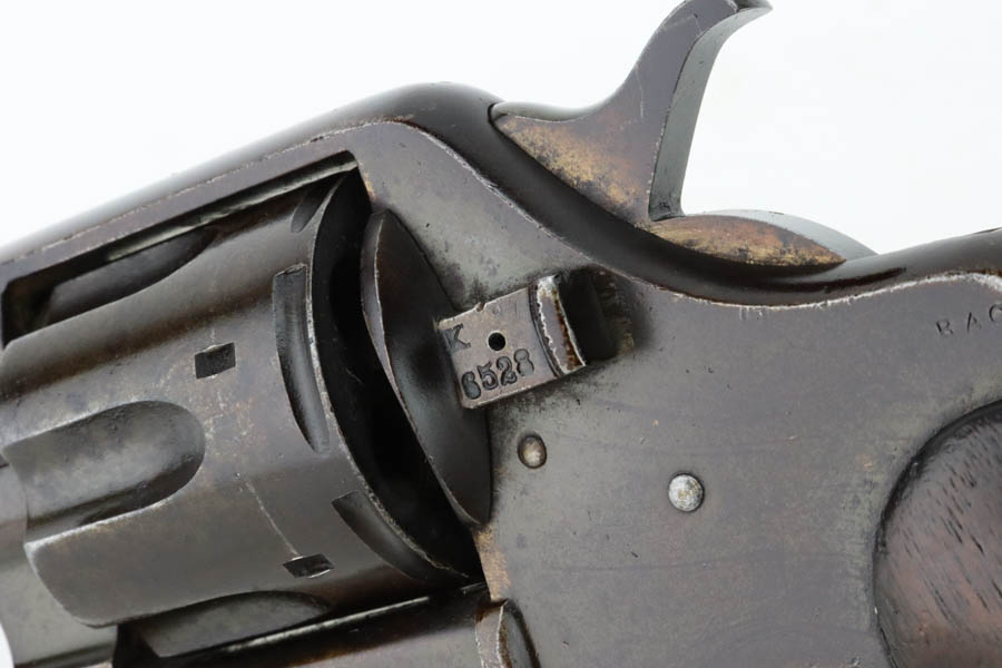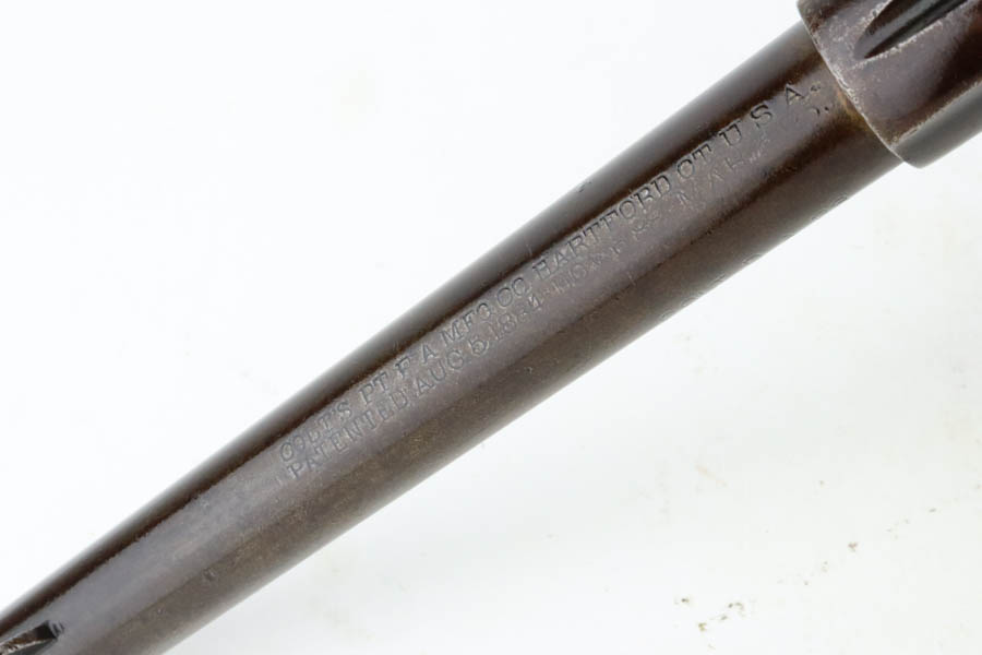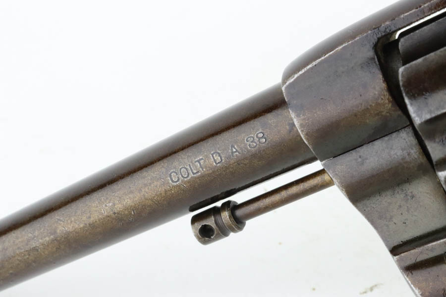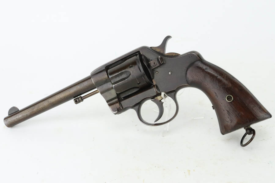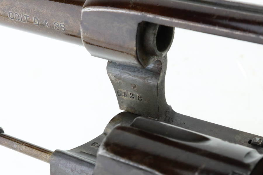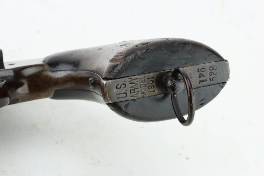 7/10/24 – This is a US Army Colt Model 1901, manufactured in 1899 and chambered in .38 Caliber. It is all matching. While there isn’t a ton of actual finish loss, there is obvious brown patina and oxidation throughout. The grips are hand-numbered to match. There is light surface rust on the frame under the grip panels. The bore has good rifling, but there are a couple of small spots of light surface oxidation. The lanyard ring on the butt of the frame has been replaced.
