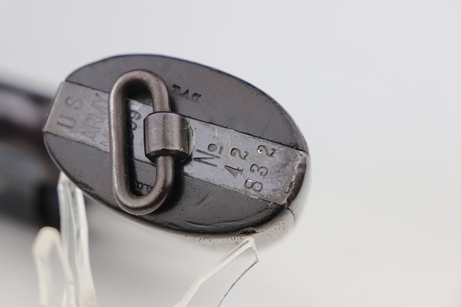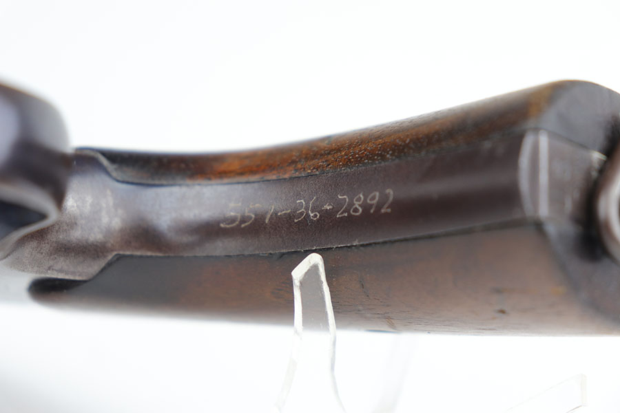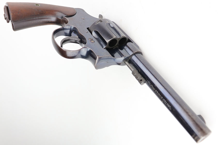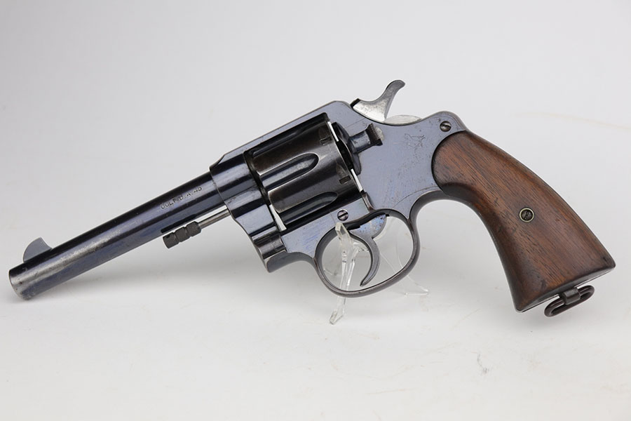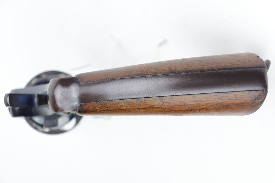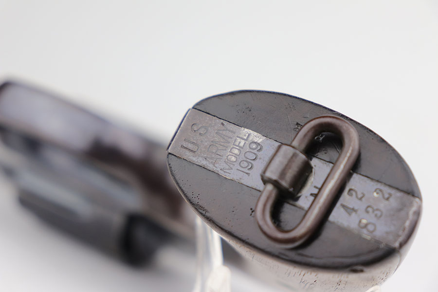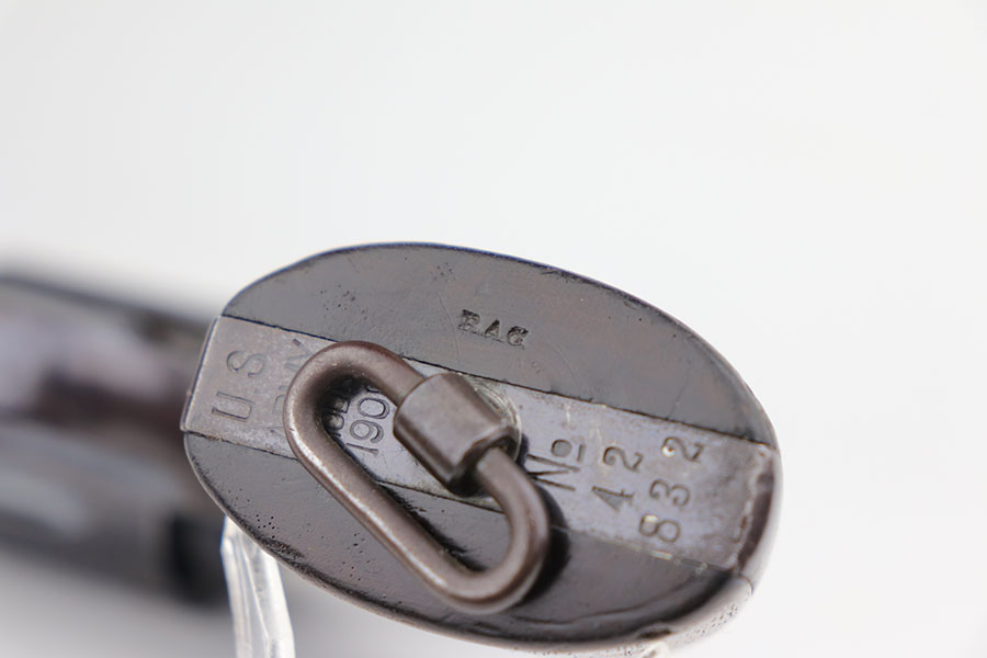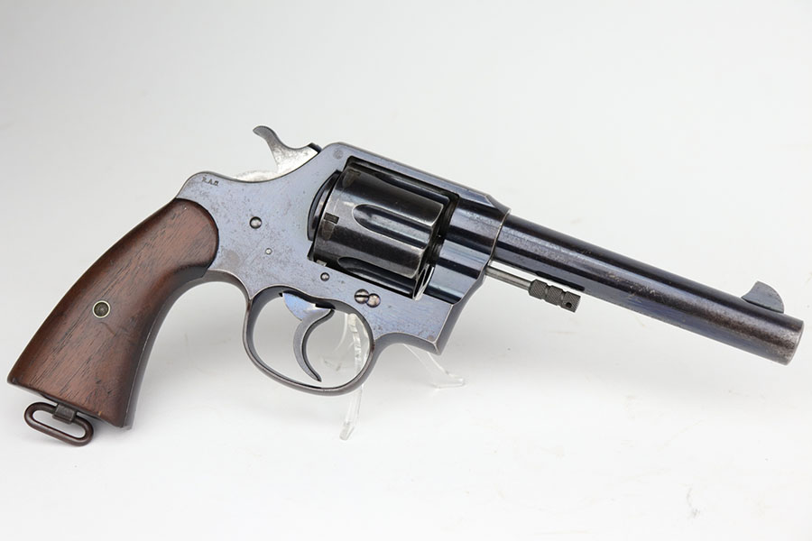 2/3/21 – This is a very nice example of a Colt Model 1909 revolver issued to the US Army during WW1. It is “United States Property” marked under the barrel and has “R.A.C.” inspector initials on the frame and bottom of the grips. It has retained roughly 85-90% of its original high polish bluing. Most of the wear is on the barrel and around the muzzle. There are light handling marks and areas of spotty brown patina throughout. The cylinder is tight and the action is smooth. Excellent bore – shiny with strong rifling.