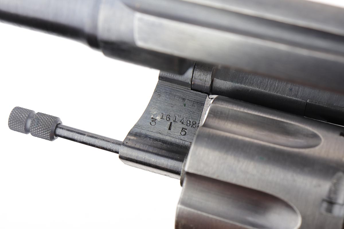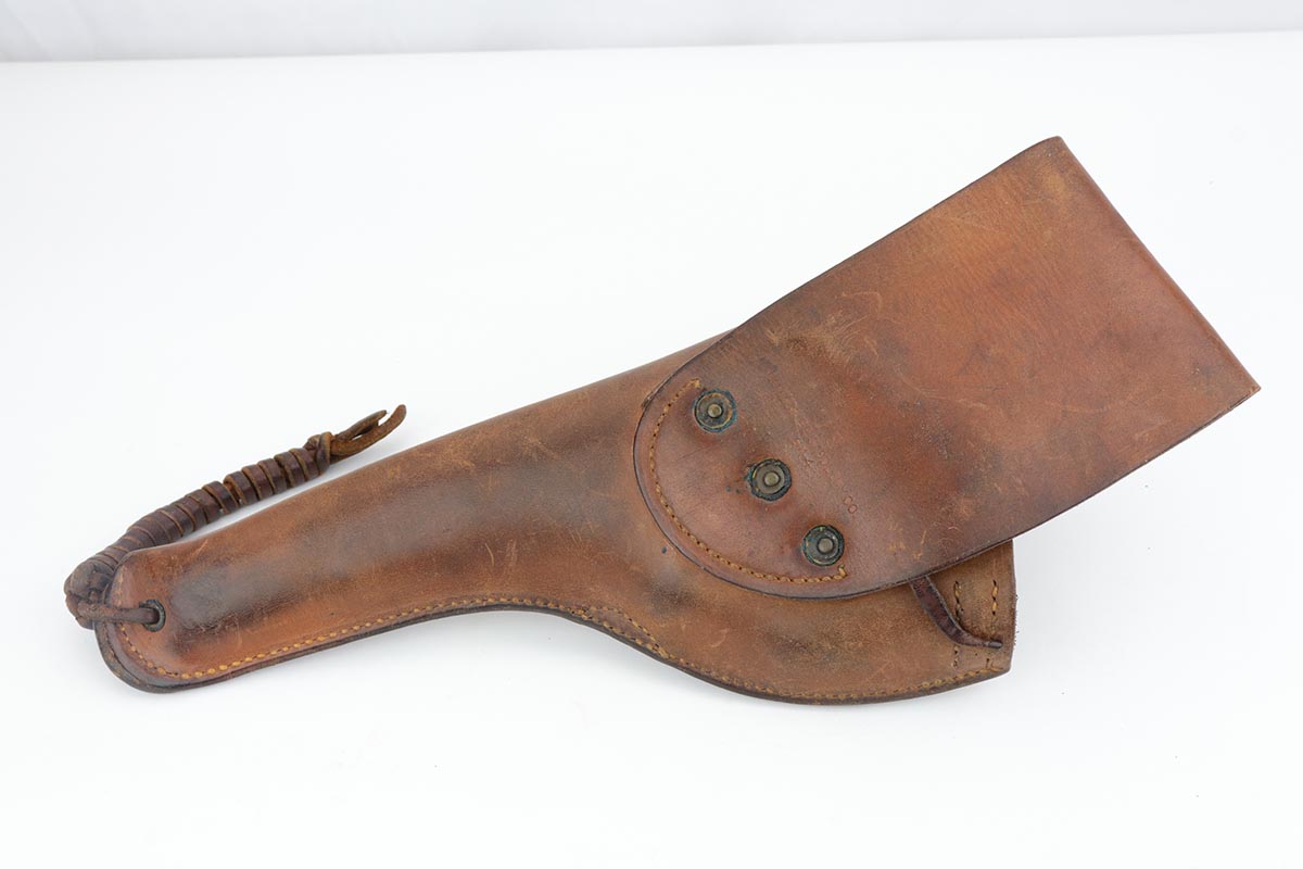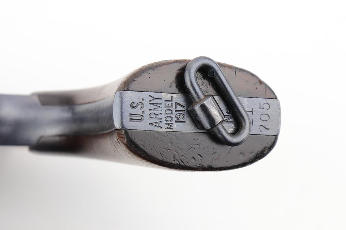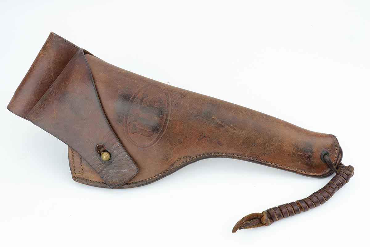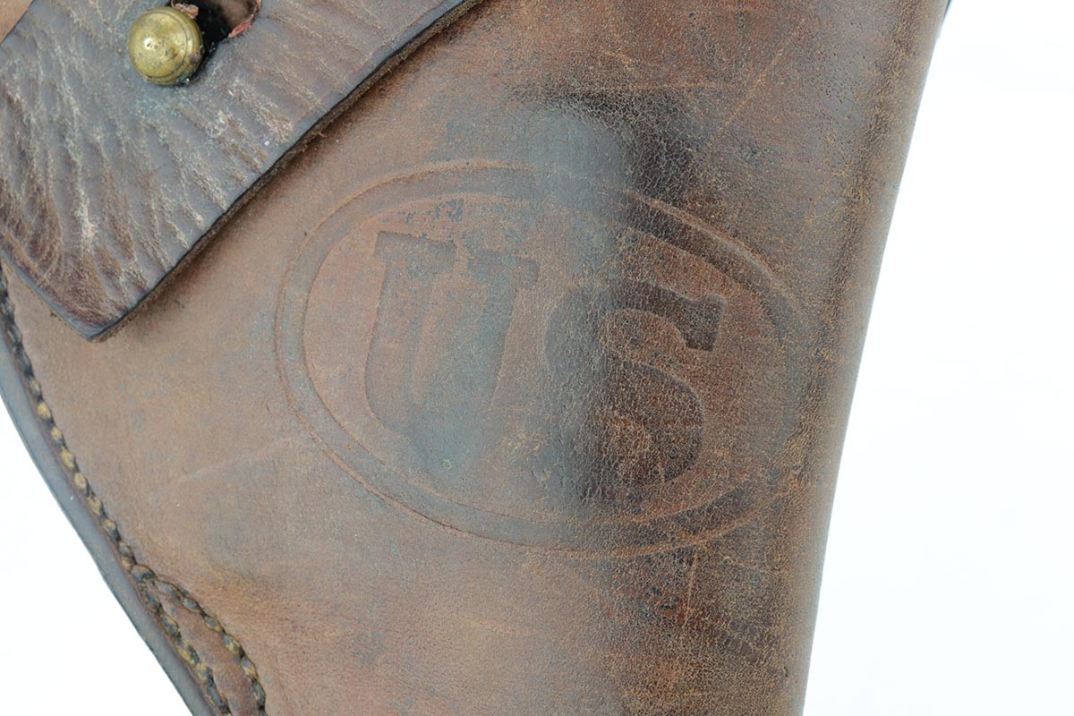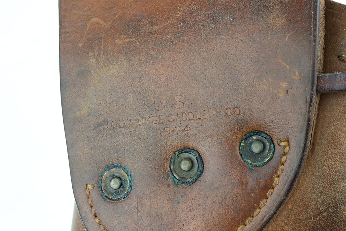 11/22/19 – This is a nice, original example of a US Army Colt M1917 revolver from 1918. It has about 95% of the original blue remaining, with some thinning on the cylinder, right side of frame and left side of barrel. GHS inspection mark is sharply stamped on frame, and barrel is marked UNITED STATES PROPERTY. Terrific bore and smooth action. Left grip panel is hand numbered but mismatched to the gun, and has a small corner chip. The revolver comes with an excellent holster, which is 1944 dated and maker marked to Milwaukee Saddlery Co.