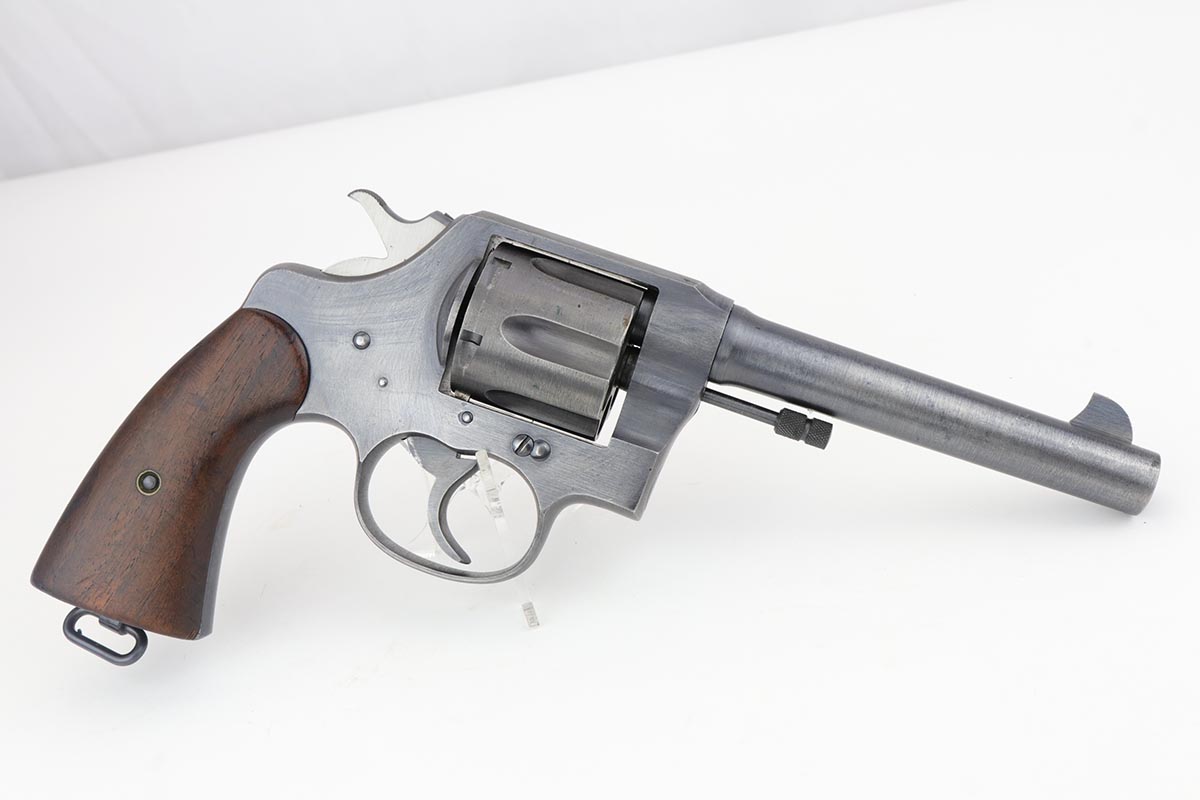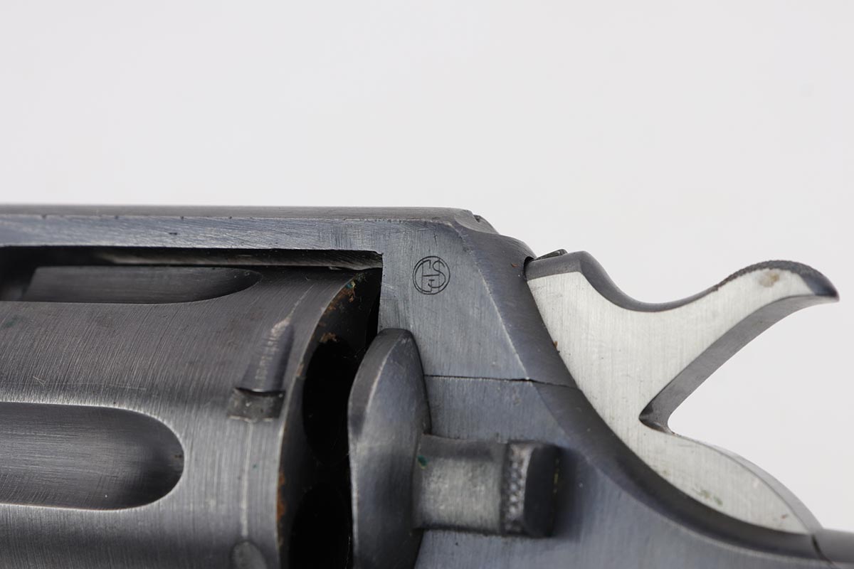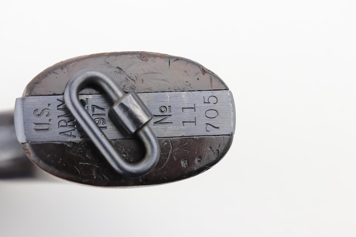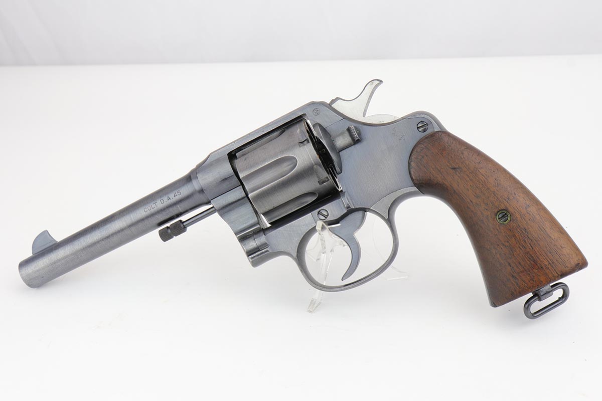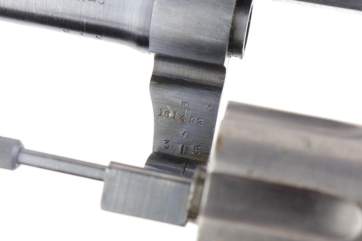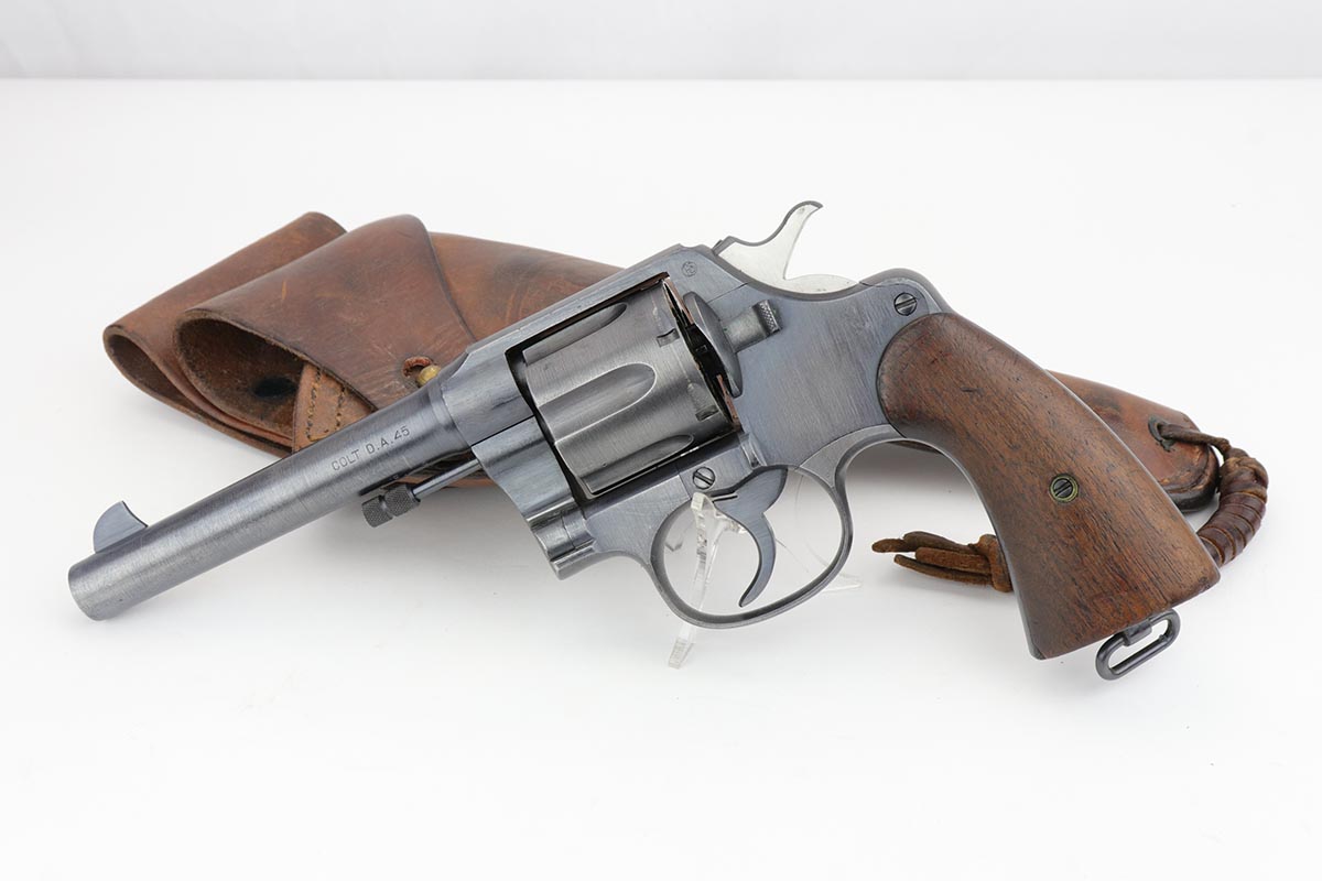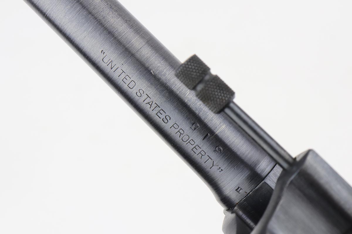 11/22/19 – This is a nice, original example of a US Army Colt M1917 revolver from 1918. It has about 95% of the original blue remaining, with some thinning on the cylinder, right side of frame and left side of barrel. GHS inspection mark is sharply stamped on frame, and barrel is marked UNITED STATES PROPERTY. Terrific bore and smooth action. Left grip panel is hand numbered but mismatched to the gun, and has a small corner chip. The revolver comes with an excellent holster, which is 1944 dated and maker marked to Milwaukee Saddlery Co.