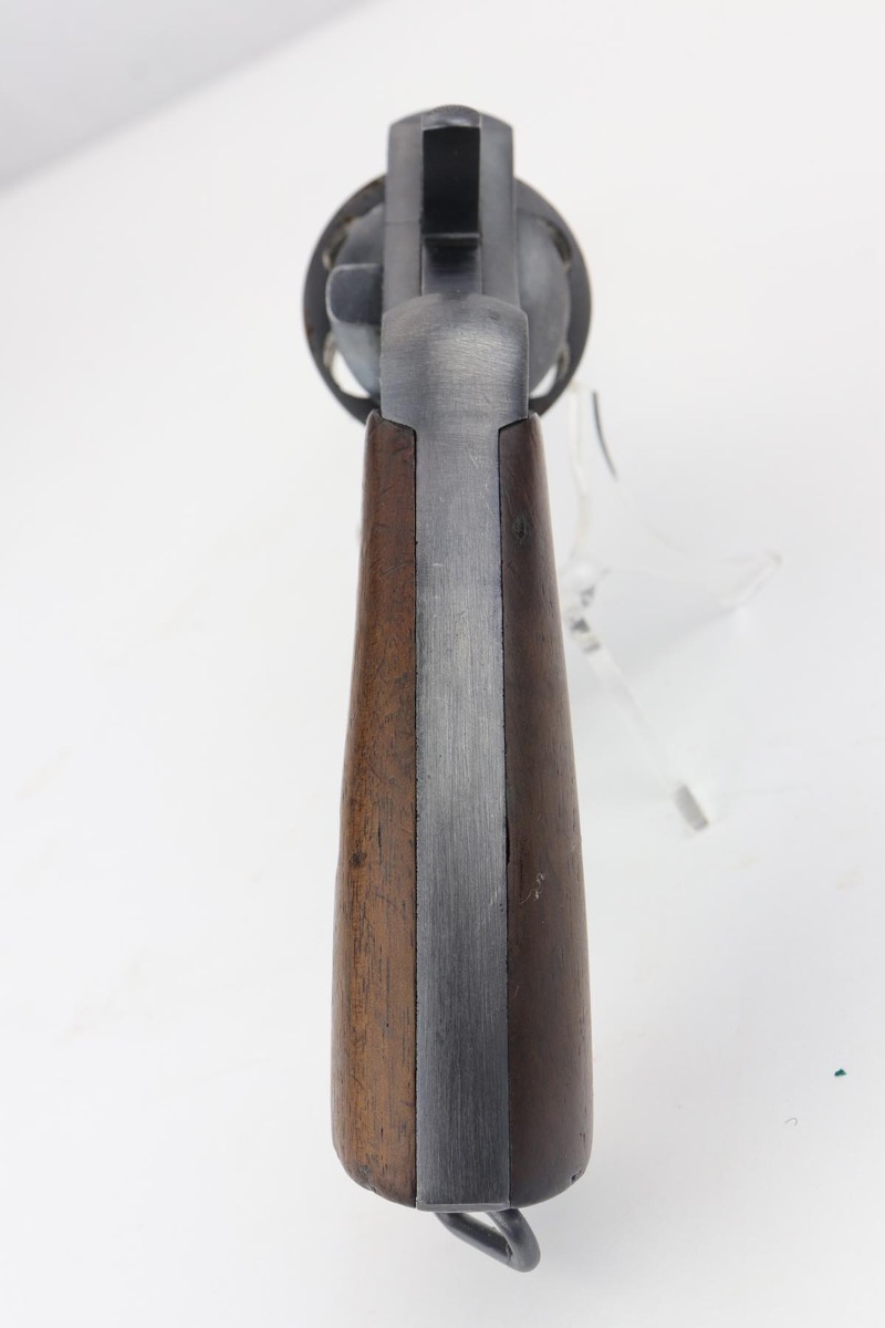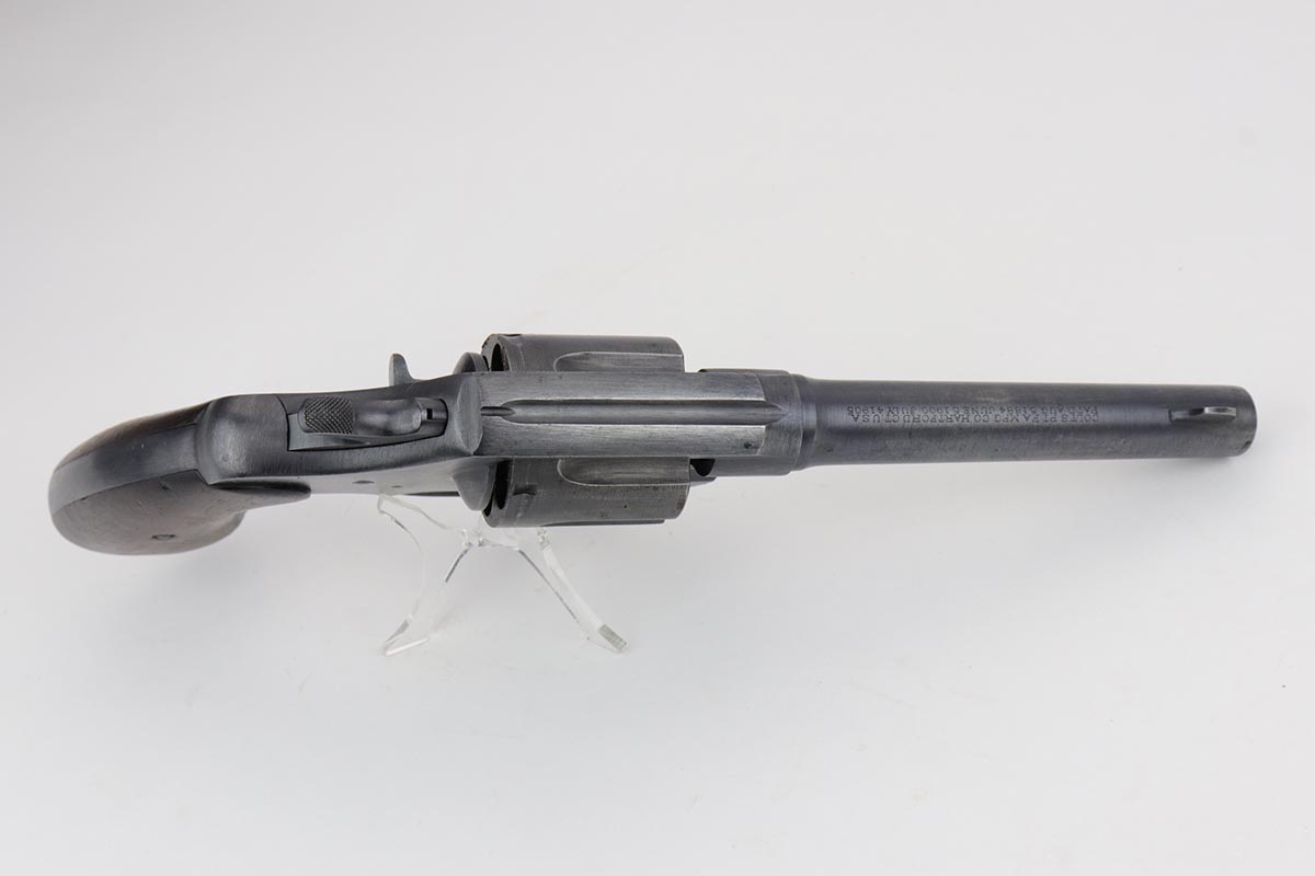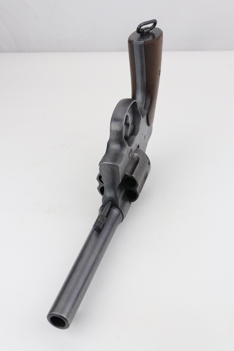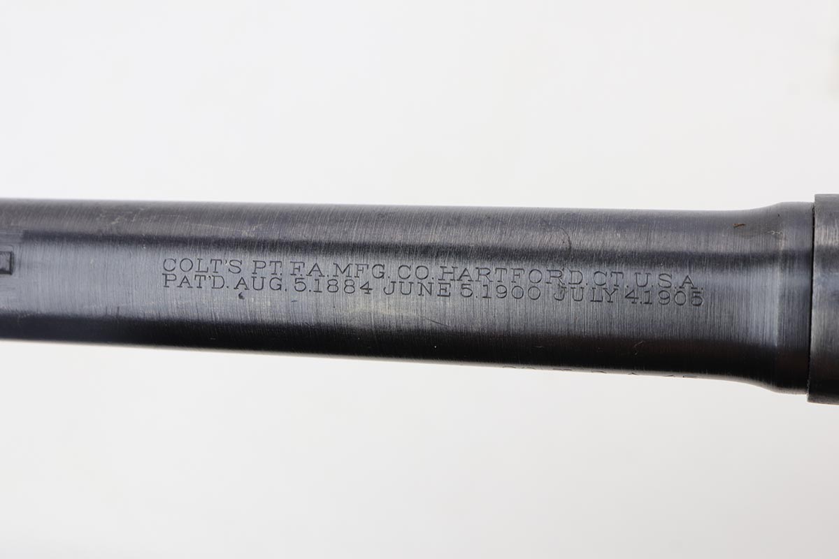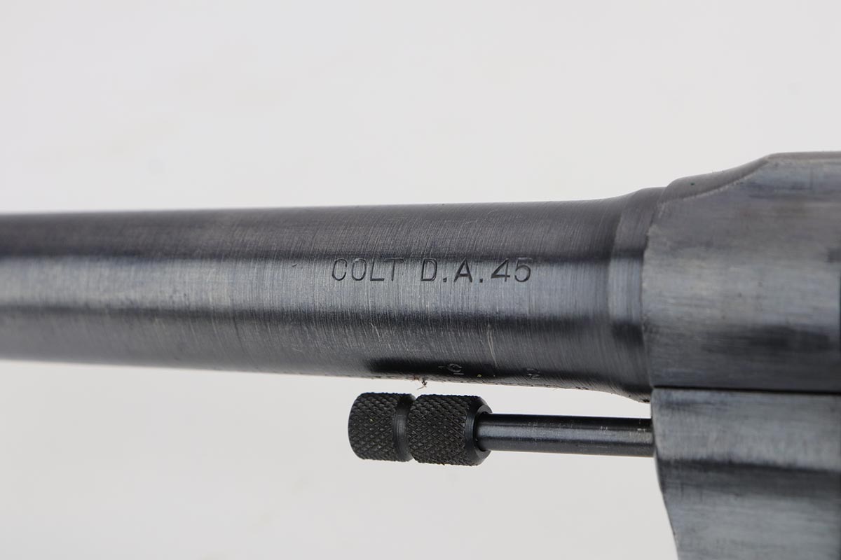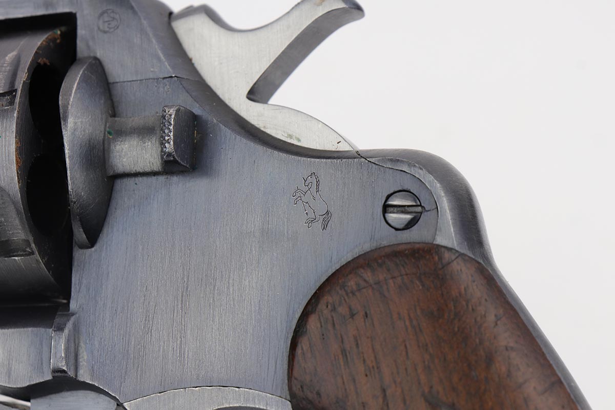 11/22/19 – This is a nice, original example of a US Army Colt M1917 revolver from 1918. It has about 95% of the original blue remaining, with some thinning on the cylinder, right side of frame and left side of barrel. GHS inspection mark is sharply stamped on frame, and barrel is marked UNITED STATES PROPERTY. Terrific bore and smooth action. Left grip panel is hand numbered but mismatched to the gun, and has a small corner chip. The revolver comes with an excellent holster, which is 1944 dated and maker marked to Milwaukee Saddlery Co.