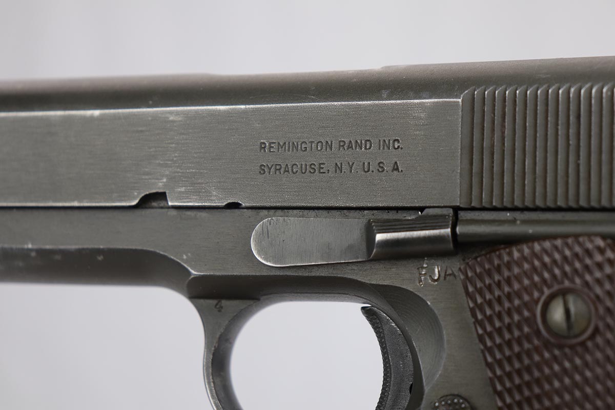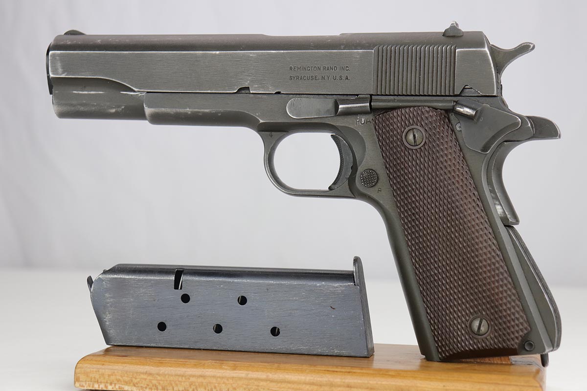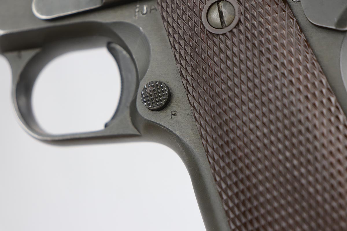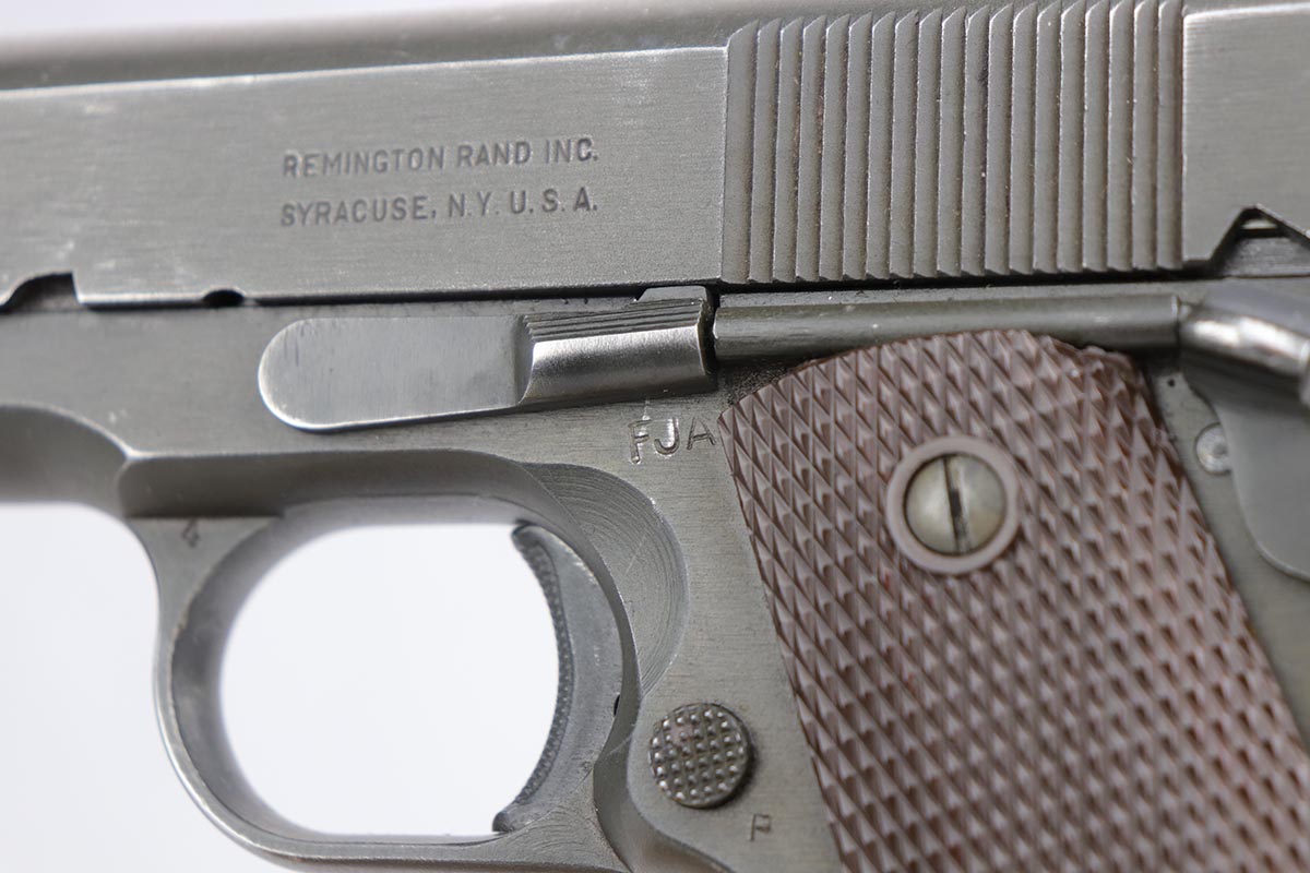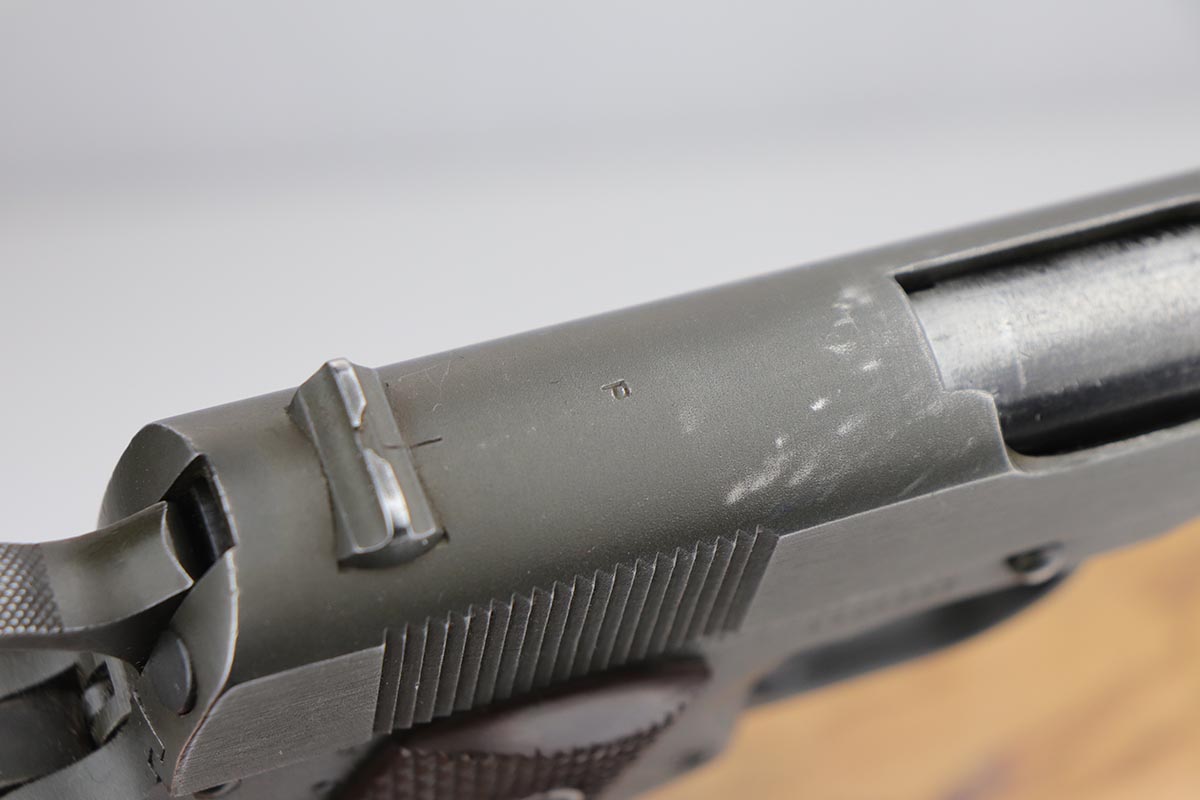 9/24/19 – This is a nice Remington Rand M1911A1 from 1944. It’s all original and correct with proper FJA inspector mark and P proof on slide and frame. The parkerized finish rates at about 92-94% with a few minor patches of finish loss in several areas, most notably the trigger guard and top of the slide. Correct ‘HS’ barrel with strong, shiny bore. Excellent grips. ‘L’ marked magazine.
