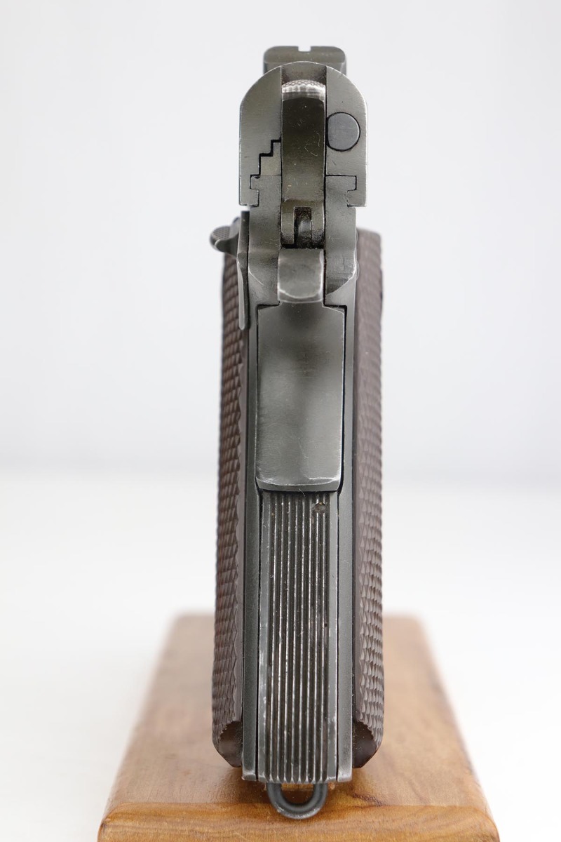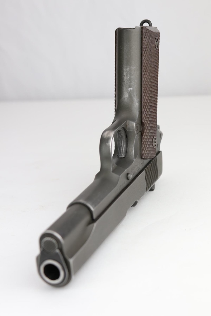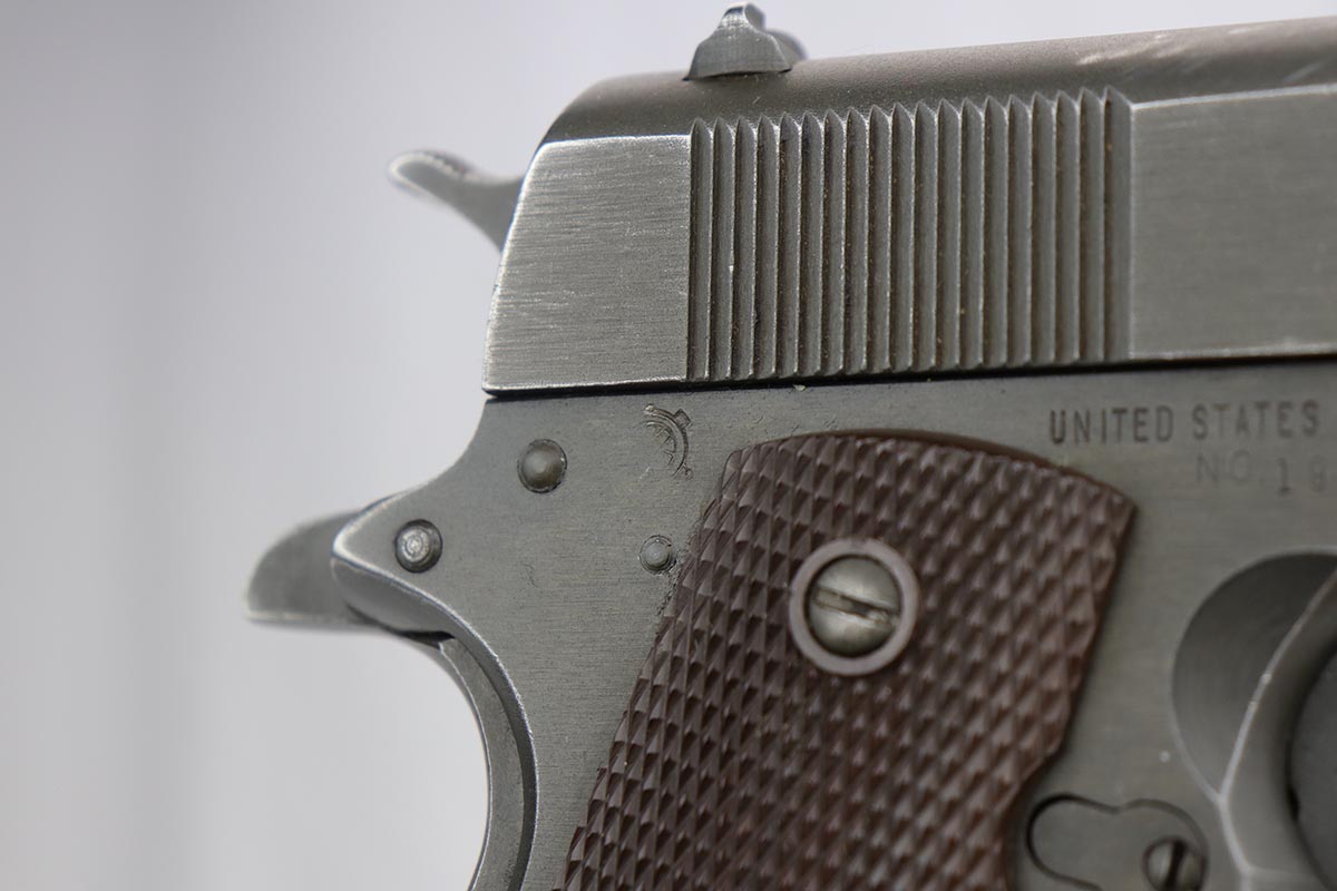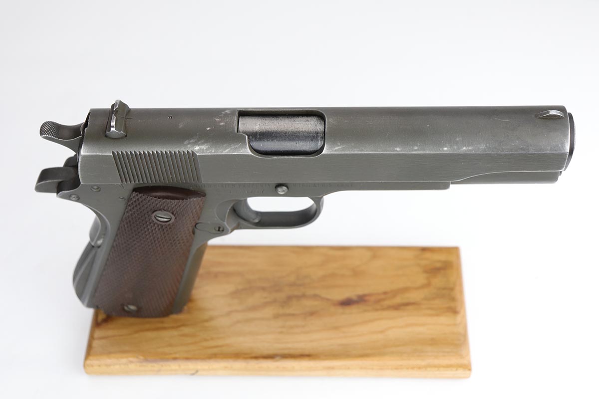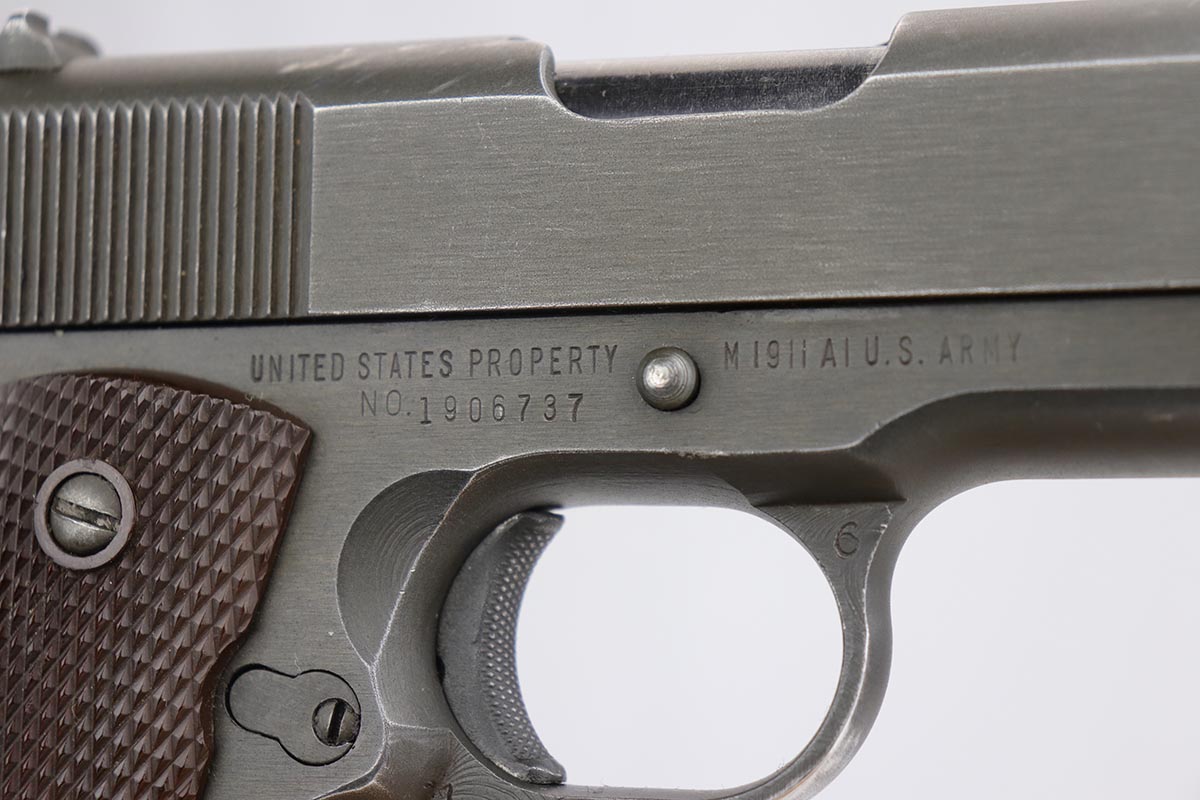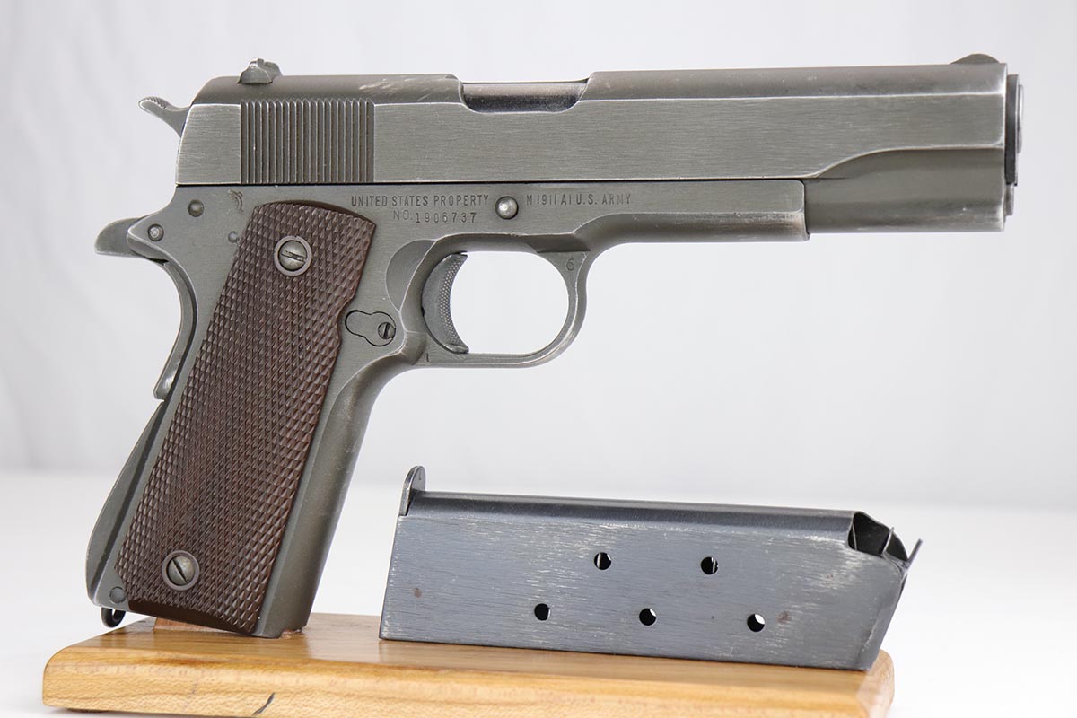 9/24/19 – This is a nice Remington Rand M1911A1 from 1944. It’s all original and correct with proper FJA inspector mark and P proof on slide and frame. The parkerized finish rates at about 92-94% with a few minor patches of finish loss in several areas, most notably the trigger guard and top of the slide. Correct ‘HS’ barrel with strong, shiny bore. Excellent grips. ‘L’ marked magazine.