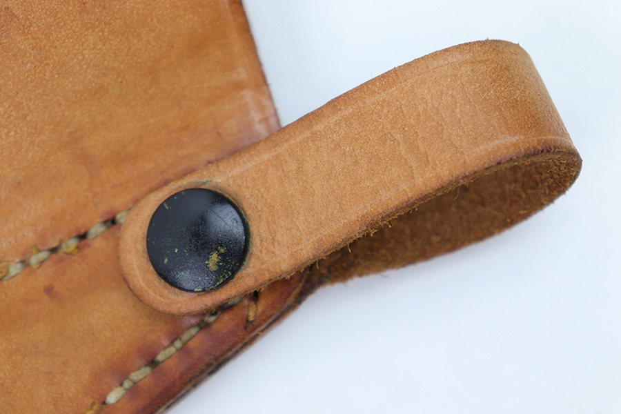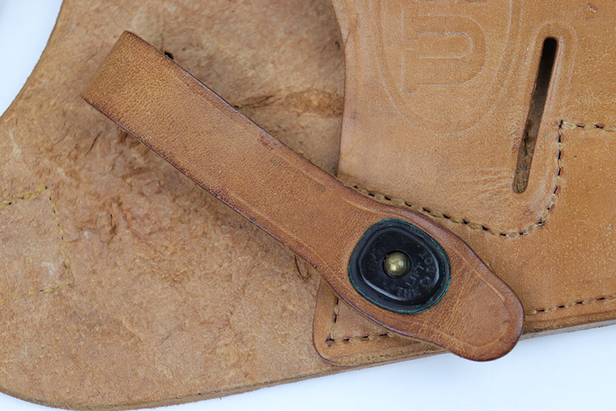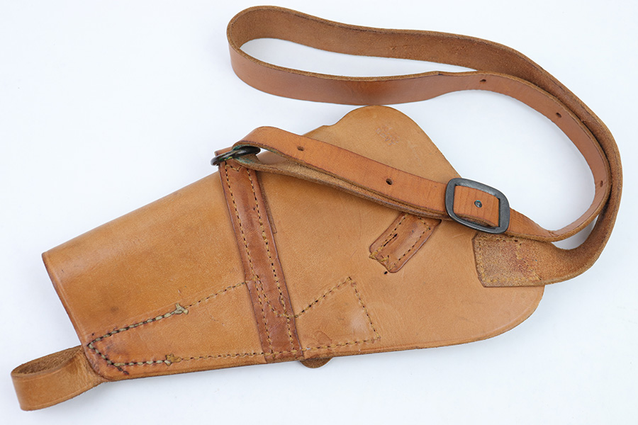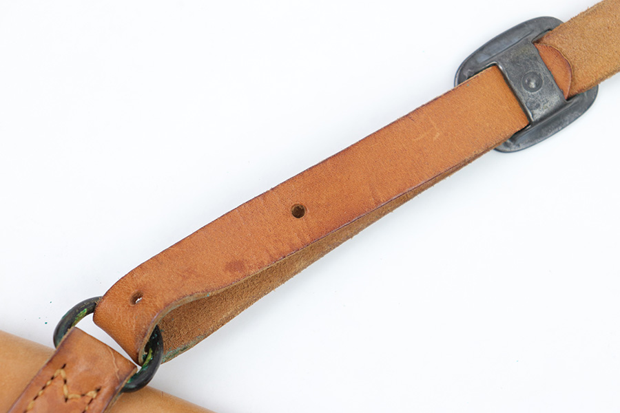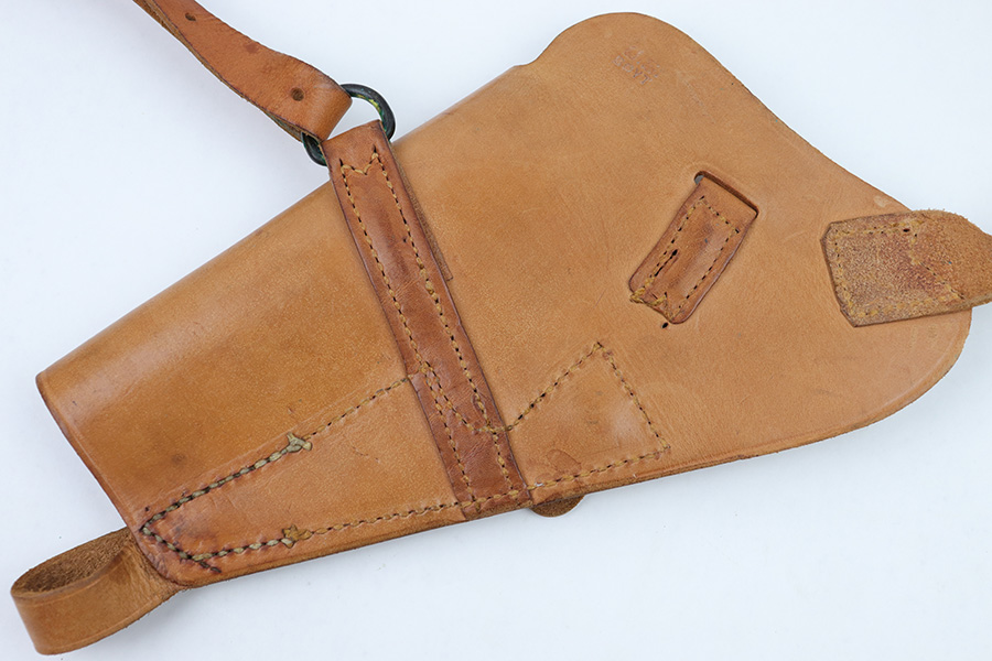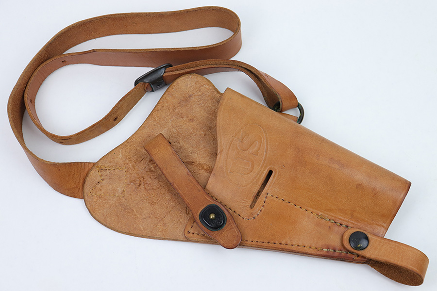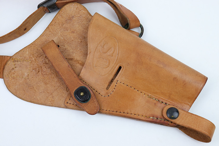 1/19/23 – This is an excellent, near mint condition US M3 shoulder holster by BOYT. The holster is maker stamped on the back leather. There’s no date stamp, but we think this is likely late WW2 production that was never issued. The light brown leather is clean and firm throughout with no major issues. The stitching is all tight and without issue as well. Excellent leather shoulder strap.