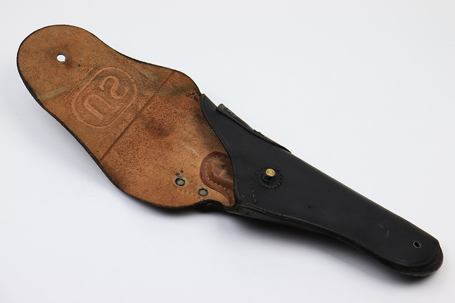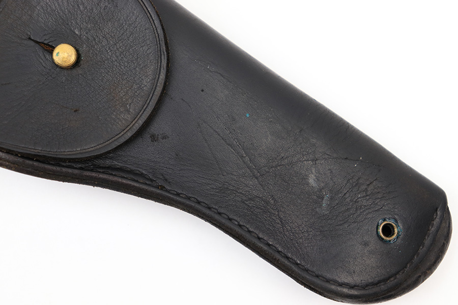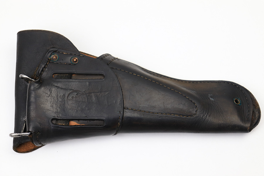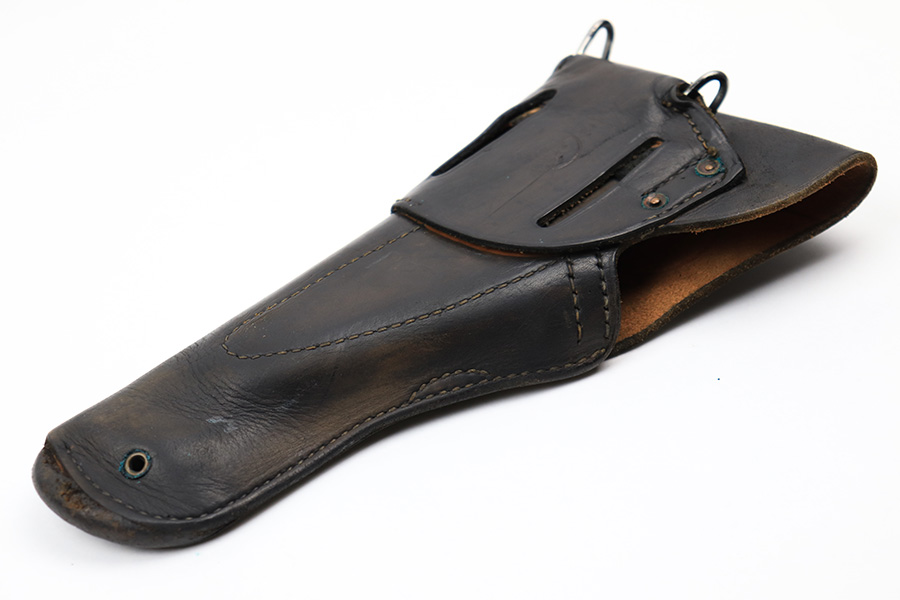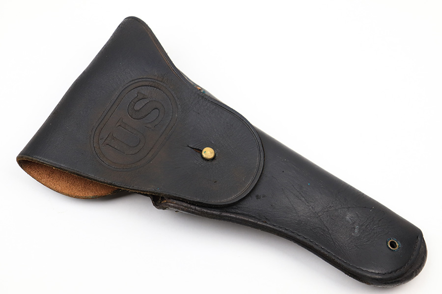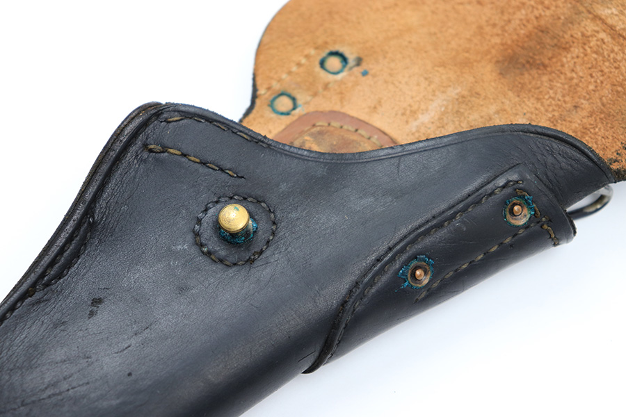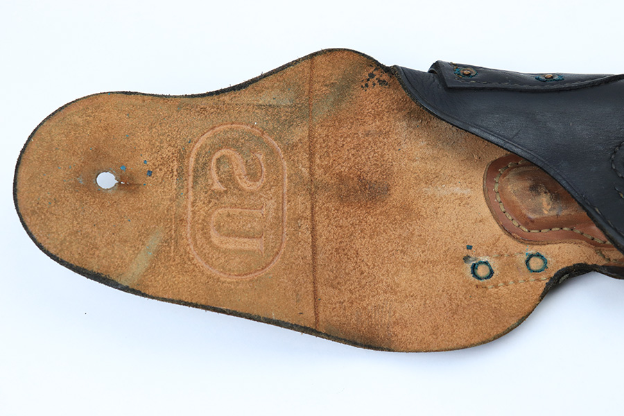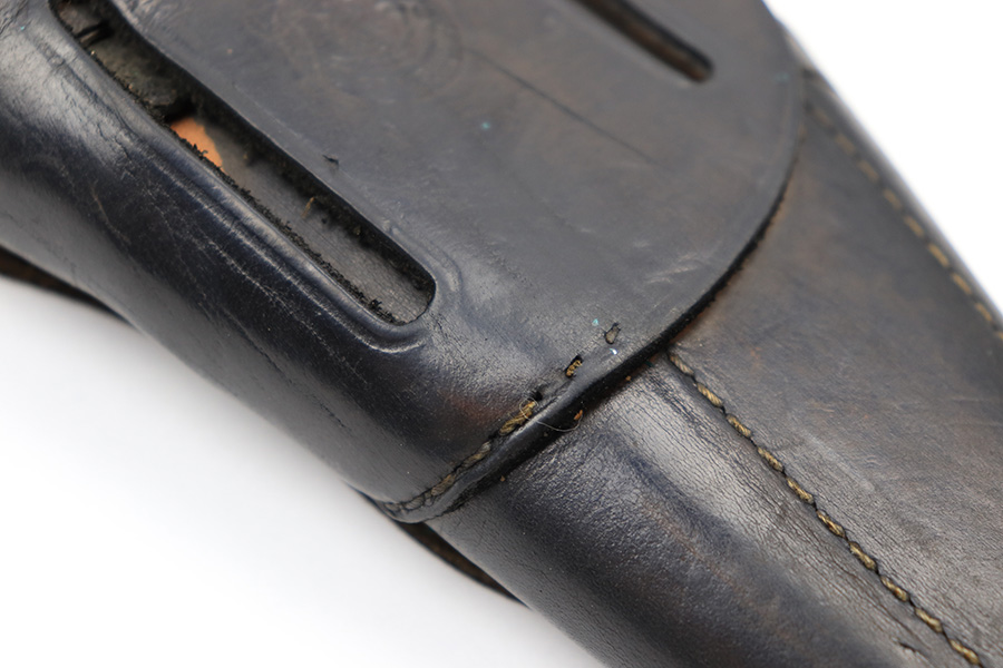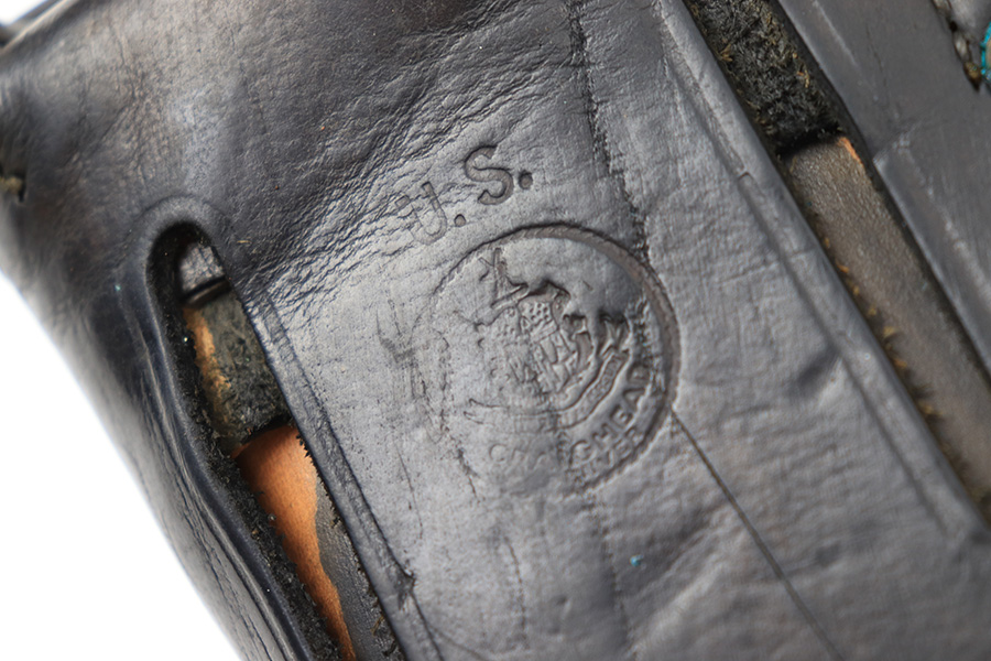 7/6/22 – This is an original WW2 era production US Craighead M1916 holster for the M1911A1 pistol. The holster has nice black leather and stitching. The leather is pliable showing typical signs of previous use and aging, but no excessive wear. The back leather is maker stamped, and the front leather is US stamped as shown. Clean interior leather and no notable stitching issues.