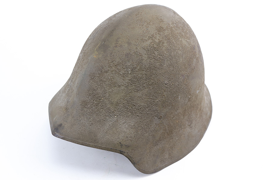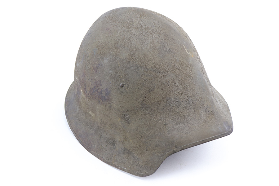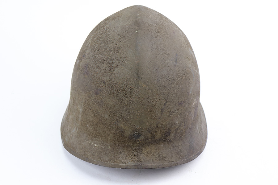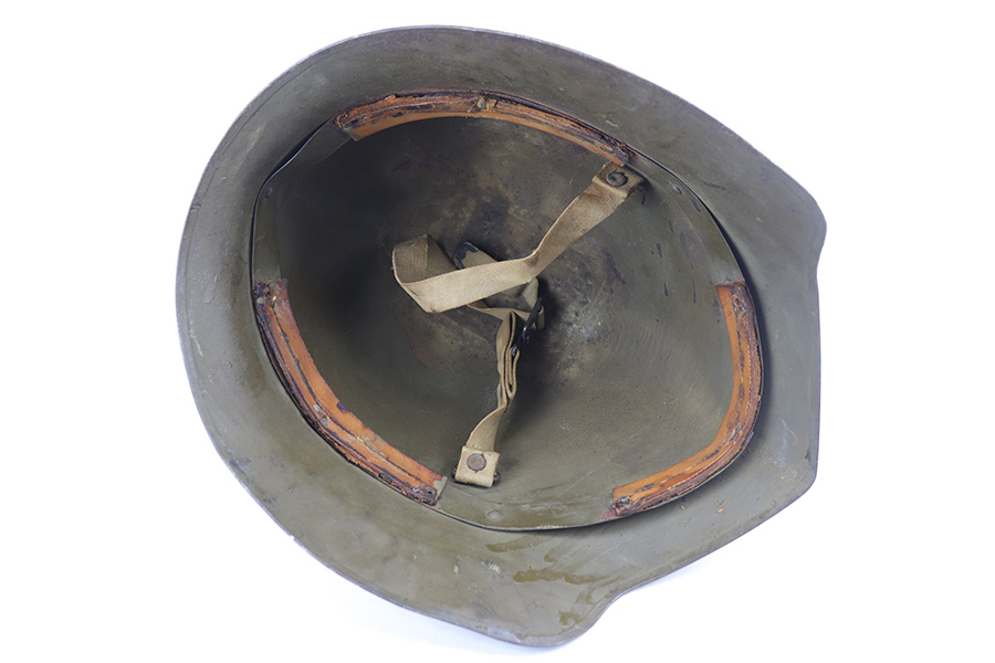 10/12/21 – This is a rare US Experimental helmet for use during WW1. Developed in 1917, this is one of 15 numbered helmet prototypes the US made. The No. 2 was based on helmets of 15th century Greece and Italy. The helmet was rejected by the US military due to being too similar to the German M1916 helmet. About 2000 of these were made by Ford Motors. The helmet has a rough exterior with mild patina. The interior consists of three leather strips, which likely had leather pads attached, but have since fallen off. The chin strap is still completely in tact – canvas material in good condition. No major dents or issues on the metal.
