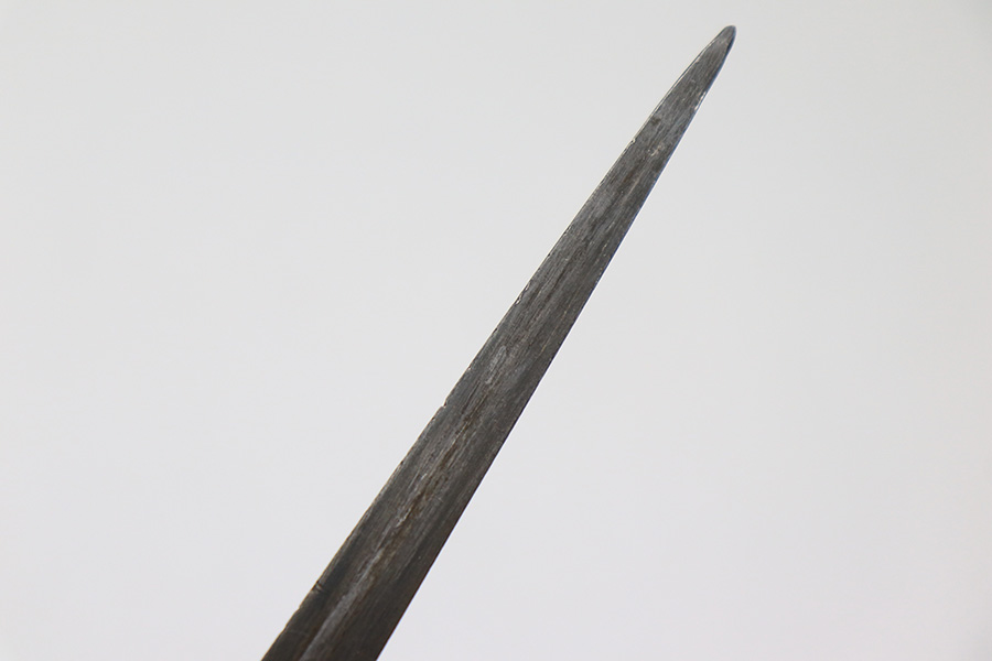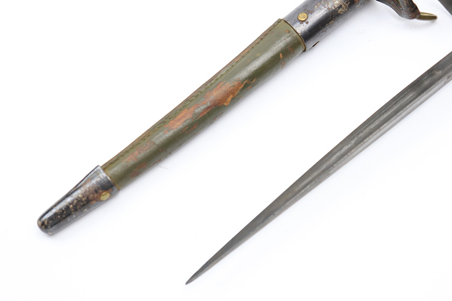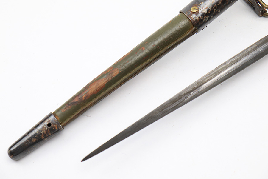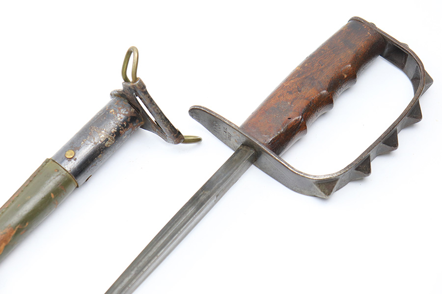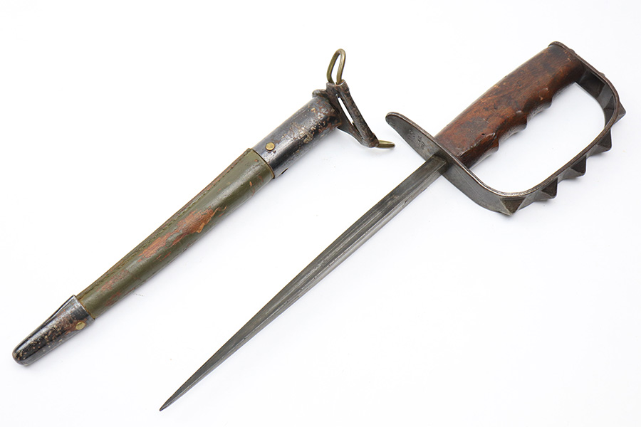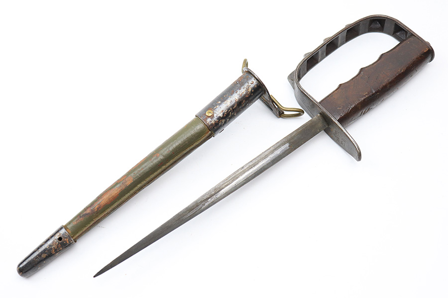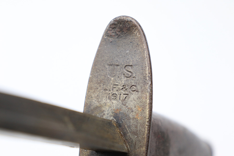 5/11/22 – This is an original WW1 production trench fighting knife. The knuckle knife comes with an original scabbard, although the scabbard pins appear to be replaced, and one of the pins is missing from the toe piece of metal. The blade has some finish loss and typical scabbard wear along with a few small nicks along the edges. This is typical aging and use wear, and there’s still a good amount of original finish intact. The hand guard shows surface patina throughout and some mild corrosion around the L.F.&C. maker stamp and date. The wood handle is original and in great condition. The scabbard is maker stamped Jewell and dated 1918.