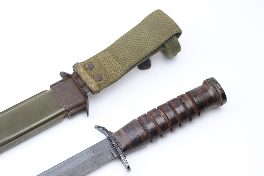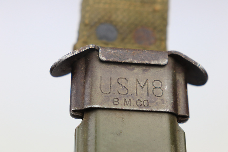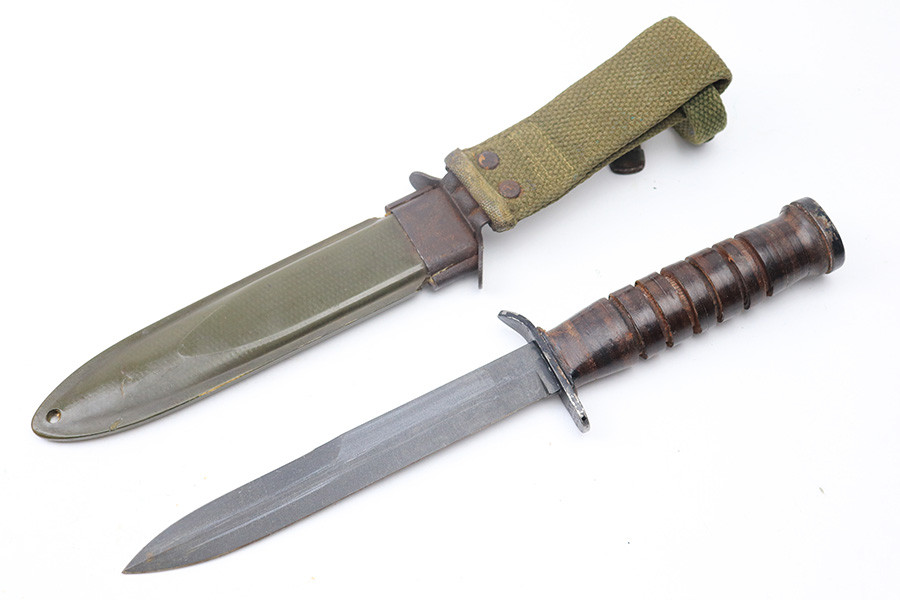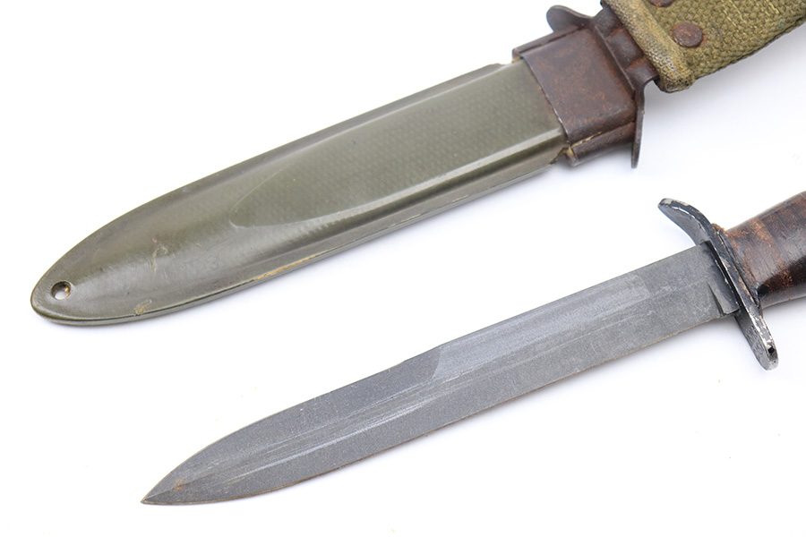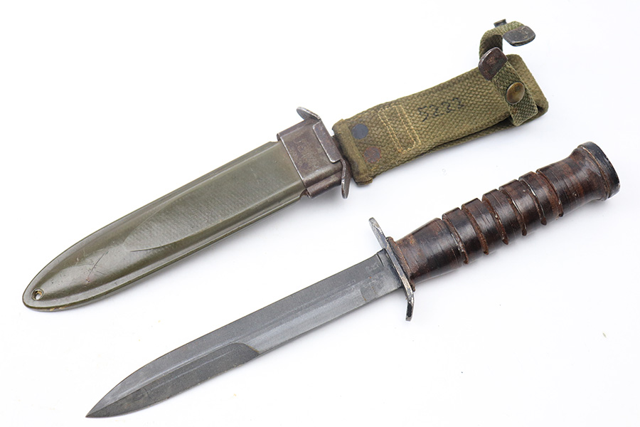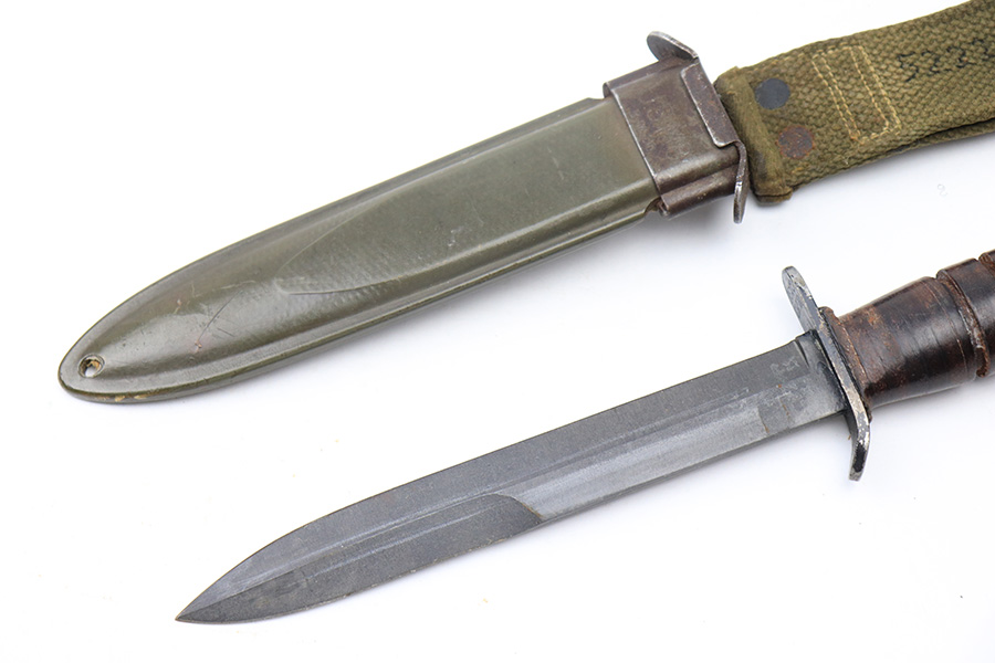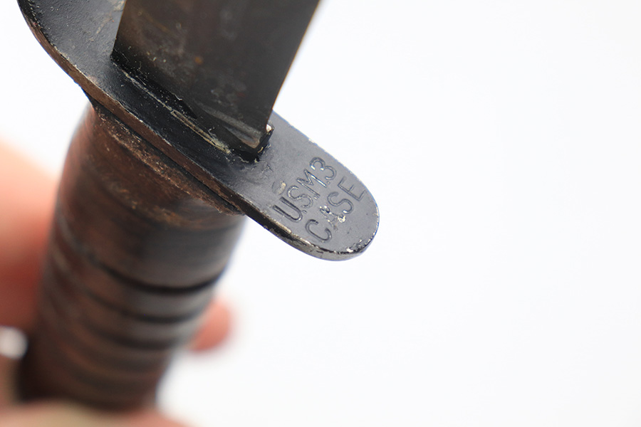 5/31/22 – This is an original US M3 Fighting knife by Case with a period-correct M8 Scabbard. The blade has a nice dull parkerized finish with a clean edge and some mild scabbard wear throughout. The hand guard and pommel have a black painted finish and show some mild patina and finish loss. The hand guard is maker stamped by Case, and the pommel is ordnance stamped. The leather handle is excellent. The scabbard has some typical signs of aging but no major issues.