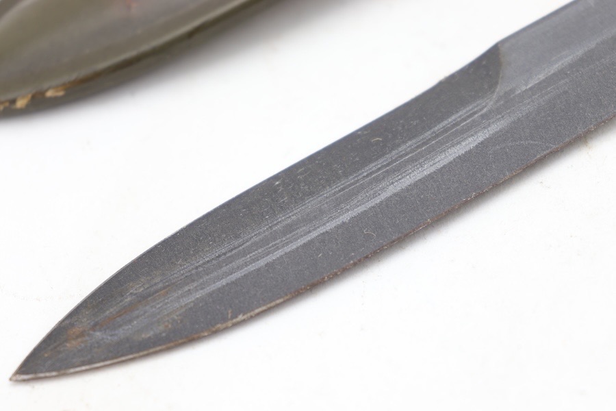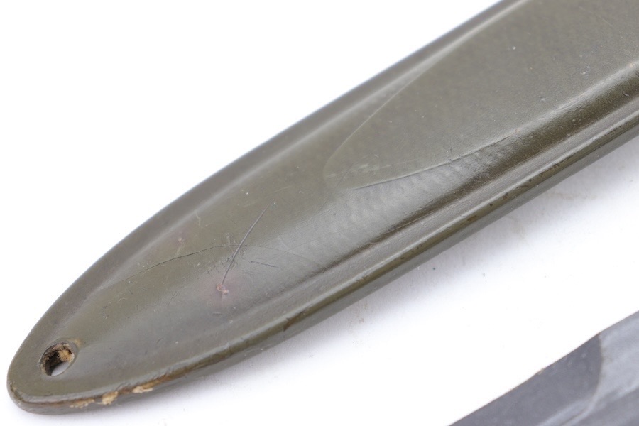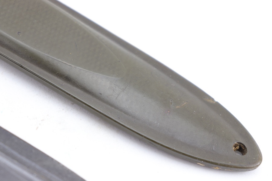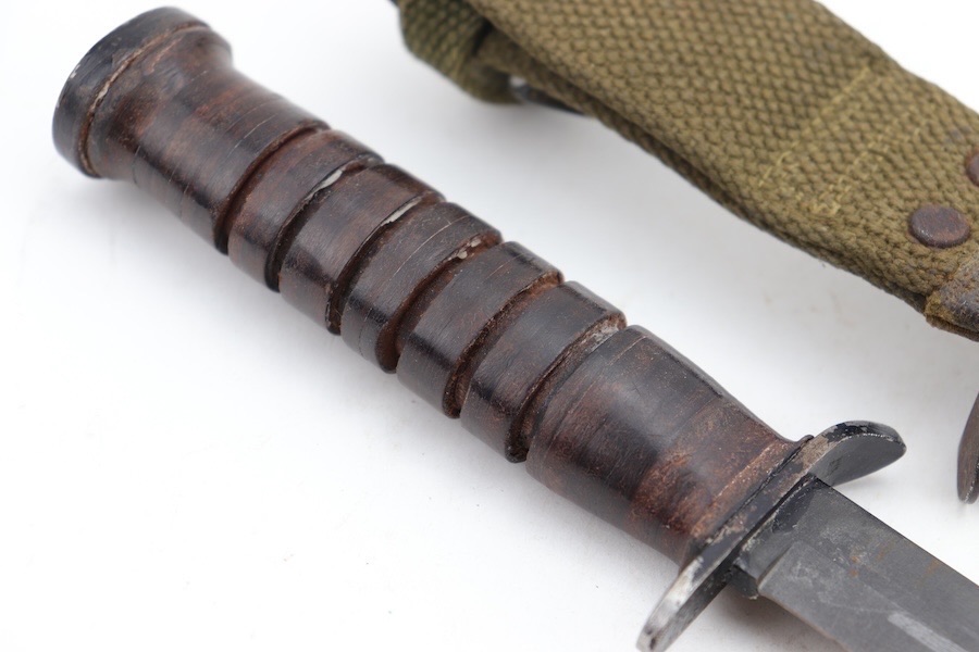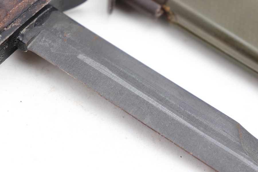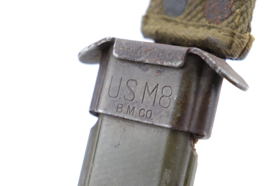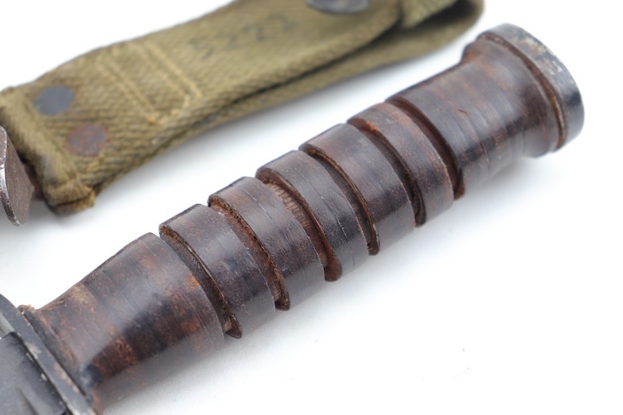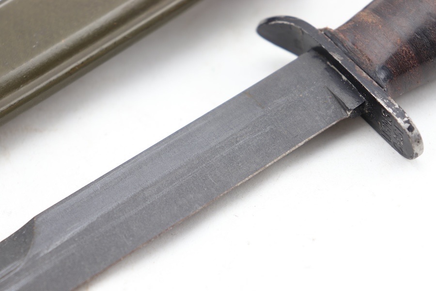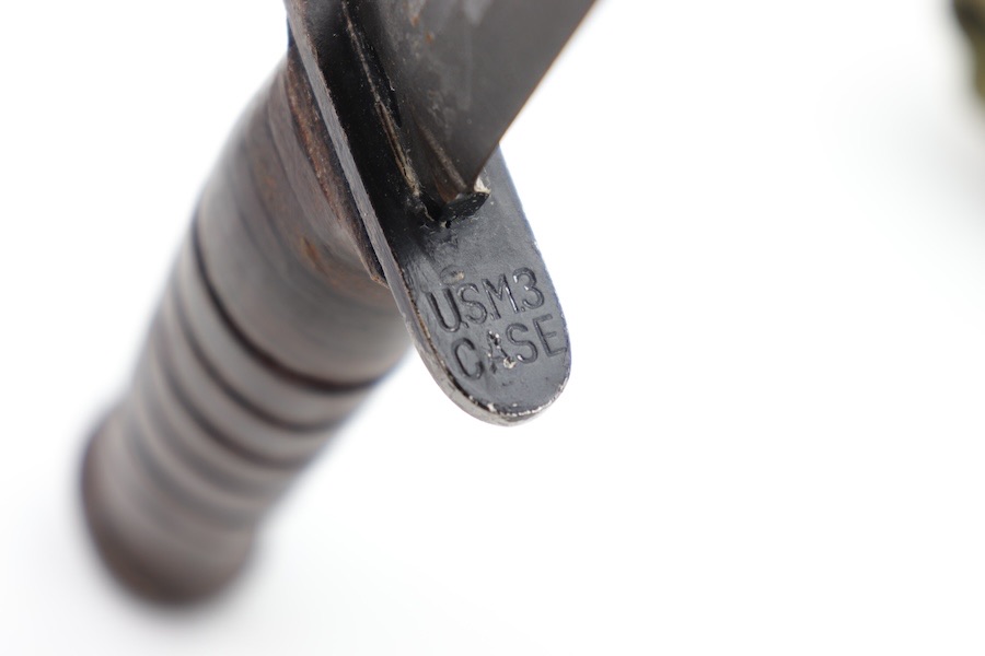 9/11/24 – This is an original US M3 Fighting knife by Case with a period-correct M8 Scabbard. The blade has a nice dull parkerized finish with a clean edge and some mild scabbard wear throughout. The hand guard and pommel have a black painted finish and show some mild patina and finish loss. The hand guard is maker stamped by Case, and the pommel is ordnance stamped. The leather handle is excellent. The scabbard has some typical signs of aging but no major issues.