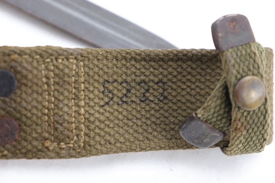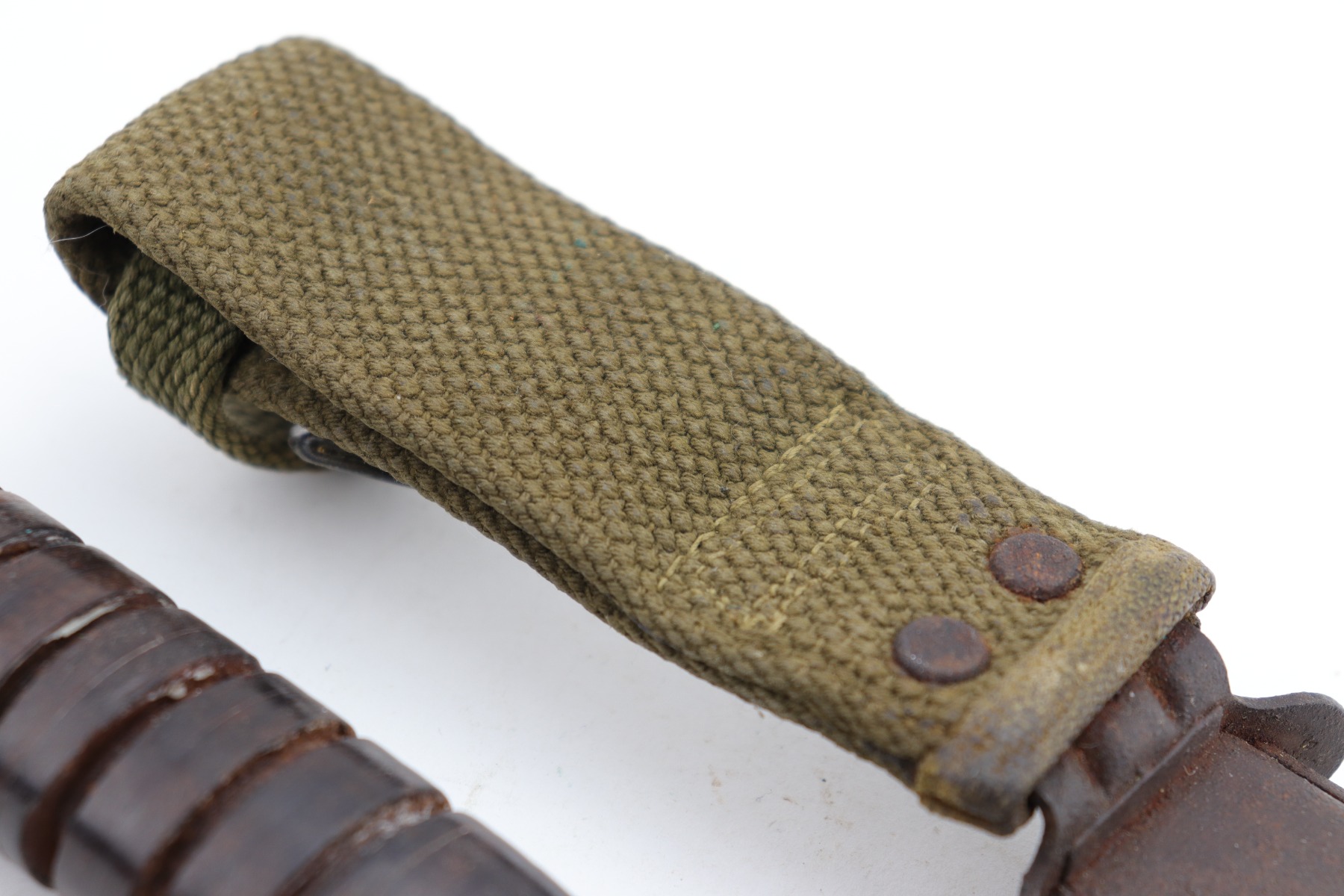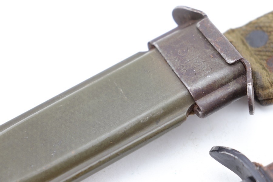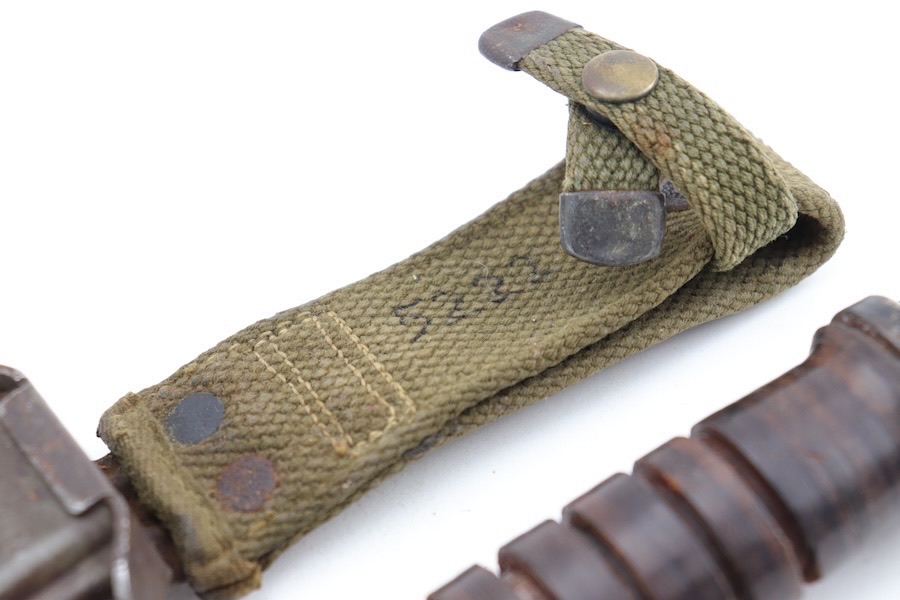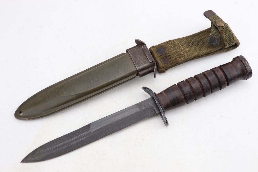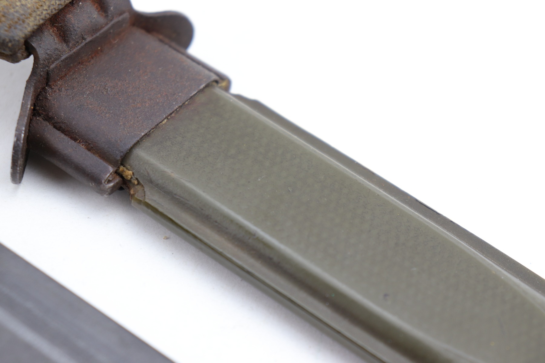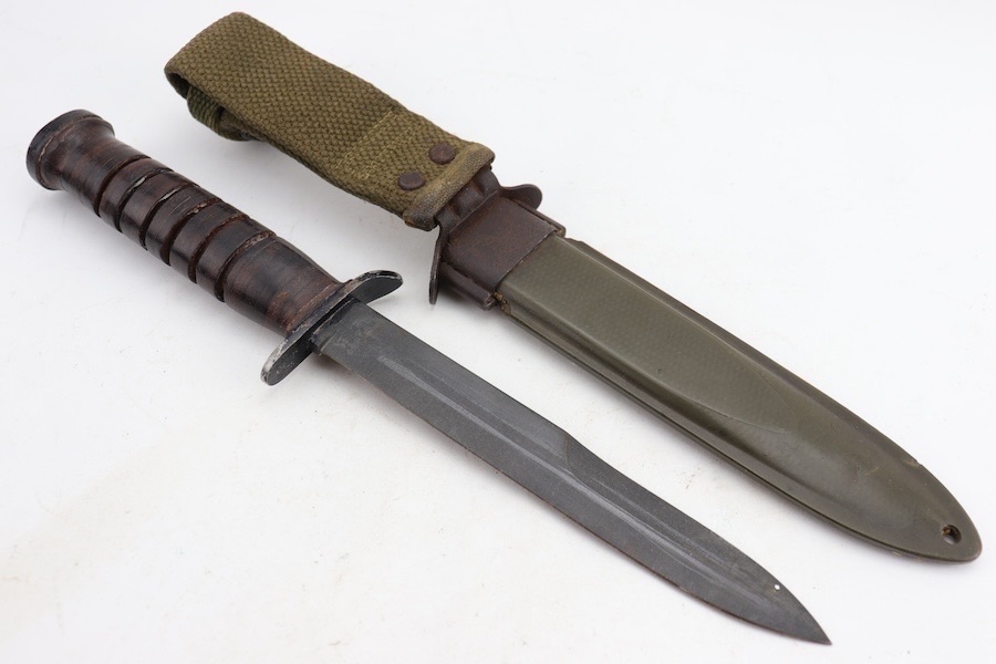 9/11/24 – This is an original US M3 Fighting knife by Case with a period-correct M8 Scabbard. The blade has a nice dull parkerized finish with a clean edge and some mild scabbard wear throughout. The hand guard and pommel have a black painted finish and show some mild patina and finish loss. The hand guard is maker stamped by Case, and the pommel is ordnance stamped. The leather handle is excellent. The scabbard has some typical signs of aging but no major issues.
