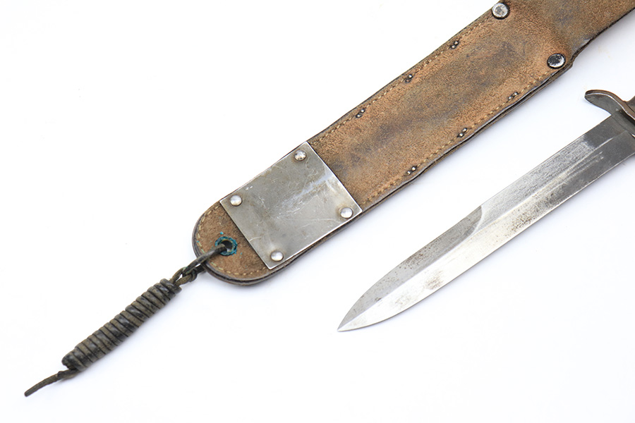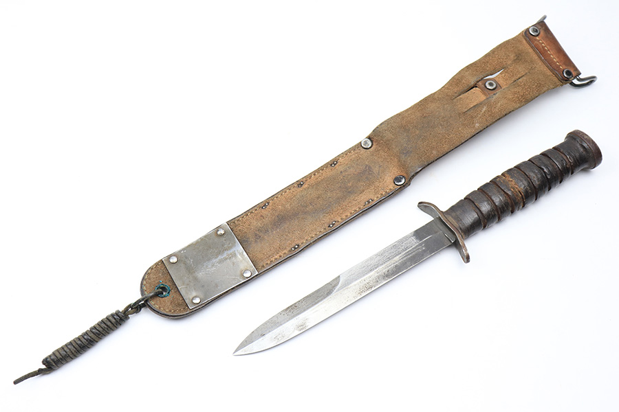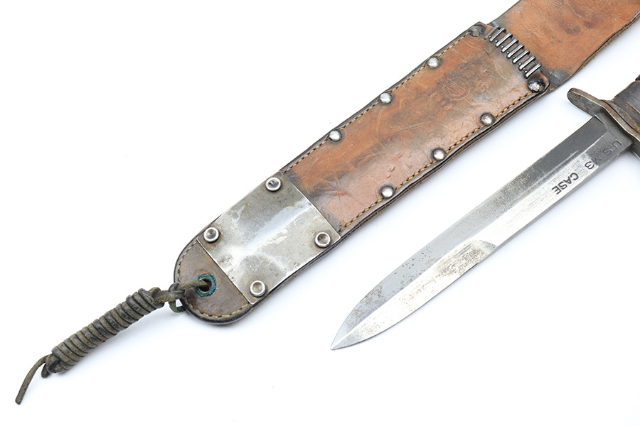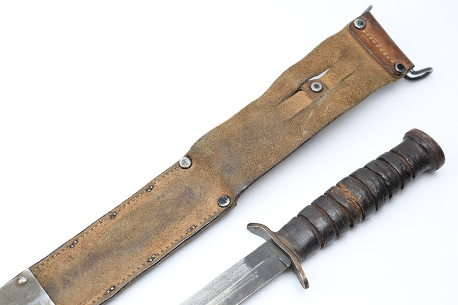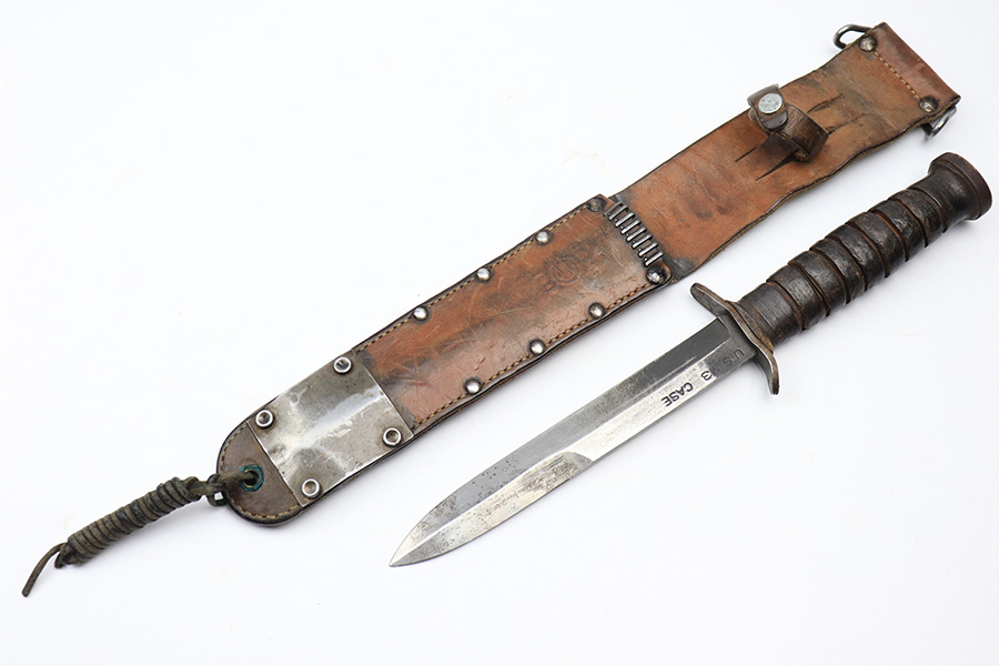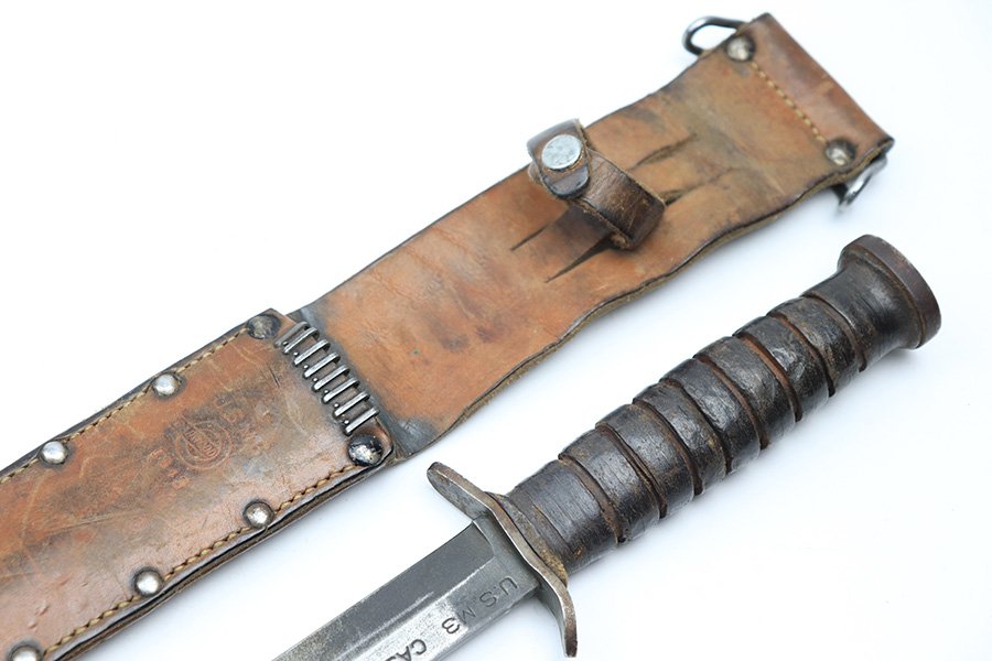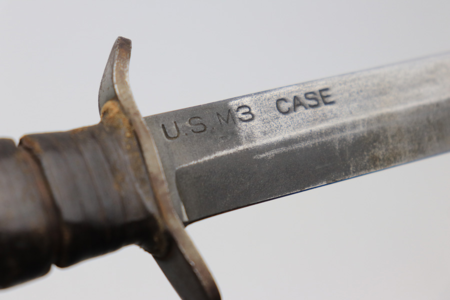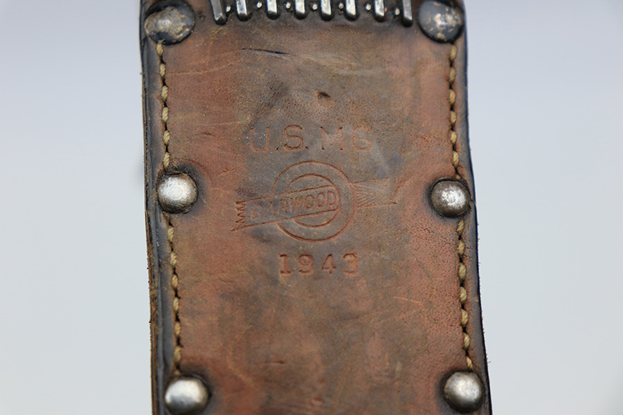 3/10/22 – This is an original US M3 fighting knife with a leather M6 scabbard. The knife is maker stamped “CASE” as shown. The blade has missing finish throughout and some light surface patina but no rust or pitting. No signs of sharpening either. The hand guard and pommel both have dark patina throughout. The leather handle has some mild surface wear but no major issues. The scabbard is maker stamped by Barwood and 1943 dated. Excellent stitching and metal fixtures, with some typical surface wear and signs of aging.