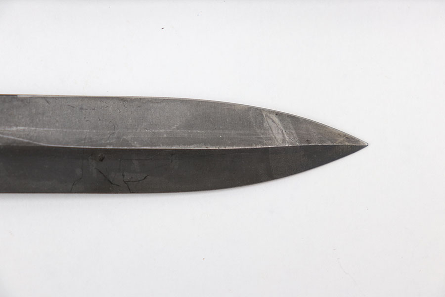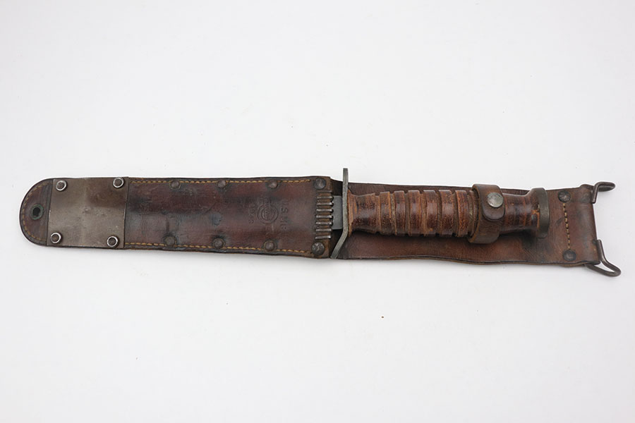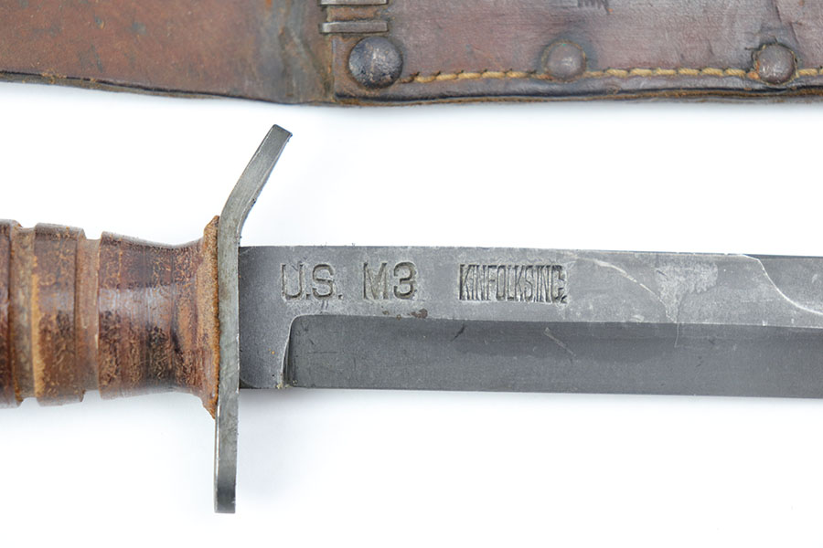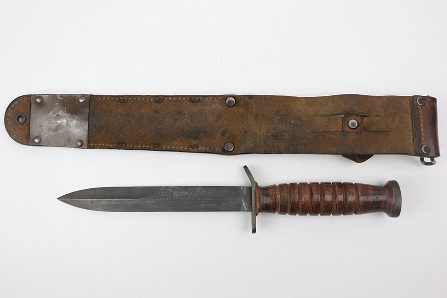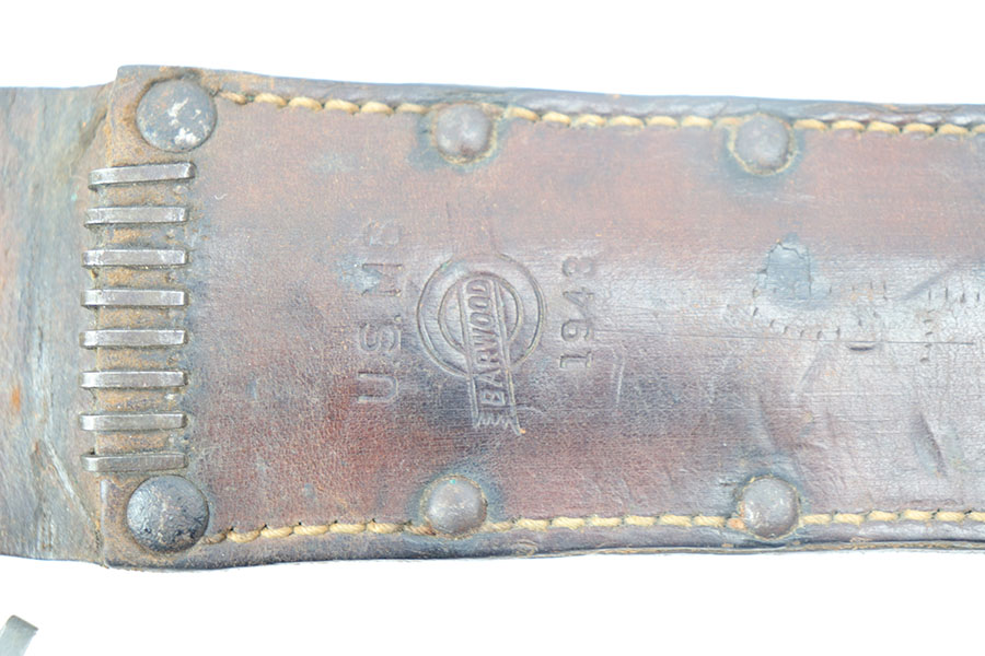 12/21/20 – This is a fairly scarce US M3 fighting knife made by Kinfolks Inc. Only about 135,000 of these knives were made, being the 5th scarcest m3 manufacturer. The blade is in great shape with only some very light discoloration and scabbard wear. The handle is excellent and there’s a strong US flaming bomb ordnance stamp on the pommel. Comes with a beautiful leather M6 scabbard made by Barwood, who is a very scarce maker of these scabbards, only making about 29,000 during WW2.