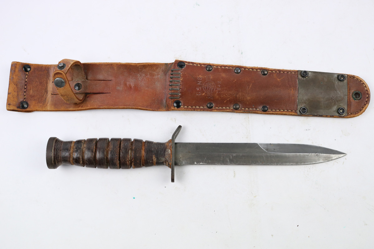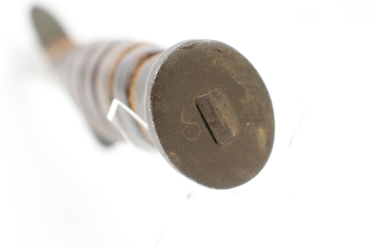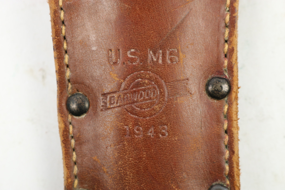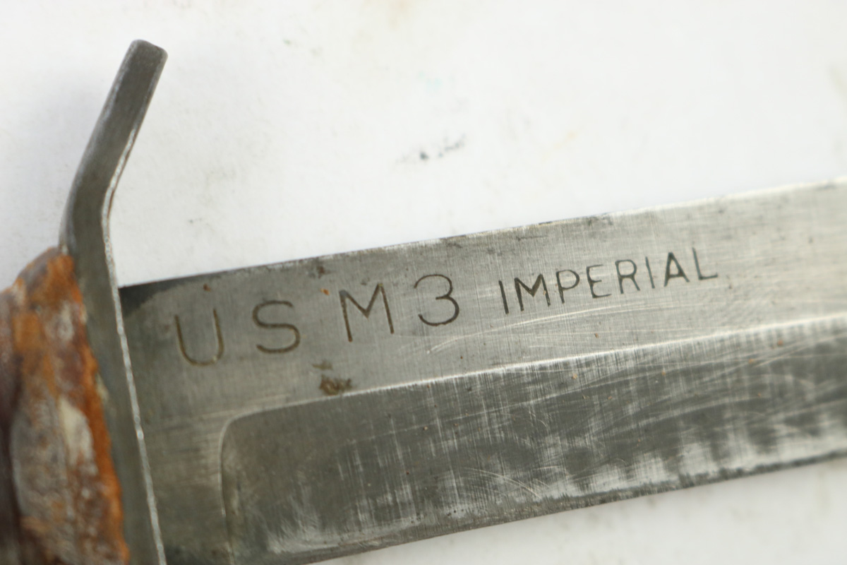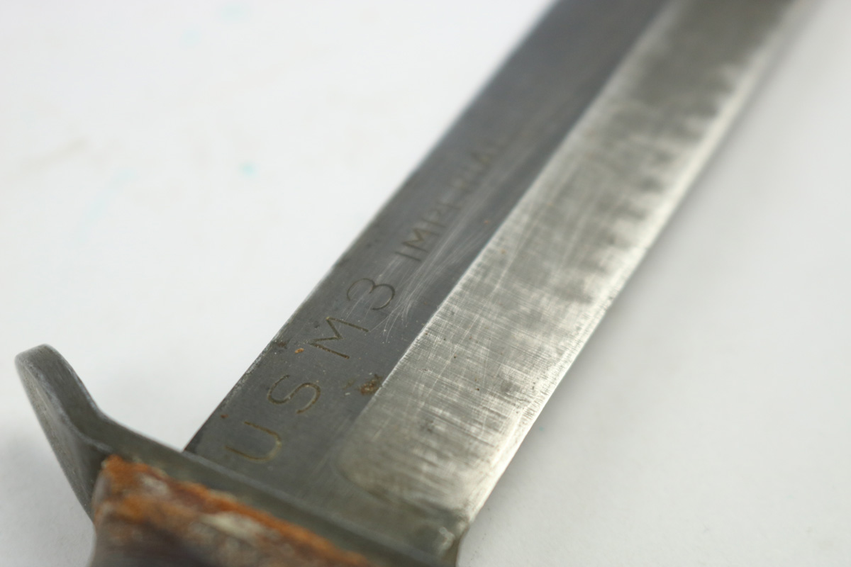8/15/18 – This is an original US M3 fighting knife made by Imperial in 1943 for use during WW2. The knife comes with a beautiful original US M6 leather scabbard. The scabbard has normal wear but is completely in tact and original. Made by Barwood. Barwood scabbards are uncommon and often sought out by collectors. The blade has a leather handle, is ordnance stamped on the pommel, and has light surface wear. Some of the finish is worn off, and there are light signs of use, but no signs of sharpening. Guaranteed original and authentic.