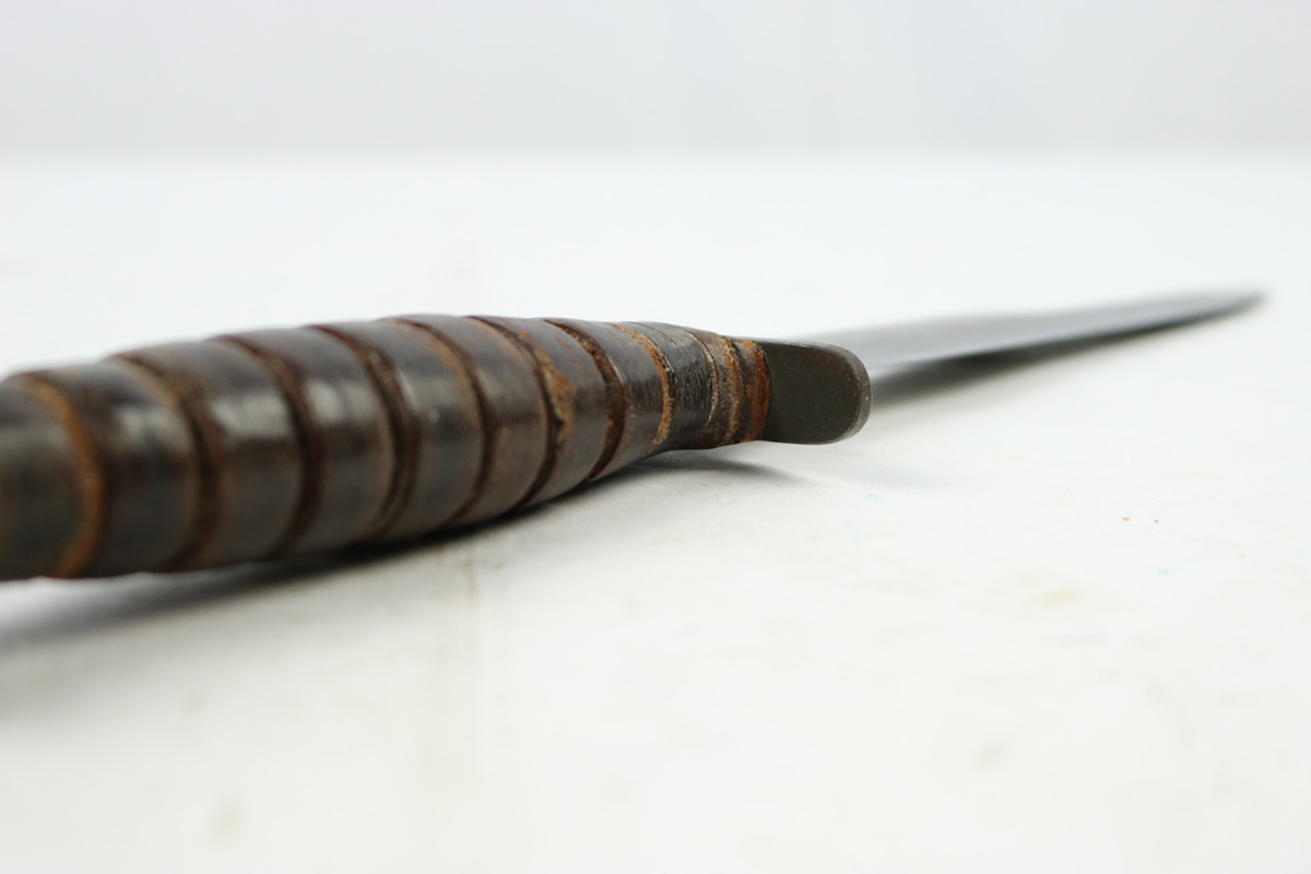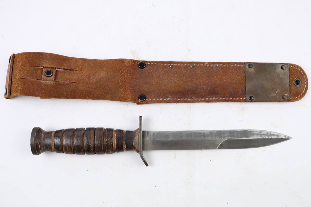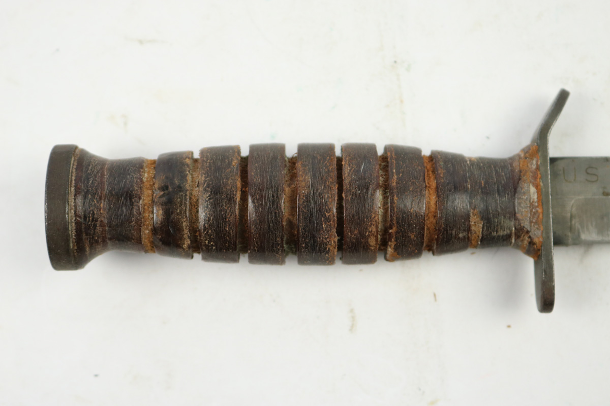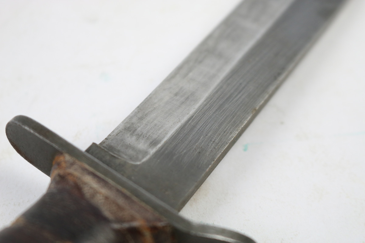 8/15/18 – This is an original US M3 fighting knife made by Imperial in 1943 for use during WW2. The knife comes with a beautiful original US M6 leather scabbard. The scabbard has normal wear but is completely in tact and original. Made by Barwood. Barwood scabbards are uncommon and often sought out by collectors. The blade has a leather handle, is ordnance stamped on the pommel, and has light surface wear. Some of the finish is worn off, and there are light signs of use, but no signs of sharpening. Guaranteed original and authentic.