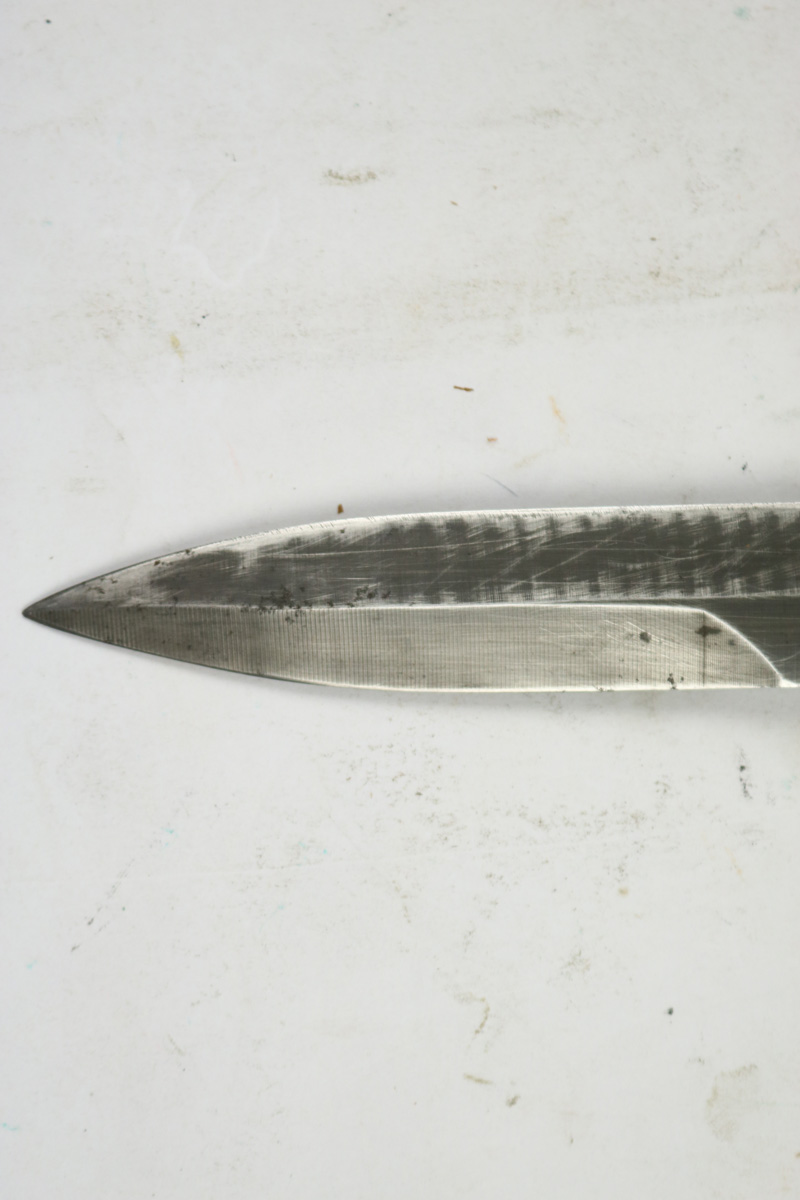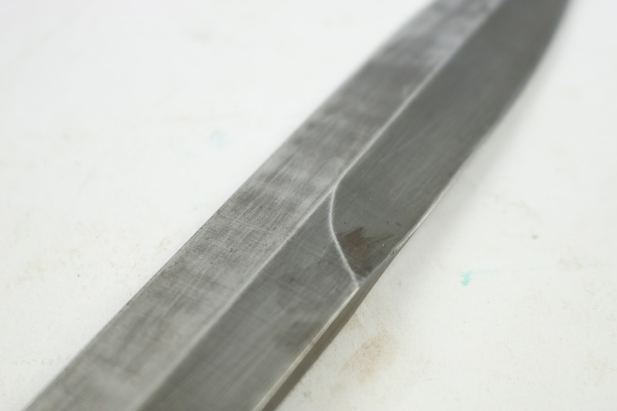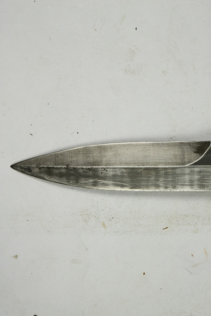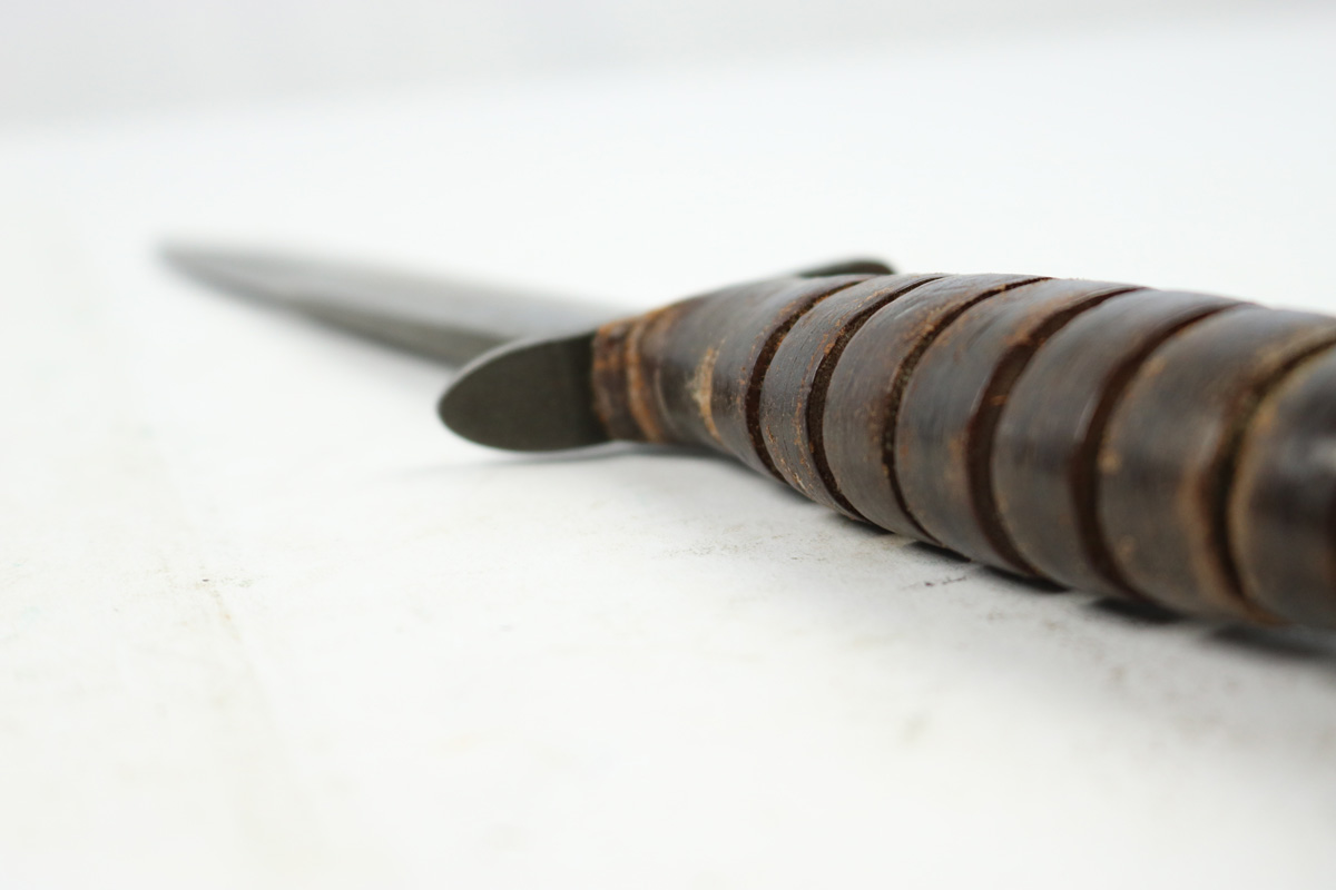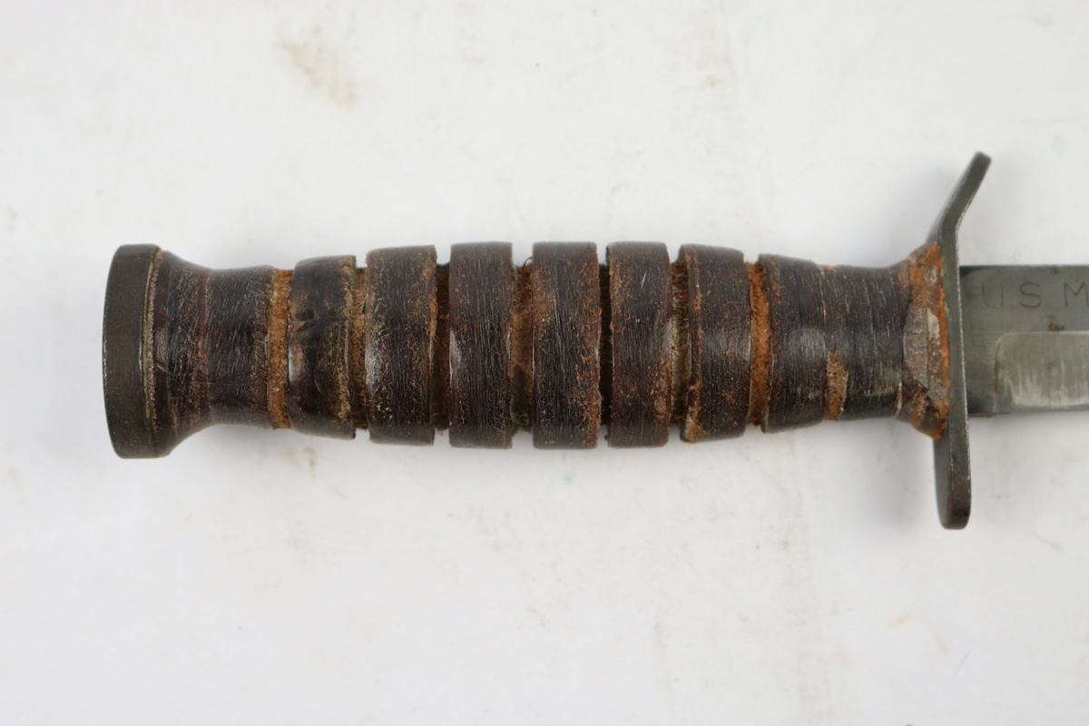 8/15/18 – This is an original US M3 fighting knife made by Imperial in 1943 for use during WW2. The knife comes with a beautiful original US M6 leather scabbard. The scabbard has normal wear but is completely in tact and original. Made by Barwood. Barwood scabbards are uncommon and often sought out by collectors. The blade has a leather handle, is ordnance stamped on the pommel, and has light surface wear. Some of the finish is worn off, and there are light signs of use, but no signs of sharpening. Guaranteed original and authentic.