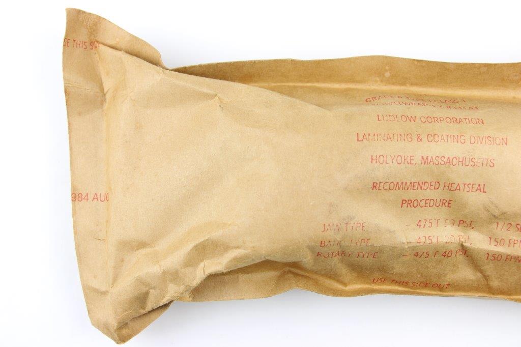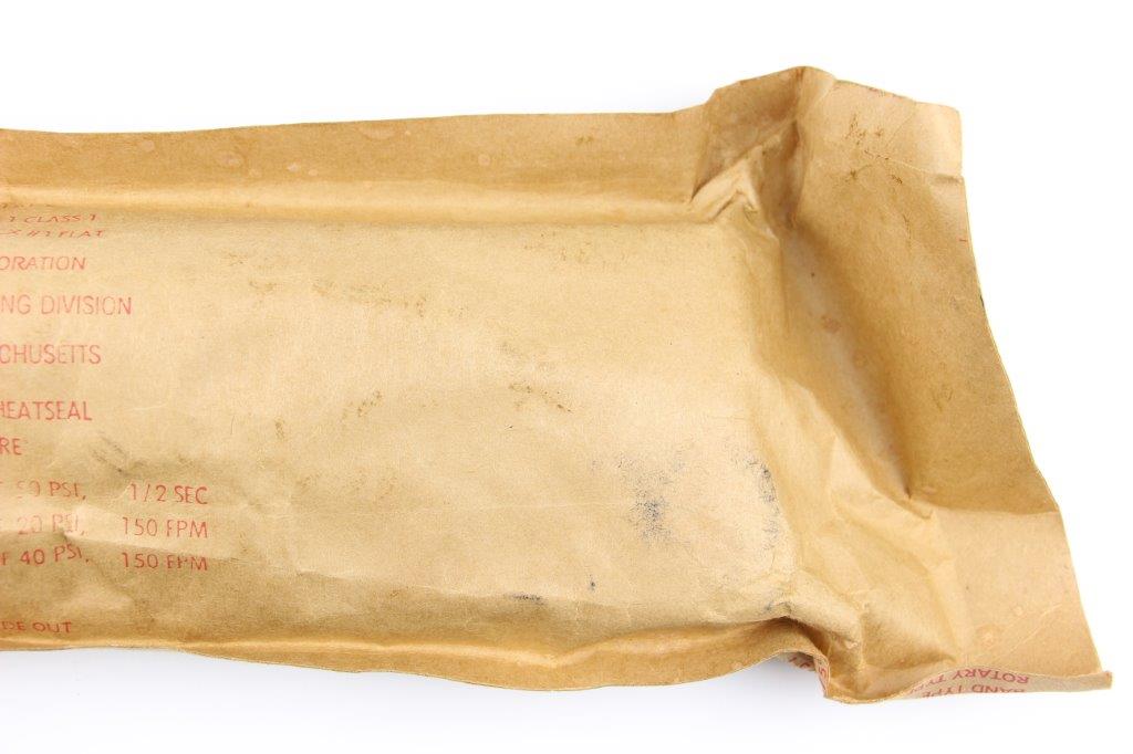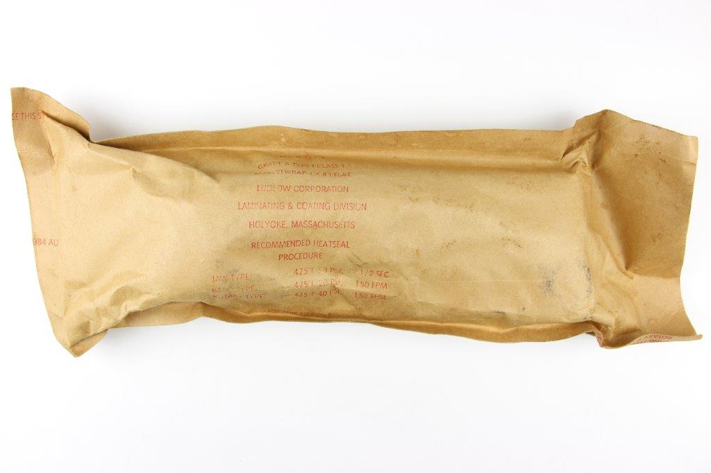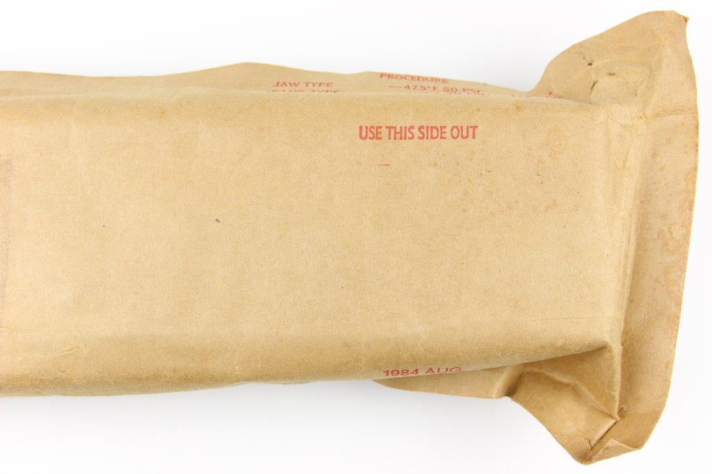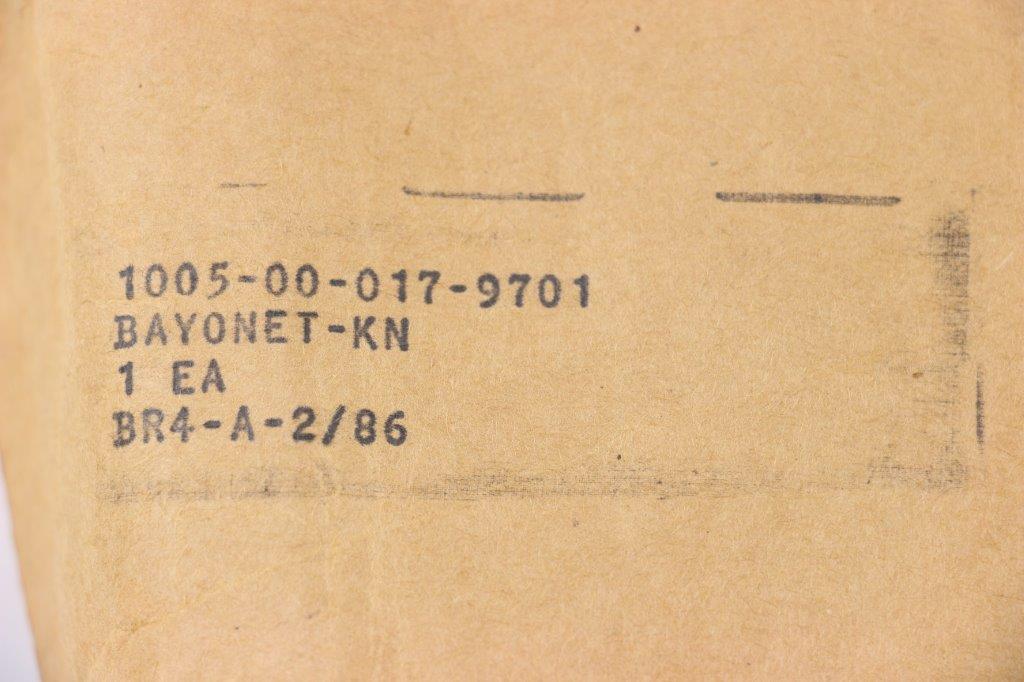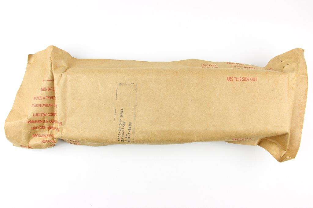 3/4/24 – This is an original US M7 Bayonet, most commonly used with M16 rifles by the US Military. This example comes in the original military wrapping / packaging. Unopened and ink stamped 1984 August with a pack date of 2/86. Excellent, unissued condition. Based on a “feel test”, this package contains a bayonet, scabbard, and box.