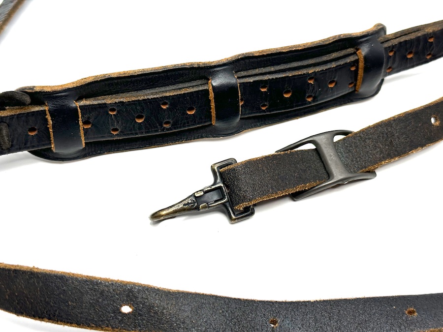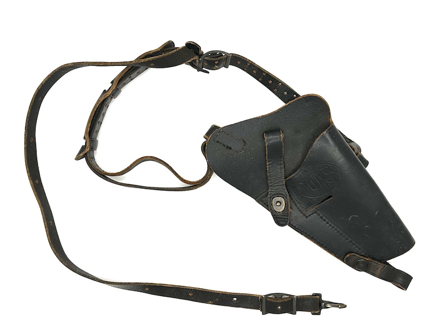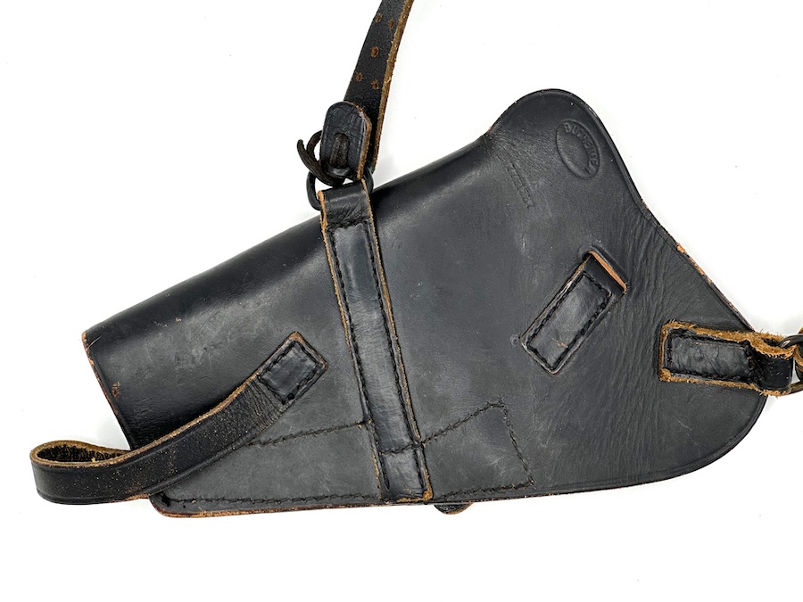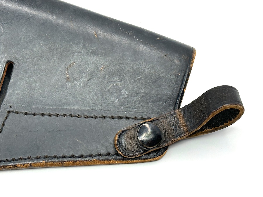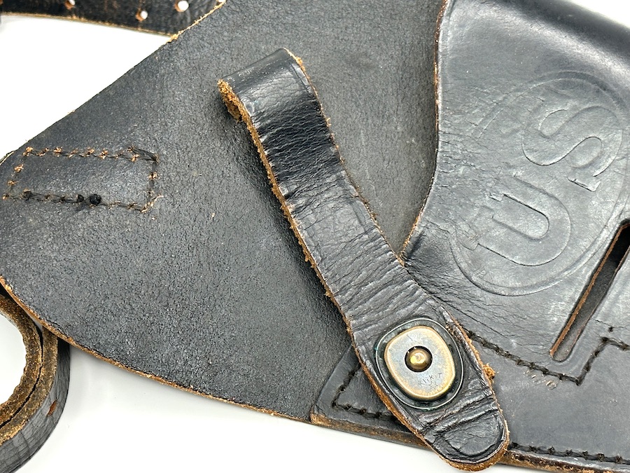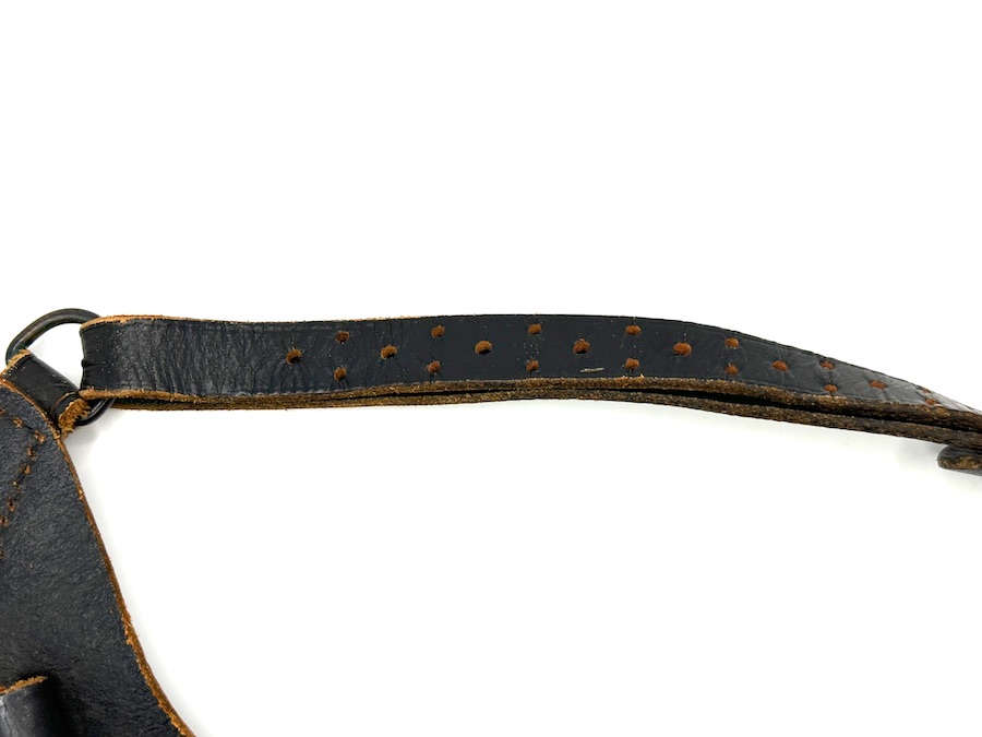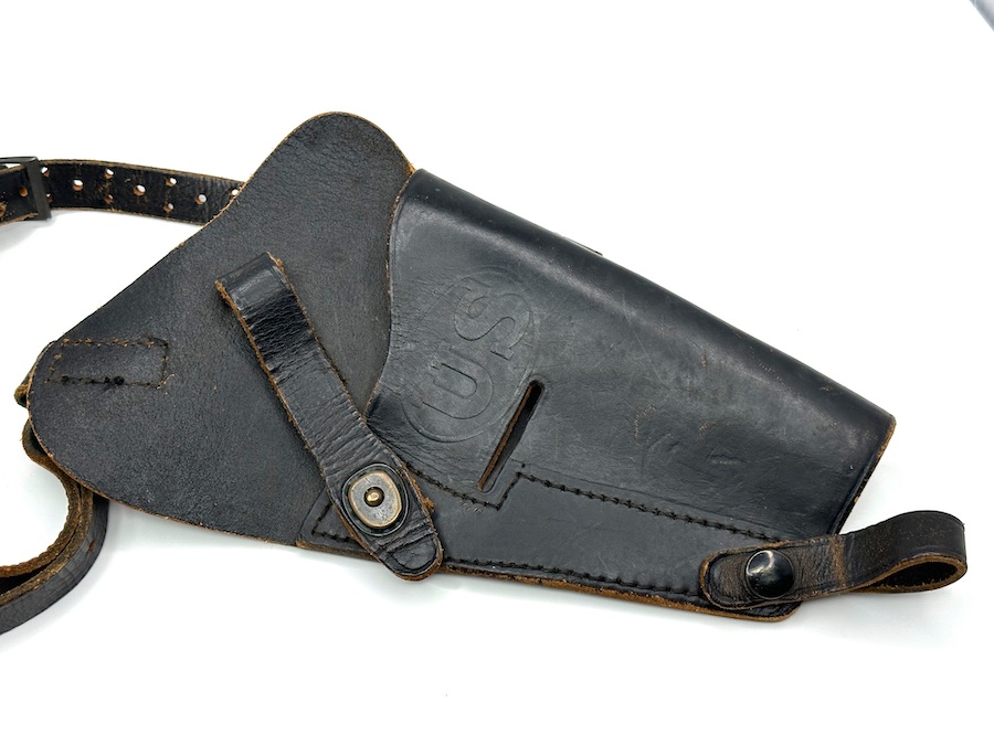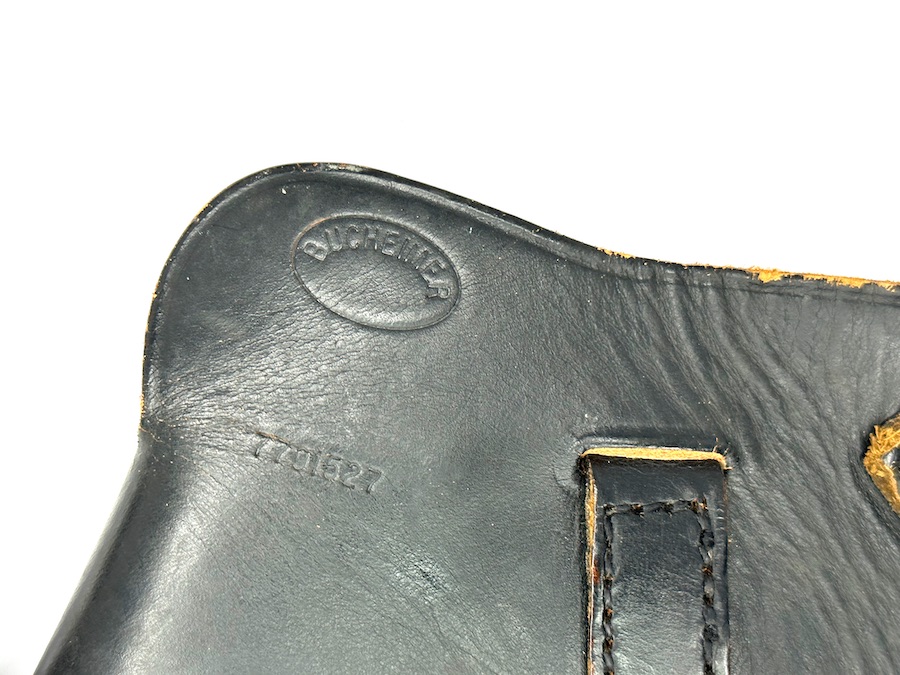4/10/23 – US M7 Shoulder Holster. The leather on this holster retains most of its original look only showing minimal wear. Stitching all around is very solid and factory original. The shoulder strap has all of the necessary hardware for proper function. Stamped marking is a circle with the name BUCHEIMER and a batch number 7791527.