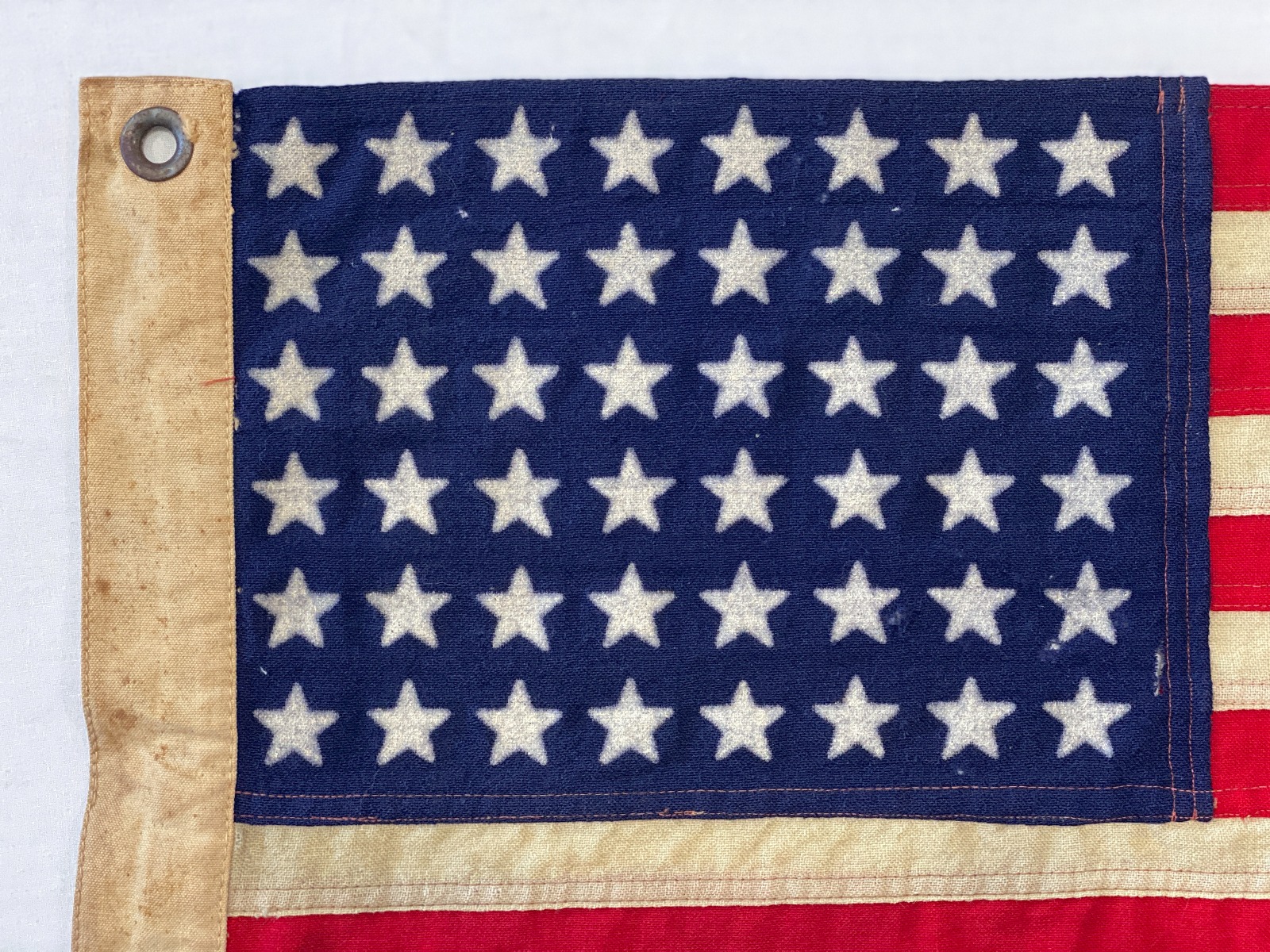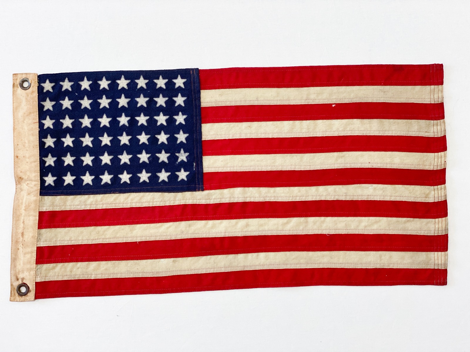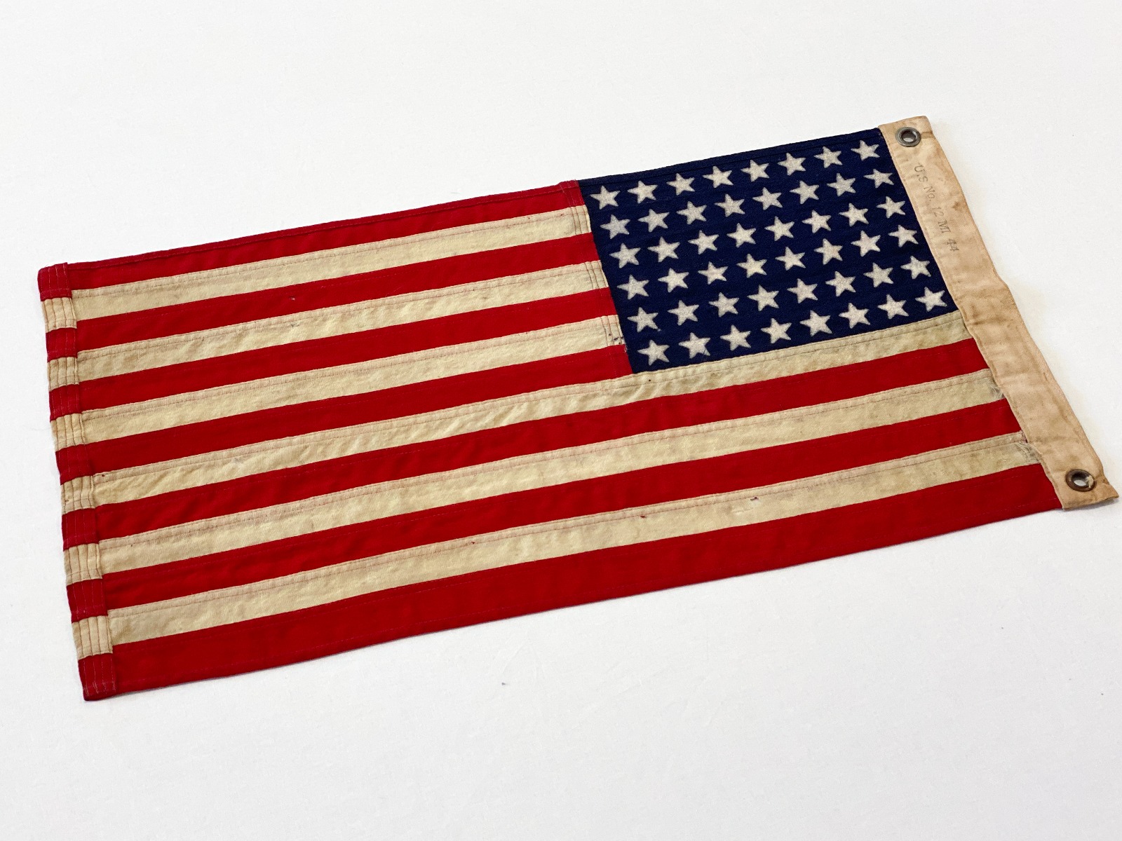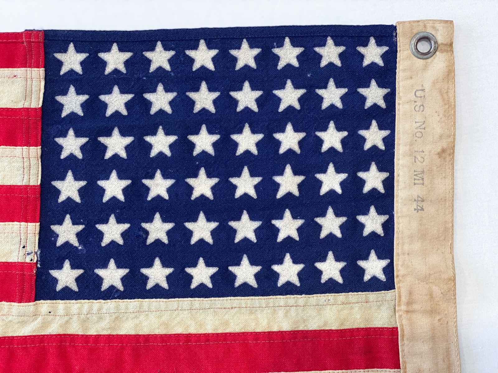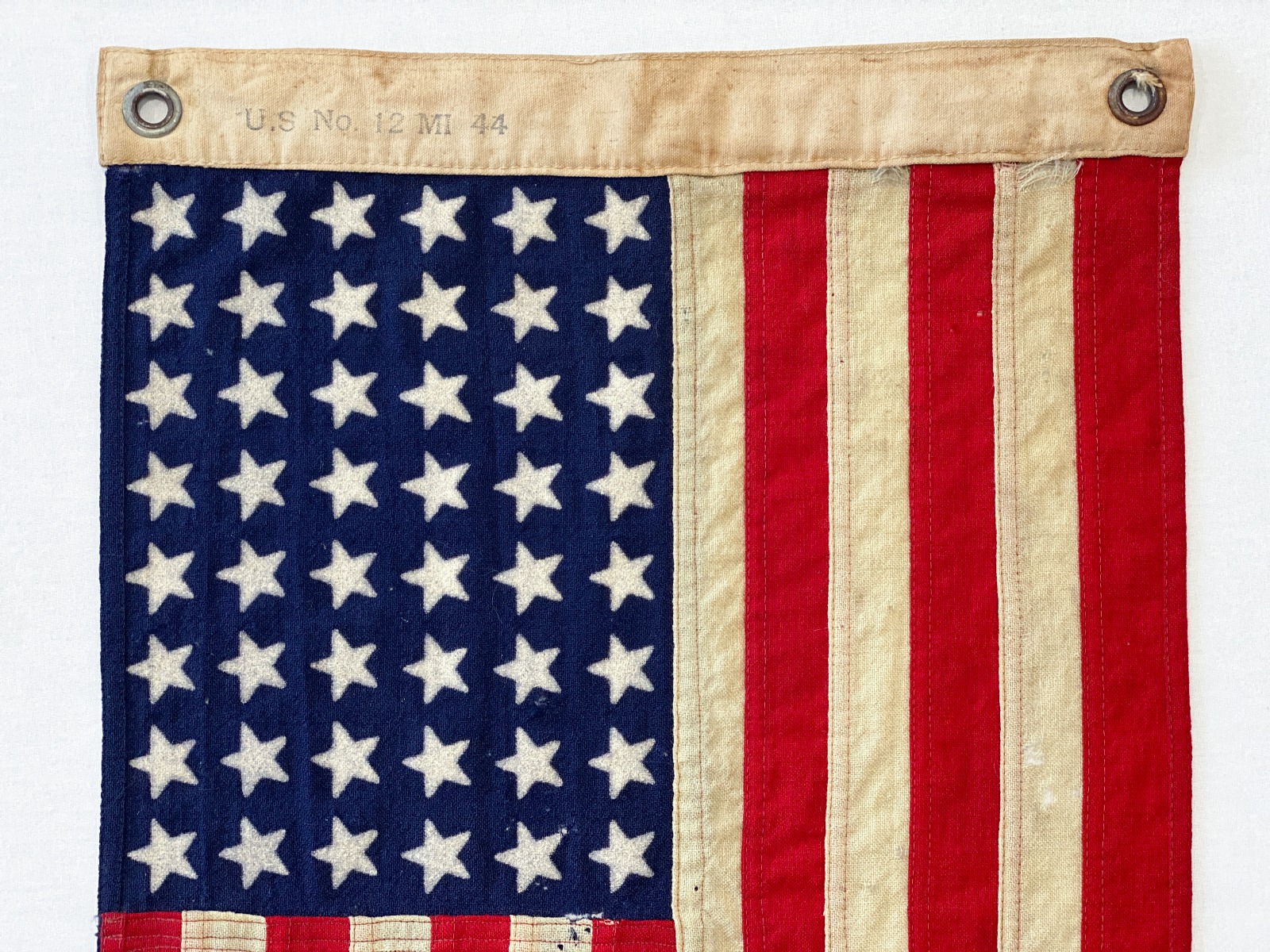 5/12/21 – This is an original US Mare Island flag. The flag is a No. 12, which is the smallest configuration of the U.S. Ensign flags made for the the navy during WW2. The smaller size makes this a great candidate for framing and display. These would have been flown on smaller Navy boats. The flag is 31×16 inches. The header / seam is marked “U.S. No. 12 MI 44”. Some mild yellowing but no major issues.